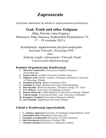 Zaproszenie Uprzejmie zapraszamy do udziału w międzynarodowej konferencji: God, Truth and other Enigmas (Bóg, Prawda i inne Enigmy) Warszawa, Pałac Staszica, Krakowskie Przedmieście 72, 17 – 19 września 2013 r. Konferencja organizowana jest pod auspicjami: Instytutu Filozofii i Socjologii PAN oraz Zakładu Logiki, Informatyki i Filozofii Nauki Uniwersytetu Białostockiego Komitet Organizacyjny Konferencji: 1. Miroslaw Szatkowski (University of Munich, Germany) – przewodniczący 2. Sergio Galvan (Catholic University in Milan, Italy) 3. Zbigniew Król (Polish Academy of Sciences and Warsaw University of Technology, Poland) 4. Jonathan Kvanvig (Baylor University, USA) 5. Jonathan E. Lowe (Durham University, United Kingdom) 6. Bob Maydole (Professor Emeritus, Davidson College, NC, USA) 7. Uwe Meixner (University of Augsburg, Germany) 8. Roman Murawski (Adam Mickiewicz University in Poznań, Poland) 9. Gabriel Sandu (Université de Paris 1 and University of Helsinki) 10. Kazimierz Trzęsicki (University of Białystok, Poland) 11. Jan Woleński (Jagiellonian University, Poland) Udział w Konferencji zapowiedzieli: 1. 2. 3. 4. 5. C. Anthony Anderson (University of California at Santa Barbara, USA) Christopher Daly (Manchester University, UK) Stamatios Gerogiorgakis (University of Erfurt, Germany) John Hawthorne (University of Oxford, UK) Christian Kanzian (University of Innsbruck, Austria) 6. Srecko Kovac (University of Zagreb, Croatia) 7. Jonathan Kvanvig (Baylor University, USA) 8. E. J. Lowe (Duhram University, UK) 9. Uwe Meixner (University of Ausburg, Germany) 10. Kevin Mulligan (University of Genova, Italy) 11. Elisa Paganini (University of Milan, Italy) 12. Duncan Pritchard (University of Edinburgh, Scotland, UK) 13. Alexander Pruss (Baylor University, USA) 14. Gabriel Sandu (Université de Paris 1 and University of Helsinki) 15. Scott Shalkowski (University of Leeds, UK) 16. Peter Simons (University of Dublin, Ireland) 17. Christian Tapp, University of Bochum, Germany 18. Peter van Inwagen (The University of Notre Dame, USA) 19. Paul Weingartner (University of Salzburg, Austria) 20. Jan Woleński (Jagiellonian University, Cracow, Poland) Dla informacji: [email protected] Strona internetowa Konferencji ukaże się w terminie późniejszym. Mirosław Szatkowski (przewodniczący Komitetu Organizacyjnego Konferencji)
