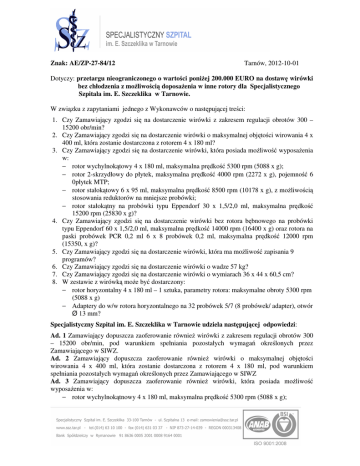 Znak: AE/ZP-27-84/12 Tarnów, 2012-10-01 Dotyczy: przetargu nieograniczonego o wartości poniżej 200.000 EURO na dostawę wirówki bez chłodzenia z możliwością doposażenia w inne rotory dla Specjalistycznego Szpitala im. E. Szczeklika w Tarnowie. W związku z zapytaniami jednego z Wykonawców o następującej treści: 1. Czy Zamawiający zgodzi się na dostarczenie wirówki z zakresem regulacji obrotów 300 – 15200 obr/min? 2. Czy Zamawiający zgodzi się na dostarczenie wirówki o maksymalnej objętości wirowania 4 x 400 ml, która zostanie dostarczona z rotorem 4 x 180 ml? 3. Czy Zamawiający zgodzi się na dostarczenie wirówki, która posiada możliwość wyposażenia w: − rotor wychylnokątowy 4 x 180 ml, maksymalna prędkość 5300 rpm (5088 x g); − rotor 2-skrzydłowy do płytek, maksymalna prędkość 4000 rpm (2272 x g), pojemność 6 0płytek MTP; − rotor stałokątowy 6 x 95 ml, maksymalna prędkość 8500 rpm (10178 x g), z możliwością stosowania reduktorów na mniejsze probówki; − rotor stałokątny na probówki typu Eppendorf 30 x 1,5/2,0 ml, maksymalna prędkość 15200 rpm (25830 x g)? 4. Czy Zamawiający zgodzi się na dostarczenie wirówki bez rotora bębnowego na probówki typu Eppendorf 60 x 1,5/2,0 ml, maksymalna prędkość 14000 rpm (16400 x g) oraz rotora na paski probówek PCR 0,2 ml 6 x 8 probówek 0,2 ml, maksymalna prędkość 12000 rpm (15350, x g)? 5. Czy Zamawiający zgodzi się na dostarczenie wirówki, która ma możliwość zapisania 9 programów? 6. Czy Zamawiający zgodzi się na dostarczenie wirówki o wadze 57 kg? 7. Czy Zamawiający zgodzi się na dostarczenie wirówki o wymiarach 36 x 44 x 60,5 cm? 8. W zestawie z wirówką może być dostarczony: − rotor horyzontalny 4 x 180 ml – 1 sztuka, parametry rotora: maksymalne obroty 5300 rpm (5088 x g) − Adaptery do w/w rotora horyzontalnego na 32 probówek 5/7 (8 probówek/ adapter), otwór Ø 13 mm? Specjalistyczny Szpital im. E. Szczeklika w Tarnowie udziela następującej odpowiedzi: Ad. 1 Zamawiający dopuszcza zaoferowanie również wirówki z zakresem regulacji obrotów 300 – 15200 obr/min, pod warunkiem spełniania pozostałych wymagań określonych przez Zamawiającego w SIWZ. Ad. 2 Zamawiający dopuszcza zaoferowanie również wirówki o maksymalnej objętości wirowania 4 x 400 ml, która zostanie dostarczona z rotorem 4 x 180 ml, pod warunkiem spełniania pozostałych wymagań określonych przez Zamawiającego w SIWZ Ad. 3 Zamawiający dopuszcza zaoferowanie również wirówki, która posiada możliwość wyposażenia w: − rotor wychylnokątnowy 4 x 180 ml, maksymalna prędkość 5300 rpm (5088 x g); − rotor 2-skrzydłowy do płytek, maksymalna prędkość 4000 rpm (2272 x g), pojemność 6 płytek MTP; − rotor stałokątowy 6 x 95 ml, maksymalna prędkość 8500 rpm (10178 x g), z możliwością stosowania reduktorów na mniejsze probówki; − rotor stałokątowy na probówki typu Eppendorf 30 x 1,5/2,0 ml, maksymalna prędkość 15200 rpm (25830 x g) pod warunkiem spełniania pozostałych wymagań określonych przez Zamawiającego w SIWZ Ad. 4 Zamawiający dopuszcza zaoferowanie również wirówki bez rotora bębnowego na probówki typu Eppendorf 60 x 1,5/2,0 ml, maksymalna prędkość 14000 rpm (16400 x g) oraz rotora na paski probówek PCR 0,2 ml 6 x 8 probówek 0,2 ml, maksymalna prędkość 12000 rpm (15350, x g), pod warunkiem spełniania pozostałych wymagań określonych przez Zamawiającego w SIWZ Ad. 5 Zamawiający dopuszcza zaoferowanie również wirówki, która ma możliwość zapisania 9 programów, pod warunkiem spełniania pozostałych wymagań określonych przez Zamawiającego w SIWZ Ad. 6 Zamawiający dopuszcza zaoferowanie również wirówki o wadze 57 kg, pod warunkiem spełniania pozostałych wymagań określonych przez Zamawiającego w SIWZ. Ad. 7 Zamawiający dopuszcza zaoferowanie również wirówki o wymiarach: wysokość 36 x szerokość 44 x głębokość 60,5 cm, pod warunkiem spełniania pozostałych wymagań określonych przez Zamawiającego w SIWZ. Ad. 8 Zamawiający dopuszcza zaoferowanie również wirówki, która będzie dostarczona z: − rotorem horyzontalnym 4 x 180 ml – 1 sztuka, parametry rotora: maksymalne obroty 5300 rpm (5088 x g) − adapterami do w/w rotora horyzontalnego na 32 probówek 5 - 7 ml (8 probówek/ adapter), otwór Ø 13 mm pod warunkiem spełniania pozostałych wymagań określonych przez Zamawiającego w SIWZ. Otrzymują: 1. Wykonawcy, którym Zamawiający przekazał SIWZ 2. Strona internetowa Zamawiającego 3. a/a