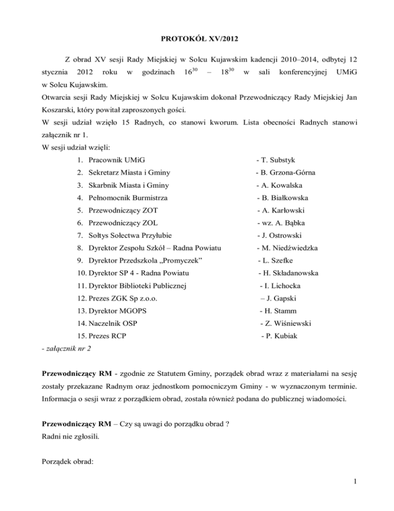 1 PROTOKÓŁ XV/2012 Z obrad XV sesji Rady Miejskiej w Solcu