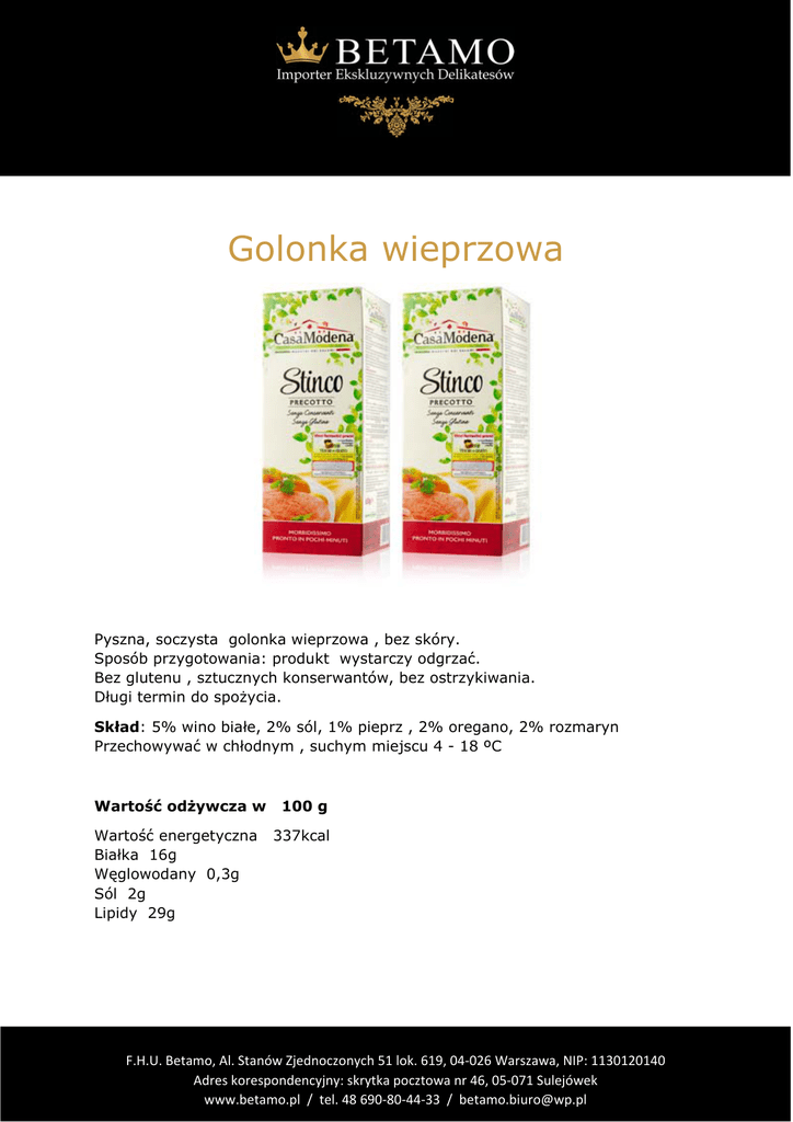 Golonka wieprzowa Pyszna, soczysta golonka wieprzowa , bez skóry. Sposób przygotowania: produkt wystarczy odgrzać. Bez glutenu , sztucznych konserwantów, bez ostrzykiwania. Długi termin do spożycia. Skład: 5% wino białe, 2% sól, 1% pieprz , 2% oregano, 2% rozmaryn Przechowywać w chłodnym , suchym miejscu 4 - 18 ºC Wartość odżywcza w Wartość energetyczna Białka 16g Węglowodany 0,3g Sól 2g Lipidy 29g 100 g 337kcal F.H.U. Betamo, Al. Stanów Zjednoczonych 51 lok. 619, 04‐026 Warszawa, NIP: 1130120140 Adres korespondencyjny: skrytka pocztowa nr 46, 05‐071 Sulejówek www.betamo.pl / tel. 48 690‐80‐44‐33 / [email protected]