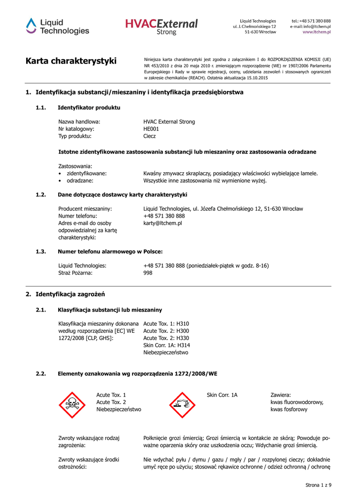 Karta charakterystyki Niniejsza karta charakterystyki jest zgodna z załącznikiem I do ROZPORZĄDZENIA KOMISJI (UE) NR 453/2010 z dnia 20 maja 2010 r. zmieniającym rozporządzenie (WE) nr 1907/2006 Parlamentu Europejskiego i Rady w sprawie rejestracji, oceny, udzielania zezwoleń i stosowanych ograniczeń w zakresie chemikaliów (REACH). Ostatnia aktualizacja 15.10.2015 1. Identyfikacja substancji/mieszaniny i identyfikacja przedsiębiorstwa 1.1. Identyfikator produktu Nazwa handlowa: Nr katalogowy: Typ produktu: HVAC External Strong HE001 Ciecz Istotne zidentyfikowane zastosowania substancji lub mieszaniny oraz zastosowania odradzane Zastosowania: • zidentyfikowane: • odradzane: 1.2. Dane dotyczące dostawcy karty charakterystyki Producent mieszaniny: Numer telefonu: Adres e-mail do osoby odpowiedzialnej za kartę charakterystyki: 1.3. Kwaśny zmywacz skraplaczy, posiadający właściwości wybielające lamele. Wszystkie inne zastosowania niż wymienione wyżej. Liquid Technologies, ul. Józefa Chełmońskiego 12, 51-630 Wrocław +48 571 380 888 [email protected] Numer telefonu alarmowego w Polsce: Liquid Technologies: Straż Pożarna: +48 571 380 888 (poniedziałek-piątek w godz. 8-16) 998 2. Identyfikacja zagrożeń 2.1. Klasyfikacja substancji lub mieszaniny Klasyfikacja mieszaniny dokonana Acute Tox. 1: H310 według rozporządzenia [EC] WE Acute Tox. 2: H300 1272/2008 [CLP, GHS]: Acute Tox. 2: H330 Skin Corr. 1A: H314 Niebezpieczeństwo 2.2. Elementy oznakowania wg rozporządzenia 1272/2008/WE Acute Tox. 1 Acute Tox. 2 Niebezpieczeństwo Skin Corr. 1A Zawiera: kwas fluorowodorowy, kwas fosforowy Zwroty wskazujące rodzaj zagrożenia: Połknięcie grozi śmiercią; Grozi śmiercią w kontakcie ze skórą; Powoduje poważne oparzenia skóry oraz uszkodzenia oczu; Wdychanie grozi śmiercią. Zwroty wskazujące środki ostrożności: Nie wdychać pyłu / dymu / gazu / mgły / par / rozpylonej cieczy; dokładnie umyć ręce po użyciu; stosować rękawice ochronne / odzież ochronną / ochronę Strona 1 z 9 oczu / ochronę twarzy; stosować indywidualne środki ochrony dróg oddechowych. W przypadku dostania się na skórę: delikatnie umyć dużą ilością wody z mydłem. W przypadku dostania się do oczu: ostrożnie płukać wodą przez kilka minut. Wyjąć soczewki kontaktowe, jeżeli są i można je łatwo usunąć. Nadal płukać; natychmiast skontaktować się z Ośrodkiem Zatruć lub lekarzem. 3. Skład/informacja o składnikach 3.1. Mieszanina Nazwa składnika Identyfikatory % Klasyfikacja wg rozporządzenia 1272/2008/WE (CLP) Kwas fluorowodorowy WE: 231-634-8 CAS: 7664-39-3 Indeks: 009003-00-1 10-30% Acute Tox. 2 (*) H330 Acute Tox. 1 H310 Acute Tox. 2 (*) H300 Skin Corr. 1A H314 Kwas ortofosforowy (V) WE: 231-633-2 CAS: 7664-38-2 Indeks: 015011-00-6 5-15% Skin Corr. 1B H314 2-butoksyetanol WE: 203-961-6 CAS: 112-34-5 Indeks: 585580-06-X <5% Acute Tox. 4 (*) H332 Acute Tox. 4 (*) H312 Acute Tox. 4 (*) H302 Eye Irrit. 2 H319 Skin Irrit. 2 H315 W mieszaninie nie ma dodatkowych składników, które według obecnej wiedzy są sklasyfikowane i przyczyniają się do klasyfikacji substancji. W związku z tym nie wymagają ich podania w tej sekcji. Mieszanina nie zawiera składników, które w świetle obecnej wiedzy producenta oraz w danym stężeniu są klasyfikowane jako PBT lub vPvB. Uwaga! Najwyższe dopuszczalne stężenia, jeśli są dostępne, wymienione są w sekcji 8. W sekcji 16 podano znaczenie zwrotów R, H oraz symboli ostrzegawczych i kategorii oraz klas zagrożenia. 4. Środki pierwszej pomocy 4.1. Opis środków pierwszej pomocy Kontakt z oczami: Należy przepłukać oczy dużą ilością wody przy odchylonej powiece przez 5 minut, a następnie kolejne 5 minut 1% roztworem glukonianu wapnia. W przypadku narażenia tylko jednego oka, chronić oko nienarażone. Należy niezwłocznie zasięgnąć porady okulisty. Wdychanie: W przypadku narażenia dróg oddechowych na działanie kwasu fluorowodorowego należy przenieść lub wyprowadzić osobę narażoną na świeże powietrze. Należy zapewnić osobie narażonej ciepło i spokój. W przypadku utraty przytomności udrożnić drogi oddechowe i ułożyć w pozycji bocznej ustalonej. Po narażeniu należy natychmiast wezwać lekarza. Osobie poszkodowanej podać wziewnie za pomocą atomizera 3% roztwór glukonianu wapnia. Należy obserwować osobę narażoną pod kątem objawów obrzęku płuc. W przypadku, gdy dostępny jest odpowiedni sprzęt i przeszkolony personel, należy podać tlen. Strona 2 z 9 4.2. Kontakt ze skórą: Narażone miejsce należy przemyć dużą ilością wody. Jeśli to możliwe, to odzież zanieczyszczoną produktem należy niezwłocznie usunąć. Narażoną skórę po przemyciu bezzwłocznie natrzeć 5% roztworem glukonianu wapnia lub żelem glukonianu wapnia. Przy nacieraniu stosować rękawice ochronne w celu uniknięcia narażenia. Należy natychmiast wezwać lekarza. Spożycie: Po połknięciu mieszaniny należy przepłukać jamę ustną i obficie popić wodą. Zastosować środek przeczyszczający – siarczan sodu – ¼ łyżki na 250 ml wody. Nie należy próbować zobojętniania. Nie wywoływać wymiotów i natychmiast wezwać lekarza. Ochrona osób udzielających pierwszej pomocy: Przed udzieleniem pierwszej pomocy osoby narażonej należy upewnić się, że jest możliwe jej bezpieczne przeniesienie z miejsca ekspozycji. W przypadku dalszego występowania źródła ekspozycji należy zastosować środki ochrony indywidualnej, wymienione w sekcji 8. Najważniejsze ostre i opóźnione objawy oraz skutki narażenia Objawy i skutki narażenia na mieszaninę mogą pojawić się z opóźnieniem. Objawy ostrego narażenia na mieszaninę: Kontakt z oczami: Narażenie oczu na kwas fluorowodorowy może powodować zaczerwienienie, ból, zaburzenia widzenia i trwałe uszkodzenia. Wdychanie: Kwas fluorowodorowy zawarty w mieszaninie działa silnie drażniąco na drogi oddechowe, a ekspozycja moż