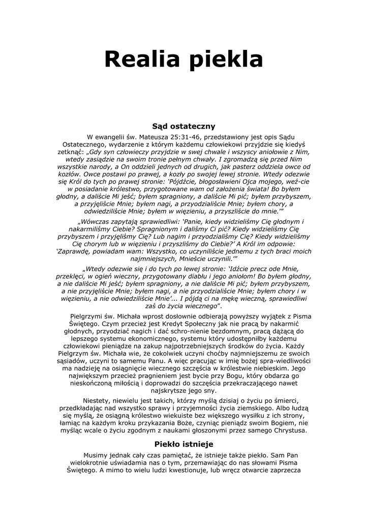 Realia piekla Sąd ostateczny W ewangelii św. Mateusza 25:31-46, przedstawiony jest opis Sądu Ostatecznego, wydarzenie z którym kaŜdemu człowiekowi przyjdzie się kiedyś zetknąć: „Gdy syn człowieczy przyjdzie w swej chwale i wszyscy aniołowie z Nim, wtedy zasiądzie na swoim tronie pełnym chwały. I zgromadzą się przed Nim wszystkie narody, a On oddzieli jednych od drugich, jak pasterz oddziela owce od kozłów. Owce postawi po prawej, a kozły po swojej lewej stronie. Wtedy odezwie się Król do tych po prawej stronie: ‘Pójdźcie, błogosławieni Ojca mojego, weź-cie w posiadanie królestwo, przygotowane wam od załoŜenia świata! Bo byłem głodny, a daliście Mi jeść; byłem spragniony, a daliście Mi pić; byłem przybyszem, a przyjęliście Mnie; byłem nagi, a przyodzialiście Mnie; byłem chory, a odwiedziliście Mnie; byłem w więzieniu, a przyszliście do mnie.’” „Wówczas zapytają sprawiedliwi: ‘Panie, kiedy widzieliśmy Cię głodnym i nakarmiliśmy Ciebie? Spragnionym i daliśmy Ci pić? Kiedy widzieliśmy Cię przybyszem i przyjęliśmy Cię? Lub nagim i przyodzialiśmy Cię? Kiedy widzieliśmy Cię chorym lub w więzieniu i przyszliśmy do Ciebie?’ A Król im odpowie: ‘Zaprawdę, powiadam wam: Wszystko, co uczyniliście jednemu z tych braci moich najmniejszych, Mnieście uczynili.’” „Wtedy odezwie się i do tych po lewej stronie: ‘Idźcie precz ode Mnie, przeklęci, w ogień wieczny, przygotowany diabłu i jego aniołom! Bo byłem głodny, a nie daliście Mi jeść; byłem spragniony, a nie daliście Mi pić; byłem przybyszem, a nie przyjęliście Mnie; byłem nagi, a nie przyodzialiście Mnie; byłem chory i w więzieniu, a nie odwiedziliście Mnie’... I pójdą ci na mękę wieczną, sprawiedliwi zaś do Ŝycia wiecznego”. Pielgrzymi św. Michała wprost dosłownie odbierają powyŜszy wyjątek z Pisma Świętego. Czym przecieŜ jest Kredyt Społeczny jak nie pracą by nakarmić głodnych, przyodziać nagich i dać schro-nienie bezdomnym, pracą dąŜącą do lepszego systemu ekonomicznego, systemu który udostępniłby kaŜdemu człowiekowi pieniądze na zakup najpotrzebniejszych środków do Ŝycia. KaŜdy Pielgrzym św. Michała wie, Ŝe cokolwiek uczyni choćby najmniejszemu ze swoich sąsiadów, uczyni to samemu Panu. A więc pracując w imię boŜej spra-wiedliwości ma nadzieję na osiągnięcie wiecznego szczęścia w królestwie niebieskim. Jego największym przecieŜ pragnieniem jest bycie przy Bogu, który obdarza go nieskończoną miłością i doprowadzi do szczęścia przekraczającego nawet najskrytsze jego sny. Niestety, niewielu jest takich, którzy myślą dzisiaj o Ŝyciu po śmierci, przedkładając nad wszystko sprawy i przyjemności Ŝycia ziemskiego. Albo łudzą się myślą, Ŝe osiągną królestwo wiekuiste bez większego wysiłku z ich strony, łamiąc na kaŜdym kroku przykazania BoŜe, czyniąc pieniądz swoim Bogiem, nie myśląc wcale o Ŝyciu zgodnym z naukami głoszonymi przez samego Chrystusa. Piekło istnieje Musimy jednak cały czas pamiętać, Ŝe istnieje takŜe piekło. Sam Pan wielokrotnie uświadamia nas o tym, przemawiając do nas słowami Pisma Świętego. A mimo to wielu ludzi kwestionuje, lub wręcz otwarcie zaprzecza istnieniu piekła. Piekło jednak istnieje! Kościół katolicki naucza, Ŝe jeśli dusza odejdzie z tego świata w stanie grzechu śmiertelnego bez poczucia jakiejkolwiek winy i Ŝalu, juŜ na zawsze zostanie skazana na piekło. W swojej ksiąŜce pod tytułem „Przekroczyć próg nadziei”, PapieŜ Jan Paweł II tak powiedział na temat Rzeczy Ostatecznych i istnienia piekła: „Jeszcze w niezbyt odległych czasach, w kazaniach rekolekcyjnych czy misyjnych, sprawy ostateczne stanowiły zawsze nienaruszalny punkt programu rozwaŜań i kaznodzieje umieli na ten temat mówić w sposób obrazowy i sugestywny. IluŜ ludzi te kazania i nauki o sprawach ostatecznych skłoniły do nawrócenia, do spowiedzi!” „Czy moŜe Bóg, który tak umiłował człowieka, zgodzić się na to, aby tenŜe Go odrzucił i przez to został skazany na męki wieczne? A jednak słowa Chrystusa są jednoznaczne. U Mateusza wyraźnie mówi o tych, którzy pójdą na męki wieczne (por. 25, 46)... Równocześnie jest jednak coś takiego w samej ludzkiej świadomości moralnej, co broni się przed utratą tej perspektywy: czy Bóg, który jest miłością, nie jest takŜe ostateczną sprawiedliwością? Czy moŜe się zgodzić na te straszliwe zbrodnie, czy mogą one przejść bezkarnie?... Czy piekło nie jest poniekąd ostatnią ‘deską ratunku’ dla sumienia moralnego człowieka?” Nic nie zaszkodzi od czasu do czasu porozwaŜać na temat horroru i wieczności piekła, aby bardziej efektywnie przeciwstawiać się grzechowi i utrzymać się na wąskiej drodze prowadzącej do wiecznego królestwa w niebie. PoniŜej przedstawiamy poświęcone tej tematyce wyjątki z ksiąŜki św. Alfonsa de Liguori zatytułowanej „Przygoto-wanie do śmierci”. Podtytuły pochodzą od redakcji. Melvin Sickler Św. Alfons Maria de Liguori Nasza wiara mówi nam, Ŝe piekło istnieje. Gdzieś w środku Ziemi istnieje więzienie, w którym karę odbywają buntownicy przeciwko Bogu. Czym jest piekło? Miejscem kaźni dla potępionych. Miejscem kaźni, gdzie wszystkie zmysły i moce potępionych dostąpią odpowiednich im tortur, gdzie im bardziej ktoś obraził Boga jakimkolwiek zmysłem, tym bardziej ten zmysł będzie torturowany. Wieczne ciemności Wzrok będzie torturowany ciemnościami. JakŜe Ŝałośnie czułby się człowiek uwięziony w ciemnej jaskini na czterdzieści czy pięćdziesiąt lat, a moŜe nawet na całe swoje Ŝycie. Piekło jest lochem szczelnie zamkniętym ze wszystkich swoich stron tak, Ŝe ani jeden promyk słońca, ani Ŝadne inne światło nigdy tam nie dotrze. Ogień ziemski promieniuje jasnością, ale ogień piekielny jest całkowicie pozbawiony blasku. Tłumacząc to zjawi