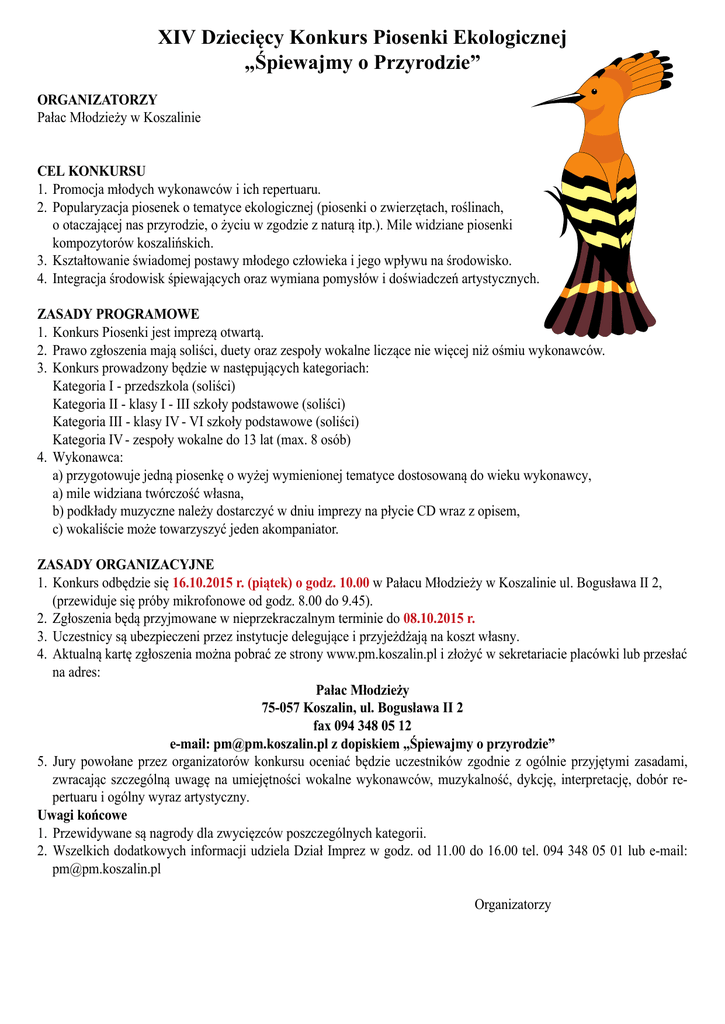 XIV Dziecięcy Konkurs Piosenki Ekologicznej „Śpiewajmy o Przyrodzie” ORGANIZATORZY Pałac Młodzieży w Koszalinie CEL KONKURSU 1. Promocja młodych wykonawców i ich repertuaru. 2. Popularyzacja piosenek o tematyce ekologicznej (piosenki o zwierzętach, roślinach, o otaczającej nas przyrodzie, o życiu w zgodzie z naturą itp.). Mile widziane piosenki kompozytorów koszalińskich. 3. Kształtowanie świadomej postawy młodego człowieka i jego wpływu na środowisko. 4. Integracja środowisk śpiewających oraz wymiana pomysłów i doświadczeń artystycznych. ZASADY PROGRAMOWE 1. Konkurs Piosenki jest imprezą otwartą. 2. Prawo zgłoszenia mają soliści, duety oraz zespoły wokalne liczące nie więcej niż ośmiu wykonawców. 3. Konkurs prowadzony będzie w następujących kategoriach: Kategoria I - przedszkola (soliści) Kategoria II - klasy I - III szkoły podstawowe (soliści) Kategoria III - klasy IV - VI szkoły podstawowe (soliści) Kategoria IV - zespoły wokalne do 13 lat (max. 8 osób) 4. Wykonawca: a) przygotowuje jedną piosenkę o wyżej wymienionej tematyce dostosowaną do wieku wykonawcy, a) mile widziana twórczość własna, b) podkłady muzyczne należy dostarczyć w dniu imprezy na płycie CD wraz z opisem, c) wokaliście może towarzyszyć jeden akompaniator. ZASADY ORGANIZACYJNE 1. Konkurs odbędzie się 16.10.2015 r. (piątek) o godz. 10.00 w Pałacu Młodzieży w Koszalinie ul. Bogusława II 2, (przewiduje się próby mikrofonowe od godz. 8.00 do 9.45). 2. Zgłoszenia będą przyjmowane w nieprzekraczalnym terminie do 08.10.2015 r. 3. Uczestnicy są ubezpieczeni przez instytucje delegujące i przyjeżdżają na koszt własny. 4. Aktualną kartę zgłoszenia można pobrać ze strony www.pm.koszalin.pl i złożyć w sekretariacie placówki lub przesłać na adres: Pałac Młodzieży 75-057 Koszalin, ul. Bogusława II 2 fax 094 348 05 12 e-mail: [email protected] z dopiskiem „Śpiewajmy o przyrodzie” 5. Jury powołane przez organizatorów konkursu oceniać będzie uczestników zgodnie z ogólnie przyjętymi zasadami, zwracając szczególną uwagę na umiejętności wokalne wykonawców, muzykalność, dykcję, interpretację, dobór repertuaru i ogólny wyraz artystyczny. Uwagi końcowe 1. Przewidywane są nagrody dla zwycięzców poszczególnych kategorii. 2. Wszelkich dodatkowych informacji udziela Dział Imprez w godz. od 11.00 do 16.00 tel. 094 348 05 01 lub e-mail: [email protected] Organizatorzy