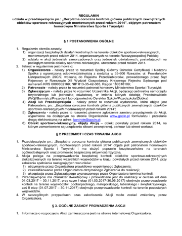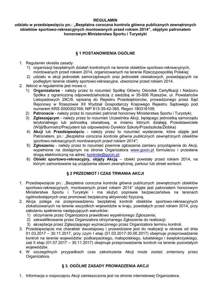 REGULAMIN udziału w przedsięwzięciu pn.: „Bezpłatna coroczna kontrola główna publicznych zewnętrznych obiektów sportowo-rekreacyjnych montowanych przed rokiem 2014”, objętym patronatem honorowym Ministerstwa Sportu i Turystyki § 1 POSTANOWIENIA OGÓLNE 1. Regulamin określa zasady: 1) organizacji bezpłatnych działań kontrolnych na terenie obiektów sportowo-rekreacyjnych, montowanych przed rokiem 2014, organizowanych na terenie Rzeczypospolitej Polskiej; 2) udziału w akcji jednostek samorządowych oraz jednostek oświatowych, posiadających na podległym terenie obiekty sportowo-rekreacyjne, utworzone przed rokiem 2014. 2. Ilekroć w regulaminie jest mowa o: 1) Organizatorze - należy przez to rozumieć Spółkę Główny Ośrodek Certyfikacji i Nadzoru Spółka z ograniczoną odpowiedzialnością z siedzibą w 35-606 Rzeszów, ul. Powstańców Listopadowych 29C/9, wpisaną do Rejestru Przedsiębiorców, prowadzonego przez Sąd Rejonowy w Rzeszowie XII Wydział Gospodarczy Krajowego Rejestru Sądowego pod numerem KRS 0000302169; NIP 813-35-42-365, Regon 180316109; 2) Patronacie - należy przez to rozumieć patronat honorowy Ministerstwa Sportu i Turystyki; 3) Zgłaszającym - należy przez to rozumieć Uczestnika Akcji, będącego jednostką samorządu terytorialnego lub jednostką oświatową, w imieniu których działają Przedstawiciele (Wójt/Burmistrz/Prezydent lub odpowiednio Dyrektor Szkoły/Przedszkola/Żłobka) 4) Akcji lub Przedsięwzięciu - należy przez to rozumieć wydarzenie, które objęte jest Patronatem, pn.: „Bezpłatna coroczna kontrola główna publicznych zewnętrznych obiektów sportowo-rekreacyjnych montowanych przed rokiem 2014”; 5) Zgłoszeniu - należy przez to rozumieć pisemne zgłoszenie zamiaru przystąpienia do Akcji, wypełnione na dostępnym na stronie Organizatora www.gocin.pl formularzu i przesłane drogą elektroniczną na adres: [email protected]; 6) Obiekt sportowo-rekreacyjny, objęty Akcją – obiekt powstały przed rokiem 2014, na którym zamontowane są urządzenia siłowni zewnętrznej, parkour lub street workout. § 2 PRZEDMIOT I CZAS TRWANIA AKCJI 1. Przedsięwzięcie pn.: „Bezpłatna coroczna kontrola główna publicznych zewnętrznych obiektów sportowo-rekreacyjnych, montowanych przed rokiem 2014” objęte jest patronatem honorowym Ministerstwa Sportu i Turystyki i ma służyć poprawie bezpieczeństwa na terenach ogólnodostępnych oraz promować bezpieczną aktywność fizyczną. 2. Akcja polega na przeprowadzeniu bezpłatnej kontroli obiektów sportowo-rekreacyjnych zlokalizowanych na terenie wszystkich województw w kraju, powstałych przed rokiem 2014, przy założeniu spełnienia następujących warunków: 1) otrzymanie przez Organizatora prawidłowo wypełnionego Zgłoszenia; 2) zakwalifikowanie przez Organizatora otrzymanego Zgłoszenia do realizacji; 3) akceptacja przez Zgłaszającego wyznaczonego przez Organizatora terminu kontroli. 3. Przedsięwzięcie ma charakter dwuetapowy i przewidziane jest do realizacji w okresie od dnia 01.03.2017 – 30.11.2017, przy czym I etap (01.03.2017-30.06.2017) obejmuje przeprowadzenie kontroli na terenie województw: podkarpackiego, małopolskiego, lubelskiego i świętokrzyskiego, zaś II etap (01.07.2017 – 30.11.2017) obejmuje przeprowadzenie kontroli na terenie pozostałych województw. 4. W szczególnych przypadkach czas zakończenia Akcji może zostać zmieniony przez Organizatora. § 3. OGÓLNE ZASADY PROWADZENIA AKCJI 1. Informacja o rozpoczęciu Akcji zamieszczona jest na stronie internetowej Organizatora. 2. Działania promocyjne związane z organizacją Przedsięwzięcia podejmowane będą sukcesywnie, zarówno w formie poligraficznej (foldery, zaproszenia), jak i podczas konferencji skierowanej do Przedstawicieli samorządów terytorialnych oraz Dyrektorów Szkół, Przedszkoli i Żłobków. 3. Sprawozdanie z przebiegu Akcji zostanie przedłożone do Ministerstwa Sportu i Turystyki w terminie do 30 grudnia 2017 r. § 4. ZASADY UCZESTNICTWA W PRZEDSIĘWZIĘCIU 1. Z wnioskiem o przeprowadzenie kontroli obiektu sportowo-rekreacyjnego, montowanego przed rokiem 2014, występuje Zgłaszający, tj. Przedstawiciel jednostki samorządu terytorialnego lub Dyrektor Szkoły/Przedszkola/Żłobka, który zarządza lub administruje obiektem sportoworekreacyjnym, powstałym przed rokiem 2014. 2. Uczestnictwo w Akcji jest dobrowolne. 3. Warunkiem przystąpienia do Akcji jest wysłanie wypełnionego formularza „Zgłoszenia na przeprowadzenie bezpłatnej corocznej kontroli głównej publicznych zewnętrznych obiektów sportowo-rekreacyjnych, montowanych przed rokiem 2014, objętych patronatem honorowym Ministerstwa Sportu i Turystyki”, zamieszczonego na stronie internetowej Organizatora www.gocin.pl w zakładce Do pobrania. 4. Wypełniony formularz należy przesłać w formie elektronicznej na adres: [email protected]. 5. Otrzymane Zgłoszenia kierowane będą do właściwego merytorycznie pracownika Organizatora, który – w oparciu o przyjęty harmonogram kontroli – potwierdzi oczekiwany przez Zgłaszającego termin jako faktyczny do przeprowadzenia kontroli obiektów lub też wyznaczy nowy, zasadny do jej przeprowadzenia. 6. Potwierdzenie przyjęcia Zgłoszenia do realizacji oraz wskazanie terminu przeprowadzenia kontroli Obiektów sportowo-rekreacyjnych objętych Akcją nastąpi w ciągu 14 dni od dnia otrzymania wniosku. 7. Organizator może wystąpić z wnioskiem pisemnym lub telefonicznym do Zgłaszającego o złożenie dodatkowych wyjaśnień w sprawie otrzymanego Zgłoszenia. W takim przypadku termin, o którym mowa w ust. 6 liczony jest od dnia otrzymania odpowiedzi od Zgłaszającego. 8. Zgłaszający, przystępujący do Akcji, akceptuje treść niniejszego Regulaminu oraz wyraża zgodę na zasady obowiązujące w Akcji. § 5. POSTANOWIENIA KOŃCOWE 1. Zgłaszający, który wziął udział w organizowanym Przedsięwzięciu, zobowiązany jest do umieszczenia