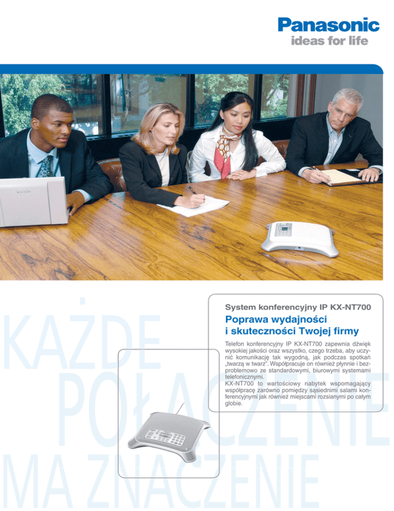 KAŻDE DE System konferencyjny IP KX-NT700 Poprawa wydajności i skuteczności Twojej firmy Telefon konferencyjny IP KX-NT700 zapewnia dźwięk wysokiej jakości oraz wszystko, czego trzeba, aby uczynić komunikację tak wygodną, jak podczas spotkań „twarzą w twarz”. Współpracuje on również płynnie i bezproblemowo ze standardowymi, biurowymi systemami telefonicznymi. KX-NT700 to wartościowy nabytek wspomagający współpracę zarówno pomiędzy sąsiednimi salami konferencyjnymi jak również miejscami rozsianymi po całym globie. POŁĄCZENIE Ą MA ZNACZENIE WYDAJNE WARTOŚCIOWE NIESKOMPLIKOWANE Potrzebujesz bezpośrednich kontaktów, ale wypełnione harmonogramy, goniące terminy oraz zatory uliczne czynią z tego prawdziwe wyzwanie? Biurkowy system konferencyjny IP KX-NT700 może stanowić rozwiązanie tej sytuacji. KX-NT700 został zaprojektowany w celu oszczędzania cennego czasu i środków przedsiębiorstwa oraz łatwego tworzenia połączeń konferencyjnych, o jakości dźwięku bliskiej bezpośrednim spotkaniom uczestników „twarzą w twarz”. Biurkowy system konferencyjny IP KX-NT700 stanowi rozwiązanie spełniające wymagania osób pragnących utrzymywać regularne kontakty ze współpracownikami znajdującymi się w wielu miejscach, zapewniające wysoką jakość dźwięku oraz integrujące się z typowymi aplikacjami biznesowymi. Wiele lokalizacji na spotkaniu KX-NT700 umożliwia prowadzenie 3-stronnych konferencji z innymi biurowymi systemami konferencyjnymi IP oraz integruje się z internetowymi systemami wideokonferencyjnymi. Ktoś spóźnia się na spotkanie i trzeba włączyć go do udziału w konferencji? KX-NT700 obsługuje połączenia ze standardową siecią telefoniczną (PSTN), dzięki czemu dodanie do konferencji połączenia z telefonu komórkowego jest bardzo proste. W trakcie dyskusji konferencyjnej można wzbogacić ją o inne przesyłane do uczestników materiały, takie jak zdjęcia, prezentacje, a nawet pliki wideo. Połączenia konferencyjne są wydajne i skuteczne, tylko kiedy uczestnicy słyszą się z wyraźną, czystą jakością przekazywanego głosu – nawet jeżeli dwie osoby mówią jednocześnie. KX-NT700 zapewnia doskonałą jakość dźwięku przy znakomitym zasięgu mikrofonów. KX-NT700 – GŁÓWNE ZALETY Wydajność – Szybkie i wygodne tworzenie konferencji bez konieczności akceptacji rozwiązań kompromisowych. Jakość – Doskonała jakość dźwięku gwarantuje, że wszyscy uczestnicy zrozumieją całą konwersację. Biurkowy system konferencyjny IP KX-NT700 oferujący dźwięk wysokiej jakości (Hi-Def) gwarantuje, że konwersacje za jego pośrednictwem są naturalne i niemal przypominają spotkania „twarzą w twarz”. Prostota – Łatwa konfiguracja połączenia do 3 systemów konferencyjnych podłączonych do standardowej, lokalnej lub szerokopasmowej sieci IP. Ekonomiczność – Oszczędność kosztów pobytu i podróży, przy jednoczesnym utrzymaniu wrażenia bezpośredniego spotkania. Łatwa rozszerzalność – Możliwość podłączania do internetowych oraz wideokonferencyjnych rozwiązań umożliwiająca organizację o wiele szerszych spotkań. INTERFEJS PSTN ZASILACZ AC PODŁĄCZENIE USB DO KOMPUTERA PC Podłącz do PC w celu sterowania urządzeniem. ZEWNĘTRZNY PORT MIKROFON 1 SIECI LAN SPOWALNIANIE MOWY NA BIEŻĄCO Naciśnij ten przycisk, aby w czasie rzeczywistym spowolnić wypowiedź zbyt szybko mówiącego rozmówcy lub odtwórz nagrane wcześniej spotkanie z mniejszą szybkością (w celu wykonania notatek) bez wprowadzania opóźnień do konwersacji. ZEWNĘTRZNY MIKROFON 2 WYSOKA JAKOŚĆ DŹWIĘKU Dwukierunkowy dźwięk 7 kHz. WEJŚCIE/WYJŚCIE AUDIO TECHNOLOGIA FORMOWANIA WIĄZKI Mikrofony podążają za naturalnym przepływem dźwięku zgodnie z przemieszczaniem się rozmówcy. OBSŁUGA KART SD Nagraj swoje spotkania na karcie pamięci SD (dołączonej). Wejście/wyjście audio z 3,5-mm gniazdem typu jack, które może posłużyć do podłączenia do: a. Zewnętrznych urządzeń nagrywających dźwięk b. Komputerów osobistych c. Bezprzewodowych aparatów DECT Dla kogo przeznaczone są telefony konferencyjne IP Panasonic KX-NT700? KX-NT700 jest konferencyjnym systemem IP, zaprojektowanym w celu uproszczenia i poprawy komunikacji biznesowej. NT700 jest przeznaczony dla małych biur, pomieszczeń konferencyjnych oraz sal posiedzeń, zapewniając w nich naturalną, dwukierunkową komunikację, dzięki kilku wbudowanym mikrofonom oraz możliwości ich rozbudowy na potrzeby większych pomieszczeń biurowych. Rozproszone zespoły – Połącz ze sobą, w prosty i wygodny sposób, członków swojego zespołu, rozproszonych między wieloma lokalizacjami, zapewniając im wysoką jakość przekazywanego dźwięku oraz wykorzystując do tego firmową sieć komputerową. Praca w domu – Stwórz naturalne, nie angażujące rąk, połączenie konferencyjne między Twoim domem i biurem, wykorzystując standardowe, szerokopasmowe łącze (VPN). Na całym świecie – Organizuj korporacyjne audio i wideokonferencje między siedzibą firmy, a jej lokalnymi oddziałami. ZAAWANSOWANE ROZWIĄZANIA KONFERENCYJNE Aplikacja Menadżera telefonu konferencyjnego Ekran programowania Menadżer telefonu konferencyjnego jest aplikacją działającą na komputerach pracujących pod kontrolą systemu operacyjnego Windows, zapewniającą pełny dostęp do wszystkich funkcji konferencyjnych oraz funkcjonalności urządzenia: Konfiguracja połączeń Klawiatura do wybierania Konferencje wielostronne Synchronizacja kalendarza Rejestr połączeń Regulacja głośności i wyciszanie mikrofonu Dostęp i zarządzanie książką telefoniczną Udostępnianie aplikacji uczestnikom konferencji Automatyzacja połączeń Aplikacja do nagrywania spotkań Ekran panelu Proste wideokonferencje Istnieje możliwość włączenia funkcji prostych połączeń wideokonferencyjnych, dzięki użyciu klucza aktywacyjnego do oprogramowania Menad