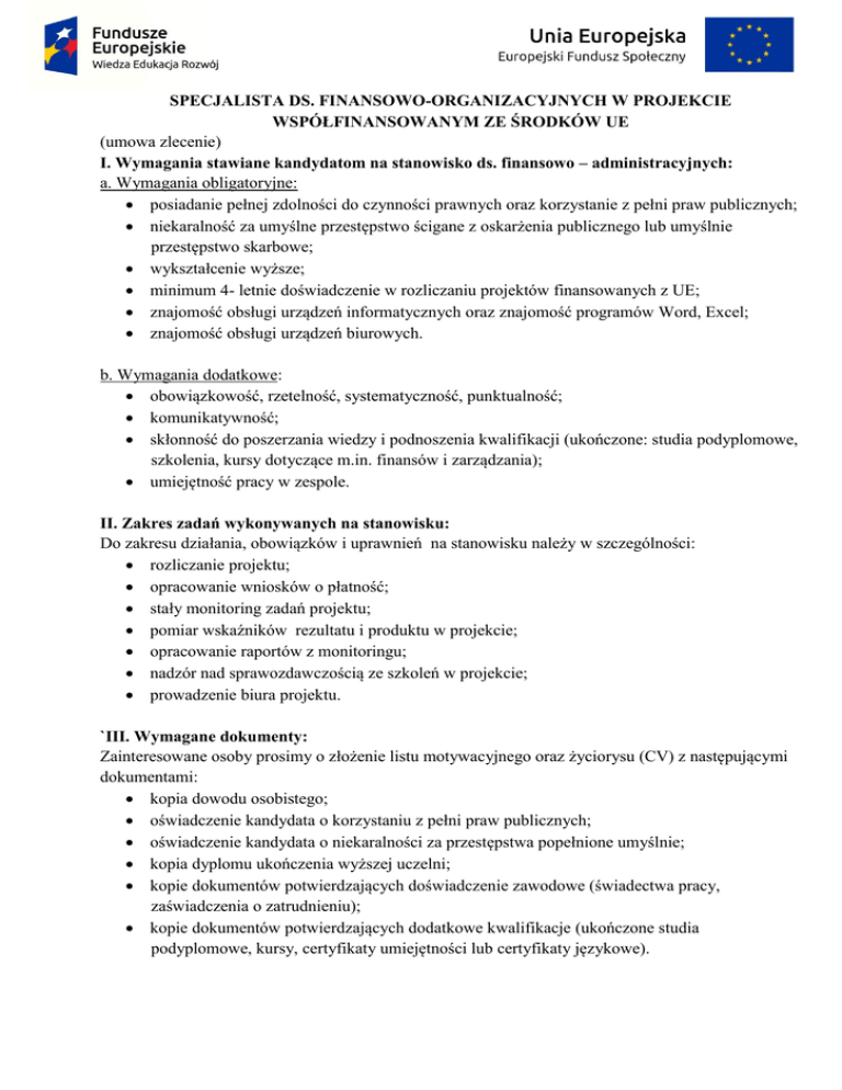 SPECJALISTA DS. FINANSOWO-ORGANIZACYJNYCH W PROJEKCIE WSPÓŁFINANSOWANYM ZE ŚRODKÓW UE (umowa zlecenie) I. Wymagania stawiane kandydatom na stanowisko ds. finansowo – administracyjnych: a. Wymagania obligatoryjne: posiadanie pełnej zdolności do czynności prawnych oraz korzystanie z pełni praw publicznych; niekaralność za umyślne przestępstwo ścigane z oskarżenia publicznego lub umyślnie przestępstwo skarbowe; wykształcenie wyższe; minimum 4- letnie doświadczenie w rozliczaniu projektów finansowanych z UE; znajomość obsługi urządzeń informatycznych oraz znajomość programów Word, Excel; znajomość obsługi urządzeń biurowych. b. Wymagania dodatkowe: obowiązkowość, rzetelność, systematyczność, punktualność; komunikatywność; skłonność do poszerzania wiedzy i podnoszenia kwalifikacji (ukończone: studia podyplomowe, szkolenia, kursy dotyczące m.in. finansów i zarządzania); umiejętność pracy w zespole. II. Zakres zadań wykonywanych na stanowisku: Do zakresu działania, obowiązków i uprawnień na stanowisku należy w szczególności: rozliczanie projektu; opracowanie wniosków o płatność; stały monitoring zadań projektu; pomiar wskaźników rezultatu i produktu w projekcie; opracowanie raportów z monitoringu; nadzór nad sprawozdawczością ze szkoleń w projekcie; prowadzenie biura projektu. `III. Wymagane dokumenty: Zainteresowane osoby prosimy o złożenie listu motywacyjnego oraz życiorysu (CV) z następującymi dokumentami: kopia dowodu osobistego; oświadczenie kandydata o korzystaniu z pełni praw publicznych; oświadczenie kandydata o niekaralności za przestępstwa popełnione umyślnie; kopia dyplomu ukończenia wyższej uczelni; kopie dokumentów potwierdzających doświadczenie zawodowe (świadectwa pracy, zaświadczenia o zatrudnieniu); kopie dokumentów potwierdzających dodatkowe kwalifikacje (ukończone studia podyplomowe, kursy, certyfikaty umiejętności lub certyfikaty językowe). Wymagane dokumenty aplikacyjne: list motywacyjny i CV powinny być opatrzone podpisanym oświadczeniem kandydata: „wyrażam zgodę na przetwarzanie moich danych osobowych zawartych w ofercie pracy dla potrzeb niezbędnych do realizacji procesu rekrutacji zgodnie z ustawą z dnia 29 sierpnia 1997 roku o ochronie danych osobowych (t. j. Dz. U. z 2014 r. poz. 1182) oraz ustawą z dnia 21 listopada 2008 roku o pracownikach samorządowych (t. j. Dz. U. z 2014 r. poz. 1202)”. VI. Termin i sposób składania dokumentów aplikacyjnych: Dokumenty należy przesłać pocztą lub przesyłką kurierską na adres: Katedra Statystyki Ekonomicznej i Społecznej, Uniwersytet Łódzki Ul. Rewolucji 1905 r. nr 41 90-214 Łódź Z dopiskiem: Justyna Wiktorowicz Termin składania dokumentów: 31.08.2016 r.