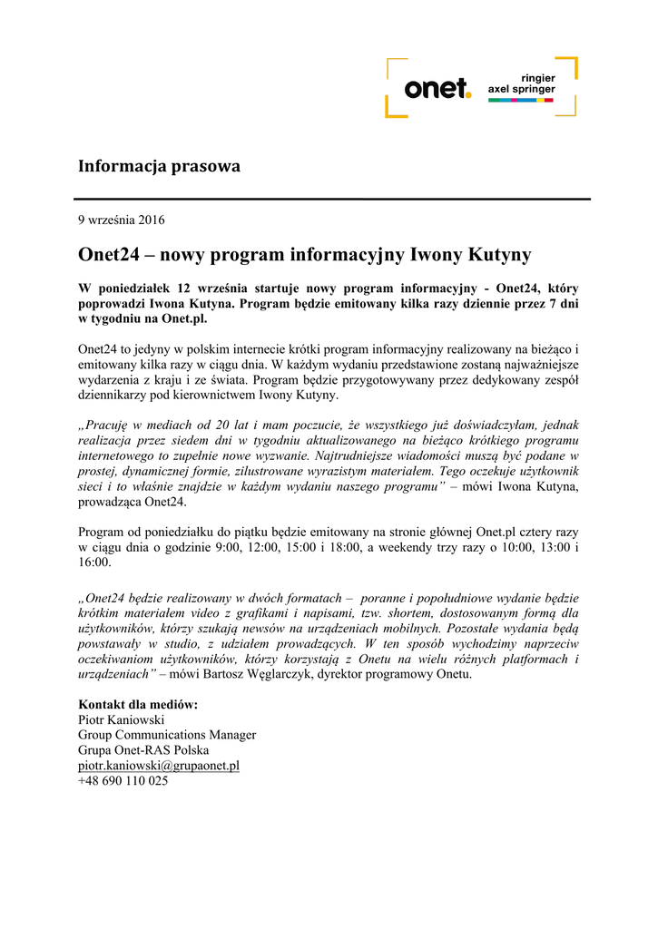 Informacjaprasowa 9 września 2016 Onet24 – nowy program informacyjny Iwony Kutyny W poniedziałek 12 września startuje nowy program informacyjny - Onet24, który poprowadzi Iwona Kutyna. Program będzie emitowany kilka razy dziennie przez 7 dni w tygodniu na Onet.pl. Onet24 to jedyny w polskim internecie krótki program informacyjny realizowany na bieżąco i emitowany kilka razy w ciągu dnia. W każdym wydaniu przedstawione zostaną najważniejsze wydarzenia z kraju i ze świata. Program będzie przygotowywany przez dedykowany zespół dziennikarzy pod kierownictwem Iwony Kutyny. „Pracuję w mediach od 20 lat i mam poczucie, że wszystkiego już doświadczyłam, jednak realizacja przez siedem dni w tygodniu aktualizowanego na bieżąco krótkiego programu internetowego to zupełnie nowe wyzwanie. Najtrudniejsze wiadomości muszą być podane w prostej, dynamicznej formie, zilustrowane wyrazistym materiałem. Tego oczekuje użytkownik sieci i to właśnie znajdzie w każdym wydaniu naszego programu” – mówi Iwona Kutyna, prowadząca Onet24. Program od poniedziałku do piątku będzie emitowany na stronie głównej Onet.pl cztery razy w ciągu dnia o godzinie 9:00, 12:00, 15:00 i 18:00, a weekendy trzy razy o 10:00, 13:00 i 16:00. „Onet24 będzie realizowany w dwóch formatach – poranne i popołudniowe wydanie będzie krótkim materiałem video z grafikami i napisami, tzw. shortem, dostosowanym formą dla użytkowników, którzy szukają newsów na urządzeniach mobilnych. Pozostałe wydania będą powstawały w studio, z udziałem prowadzących. W ten sposób wychodzimy naprzeciw oczekiwaniom użytkowników, którzy korzystają z Onetu na wielu różnych platformach i urządzeniach” – mówi Bartosz Węglarczyk, dyrektor programowy Onetu. Kontakt dla mediów: Piotr Kaniowski Group Communications Manager Grupa Onet-RAS Polska [email protected] +48 690 110 025