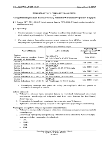 WOA.I.ZZP/WOA/U-335-180/09 Załącznik nr 2 do SIWZ SZCZEGÓŁOWY OPIS PRZEDMIOTU ZAMÓWIENIA NA Usługę transmisji danych dla Mazowieckiej Jednostki WdraŜania Programów Unijnych § 1. Symbol CPV: 72.31.80.00-7 Usługi przesyłu danych; 72.72.00.00-3 Usługi w zakresie rozległej sieci komputerowej; § 2. Opis usługi: 1. Przedmiotem zamówienia jest usługa Wirtualnej Sieci Prywatnej zbudowanej w technologii Full Mesh na bazie wydzielonej sieci Wykonawcy odseparowanej od sieci Internet. 2. Wszystkie placówki Zamawiającego muszą zostać połączone siecią VPN bez limitu na transfer danych łączami o parametrach nie gorszych niŜ określonych w poniŜszej tabeli. Tabela Specyfikacja łączy transmisji danych Nazwa Oddziału Centrum Główna osoba do kontaktu – Tomasz Kowalski, tel. 600801694 Oddział 1 Telefon do kontaktu (023) 673 07 12 Oddział 2 Telefon do kontaktu (022) 295 22 78 Oddział 3 Telefon do kontaktu (022) 295 23 39 Oddział 4 Telefon do kontaktu (022) 295 23 33 Oddział 5 Telefon do kontaktu (025) 631 01 01 − Adres Oddziału Prędkość portu dostępowego sieci VPN Zamawiającego WARSZAWA ul. Jagiellońska 74, 03-301 Warszawa Min. 4 Mb/s CIECHANÓW ul. Wodna 1, 06-400 Ciechanów OSTROŁĘKA ul. Poznańska 19, 07-409 Ostrołęka PŁOCK ul. Stary Rynek 20, 09-400 Płock RADOM ul. Kościuszki 5a, 26-610 Radom SIEDLCE ul. Piłsudskiego 38, 08-110 Siedlce Min. 2048/512 kb/s Min. 2048/512 kb/s Min. 2048/512 kb/s Min. 2048/512 kb/s Min. 2048/512 kb/s Zamawiający zastrzega sobie prawo do zmiany poszczególnych lokalizacji portów na warunkach określonych w umowie. Zakres czynności: 1. Wykonawca zakończy łącza transmisji danych we wszystkich lokalizacjach stosownymi urządzeniami umoŜliwiającymi dołączenie sieci LAN (styk Ethernet lub FastEthernet) Zamawiającego. 2. Urządzenia te będą podlegały zarządzaniu i serwisowaniu przez Wykonawcę 3. Wykonawca dokona konfiguracji urządzeń w celu zapewnienia poprawnego działania usługi. Wymagania szczegółowe związane z przedmiotem zamówienia: 1. Wykonawca musi posiadać własną sieć szkieletową obejmującą zasięgiem wszystkie placówki zamawiającego. 2. Zamawiający wymaga aby łącza pomiędzy oddziałami a siecią szkieletową Wykonawcy były wykonane w jednej z następujących technologii: − DSL; − ADSL; − PDH; − SDH. Mazowiecka Jednostka WdraŜania Programów Unijnych ul. Jagiellońska 74, 03-301 Warszawa Strona 1 z 2 WOA.I.ZZP/WOA/U-335-180/09 Załącznik nr 2 do SIWZ 3. W przypadku uŜycia przez wykonawcę technologii radiowej zamawiający wymaga aby radiolinia pracowała w koncesjonowanym paśmie. 4. Zamawiający wymaga aby Wirtualna Sieć Prywatna obsługiwała dowolną liczbę urządzeń podłączonych do sieci we wszystkich lokalizacjach. Mazowiecka Jednostka WdraŜania Programów Unijnych ul. Jagiellońska 74, 03-301 Warszawa Strona 2 z 2