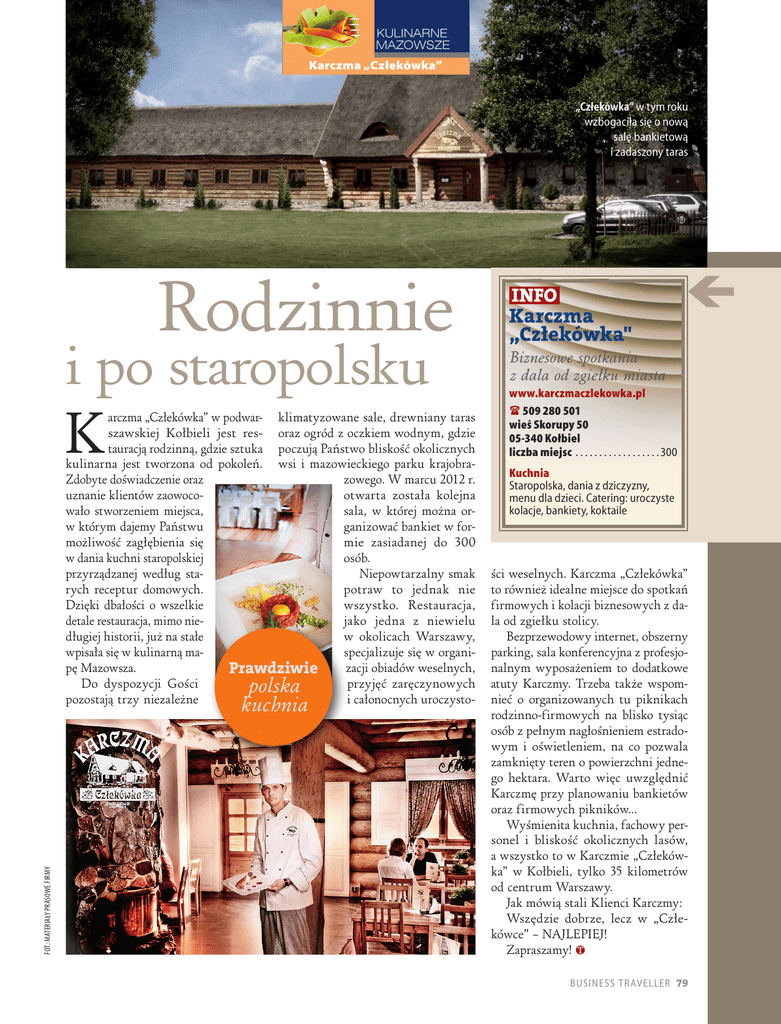 kulinarne mazowsze Karczma „Człekówka” „Człekówka” w tym roku wzbogaciła się o nową salę bankietową i zadaszony taras Rodzinnie i po staropolsku K arczma „Człekówka” w podwar- klimatyzowane sale, drewniany taras szawskiej Kołbieli jest res- oraz ogród z oczkiem wodnym, gdzie tauracją rodzinną, gdzie sztuka poczują Państwo bliskość okolicznych kulinarna jest tworzona od pokoleń. wsi i mazowieckiego parku krajobraZdobyte doświadczenie oraz zowego. W marcu 2012 r. uznanie klientów zaowocootwarta została kolejna wało stworzeniem miejsca, sala, w której można orw którym dajemy Państwu ganizować bankiet w formożliwość zagłębienia się mie zasiadanej do 300 w dania kuchni staropolskiej osób. przyrządzanej według staNiepowtarzalny smak rych receptur domowych. potraw to jednak nie Dzięki dbałości o wszelkie wszystko. Restauracja, detale restauracja, mimo niejako jedna z niewielu długiej historii, już na stałe w okolicach Warszawy, wpisała się w kulinarną maspecjalizuje się w organipę Mazowsza. zacji obiadów weselnych, Prawdziwie Do dyspozycji Gości przyjęć zaręczynowych pozostają trzy niezależne i całonocnych uroczysto- FoT.: materiały prasowe firmy polska kuchnia INFO Karczma „Człekówka" Biznesowe spotkania z dala od zgiełku miasta www.karczmaczlekowka.pl 509 280 501 wieś Skorupy 50 05-340 Kołbiel liczba miejsc ����������������������������������� 300 Kuchnia Staropolska, dania z dziczyzny, menu dla dzieci. Catering: uroczyste kolacje, bankiety, koktaile ści weselnych. Karczma „Człekówka” to również idealne miejsce do spotkań firmowych i kolacji biznesowych z dala od zgiełku stolicy. Bezprzewodowy internet, obszerny parking, sala konferencyjna z profesjonalnym wyposażeniem to dodatkowe atuty Karczmy. Trzeba także wspomnieć o organizowanych tu piknikach rodzinno-firmowych na blisko tysiąc osób z pełnym nagłośnieniem estradowym i oświetleniem, na co pozwala zamknięty teren o powierzchni jednego hektara. Warto więc uwzględnić Karczmę przy planowaniu bankietów oraz firmowych pikników... Wyśmienita kuchnia, fachowy personel i bliskość okolicznych lasów, a wszystko to w Karczmie „Człekówka” w Kołbieli, tylko 35 kilometrów od centrum Warszawy. Jak mówią stali Klienci Karczmy: Wszędzie dobrze, lecz w „Człekówce” – NAJLEPIEJ! Zapraszamy! business tr aveller 79