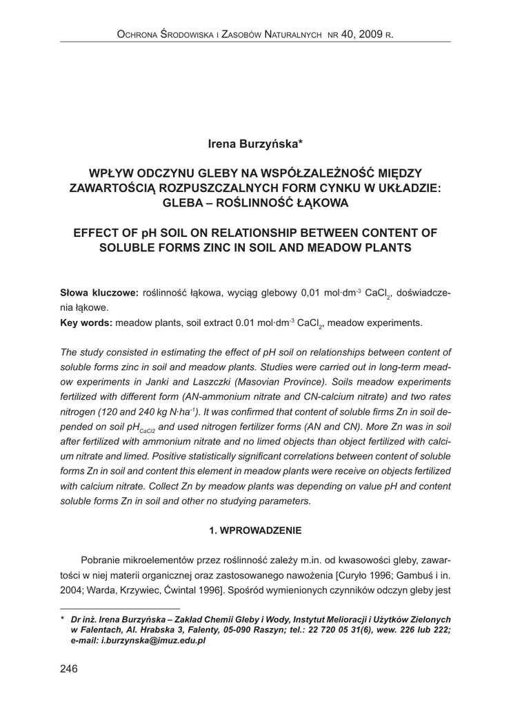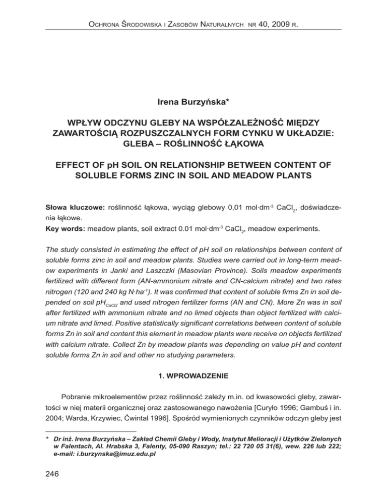 Ochrona Środowiska i Zasobów Naturalnych nr 40, 2009 r. Irena Burzyńska* WPŁYW ODCZYNU GLEBY NA WSPÓŁZALEŻNOŚĆ MIĘDZY ZAWARTOŚCIĄ ROZPUSZCZALNYCH FORM CYNKU W UKŁADZIE: GLEBA – ROŚLINNOŚĆ ŁĄKOWA EFFECT OF pH SOIL ON RELATIONSHIP BETWEEN CONTENT OF SOLUBLE FORMS ZINC IN SOIL AND MEADOW PLANTS Słowa kluczowe: roślinność łąkowa, wyciąg glebowy 0,01 mol∙dm-3 CaCl2, doświadcze- nia łąkowe. Key words: meadow plants, soil extract 0.01 mol∙dm-3 CaCl2, meadow experiments. The study consisted in estimating the effect of pH soil on relationships between content of soluble forms zinc in soil and meadow plants. Studies were carried out in long-term meadow experiments in Janki and Laszczki (Masovian Province). Soils meadow experiments fertilized with different form (AN-ammonium nitrate and CN-calcium nitrate) and two rates nitrogen (120 and 240 kg N∙ha-1). It was confirmed that content of soluble firms Zn in soil depended on soil pHCaCl2 and used nitrogen fertilizer forms (AN and CN). More Zn was in soil after fertilized with ammonium nitrate and no limed objects than object fertilized with calcium nitrate and limed. Positive statistically significant correlations between content of soluble forms Zn in soil and content this element in meadow plants were receive on objects fertilized with calcium nitrate. Collect Zn by meadow plants was depending on value pH and content soluble forms Zn in soil and other no studying parameters. 1. WPROWADZENIE Pobranie mikroelementów przez roślinność zależy m.in. od kwasowości gleby, zawartości w niej materii organicznej oraz zastosowanego nawożenia [Curyło 1996; Gambuś i in. 2004; Warda, Krzywiec, Ćwintal 1996]. Spośród wymienionych czynników odczyn gleby jest * Dr inż. Irena Burzyńska – Zakład Chemii Gleby i Wody, Instytut Melioracji i Użytków Zielonych w Falentach, Al. Hrabska 3, Falenty, 05-090 Raszyn; tel.: 22 720 05 31(6), wew. 226 lub 222; e-mail: [email protected] 246 Wpływ odczynu gleby na współzależność między zawartością rozpuszczalnych form cynku... jednym z najważniejszych czynników, decydujących o rozpuszczalności i dostępności dla roślin metali ciężkich, w tym także cynku. Celem pracy była ocena współzależności między zawartością łatwo rozpuszczalnych form cynku w glebie łąkowej po jej ekstrakcji roztworem 0,01 mol∙dm-3 CaCl2 a pobraniem tego składnika przez roślinność łąkową I pokosu na tle zróżnicowanego odczynu gleby. 2. MATERIAŁ I METODY BADAŃ Badania prowadzono na dwóch wieloletnich doświadczeniach łąkowych, założonych w 1989 r. metodą bloków losowanych w czterech powtórzeniach, w miejscowościach Janki i Laszczki w woj. mazowieckim. Obydwa doświadczenia założono w celu badania wpływu wapnowania w układzie gleba–roślinność łąkowa. Doświadczenia zlokalizowano na czarnej ziemi zdegradowanej o składzie granulometrycznym piasku gliniastego – w Jankach oraz gliny lekkiej pylastej – w Laszczkach. Wierzchnią warstwę gleby (0–10 cm) pobranej z terenu doświadczeń charakteryzowały następujące parametry: pHKCl – 3,9 w Jankach i 5,2 w Laszczkach; C org. – 1,46% w s.m. w Jankach i 2,93% w s.m. w Laszczkach oraz Znog – 21,72 mg·kg-1 w Jankach i 37,05 mg·kg-1 w Laszczkach. Zabieg wapnowania wykonano jednorazowo, na początku doświadczenia, węglanem wapnia (49,8% CaO), dawko- waną na zadarnioną powierzchnię gleby. Zastosowano dwie dawki wapna, obliczone zgodnie z kryterium kwasowości hydrolitycznej: 1Hh (Ca1) Janki – 2,3; Laszczki – 3,6 t CaO·ha-1 oraz 2 Hh (Ca2); Janki – 4,6 oraz Laszczki – 7,2 t CaO·ha-1 . Glebę na terenie doświadczeń nawożono jednolicie fosforem i potasem: 34,9 kg P·kg-1 ; 149,5 kg K·kg-1. Nawożenie azo- tem stosowano w dawkach: N120= 120 i N240= 240 kg N·ha-1, saletry amonowej (AN) i wap- niowej (CN). W 1990 r. jednorazowo nawieziono glebę manganem oraz cynkiem w Laszczkach, w ilości 50 kg Mn·ha-1 i 30 kg Zn·ha-1. Szczegółowy opis doświadczenia zawiera publikacja Sapek [2006]. W latach 1995, 1998 i 2000 pobierano wczesną wiosną próbki gleby do badań z 5-centymetrowych warstw, od 0 do 25 cm, oraz próbki roślinności łąkowej w czasie pierwszego pokosu z wymienionych doświadczeń łąkowych. Próbki gleby po ich wysuszeniu do stanu „powietrznie” suchego ekstrahowano za pomocą roztworu 0,01 mol∙dm-3 CaCl2 [Houba i in. 1990]. W wyciągu z gleby oznaczono wartość pH potencjometrycznie, a zawartość Zn – metodą atomowej spektrometrii absorpcyjnej. Otrzymane wyniki analiz chemicznych poddano obróbce statystycznej za pomocą pakietu statystycznego STATISTICA 7.0. 3. WYNIKI BADAŃ I DYSKUSJA W glebie z doświadczeń łąkowych zakres pHCaCl2 był szeroki, od kwaśnego do obojętne- go, w zależności od obiektu doświadczalnego oraz zastosowanego nawożenia. Najbardziej kwaśna była gleba z niewapnowanego obiektu nawozowego w Jankach (pHCaCl2 – 4,45). Za- 247 zależności od obiektu doświadczalnego oraz zastosowanego nawożenia. Najbardziej kwaśna była gleba z niewapnowanego obiektu nawozowego w Jankach (pHCaCl2 – 4,45). Irena Burzyńska Zastosowanie nawożenia azotem w formie saletry wapniowej na obiektach w przeszłości wapnowanych podwójną dawką wapna (Ca2) zmniejszało kwasowość gleby (rys. 1). stosowanie nawożenia azotem w formie saletry wapniowej na obiektach w przeszłości wap- Efektem tego była optymalizacja odczynu(Ca2) glebyzmniejszało do potrzebkwasowość roślinności gleby łąkowej – nowanych podwójną dawką wapna (rys.(pH 1). 5,0 Efektem 6,5). tego Otrzymane wyniki badań są zgodne z wieloletnimi badaniami prowadzonymi przez była optymalizacja odczynu gleby do potrzeb roślinności łąkowej (pH 5,0 – 6,5). OtrzybadańAutorka są zgodne z wieloletnimi badaniami prowadzonymi przez Sapek [2004 Sapekmane [2004wyniki i 2009]. wykazała długoletni wpływ jednorazowo wykonanego i 2009]. Autorka wykazała długoletni wpływ 