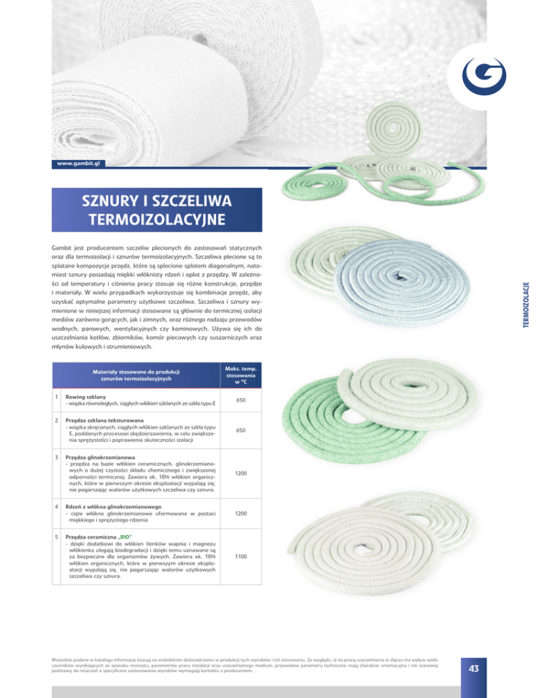 www.gambit.gl SZNURY I SZCZELIWA TERMOIZOLACYJNE Materiały stosowane do produkcji sznurów termoizolacyjnych Maks. temp. stosowania w °C 1 Rowing szklany - wiązka równoległych, ciągłych włókien szklanych ze szkła typu E 650 2 Przędza szklana teksturowana - wiązka skręconych, ciągłych włókien szklanych ze szkła typu E, poddanych procesowi skędzierzawienia, w celu zwiększenia sprężystości i poprawienia skuteczności izolacji 650 Przędza glinokrzemianowa - przędza na bazie włókien ceramicznych, glinokrzemianowych o dużej czystości składu chemicznego i zwiększonej odporności termicznej. Zawiera ok. 18% włókien organicznych, które w pierwszym okresie eksploatacji wypalają się, nie pogarszając walorów użytkowych szczeliwa czy sznura. 1200 4 Rdzeń z włókna glinokrzemianowego - cięte włókno glinokrzemianowe uformowane w postaci miękkiego i sprężystego rdzenia 1200 5 Przędza ceramiczna „BIO” - dzięki dodatkowi do włókien tlenków wapnia i magnezu włókienka ulegają biodegradacji i dzięki temu uznawane są za bezpieczne dla organizmów żywych. Zawiera ok. 18% włókien organicznych, które w pierwszym okresie eksploatacji wypalają się, nie pogarszając walorów użytkowych szczeliwa czy sznura. 1100 3 TERMOIZOLACJE Gambit jest producentem szczeliw plecionych do zastosowań statycznych oraz dla termoizolacji i sznurów termoizolacyjnych. Szczeliwa plecione są to splatane kompozycje przędz, które są splecione splotem diagonalnym, natomiast sznury posiadają miękki włóknisty rdzeń i oplot z przędzy. W zależności od temperatury i ciśnienia pracy stosuje się różne konstrukcje, przędze i materiały. W wielu przypadkach wykorzystuje się kombinacje przędz, aby uzyskać optymalne parametry użytkowe szczeliwa. Szczeliwa i sznury wymienione w niniejszej informacji stosowane są głównie do termicznej izolacji mediów zarówno gorących, jak i zimnych, oraz różnego rodzaju przewodów wodnych, parowych, wentylacyjnych czy kominowych. Używa się ich do uszczelniania kotłów, zbiorników, komór piecowych czy suszarniczych oraz młynów kulowych i strumieniowych. Wszystkie podane w katalogu informacje bazują na wieloletnim doświadczeniu w produkcji tych wyrobów i ich stosowaniu. Ze względu, iż na pracę uszczelnienia w złączu ma wpływ wiele czynników wynikających ze sposobu montażu, parametrów pracy instalacji oraz uszczelnianego medium, przywołane parametry techniczne mają charakter orientacyjny i nie stanowią podstawy do roszczeń a specyficzne zastosowania wyrobów wymagają kontaktu z producentem. 43