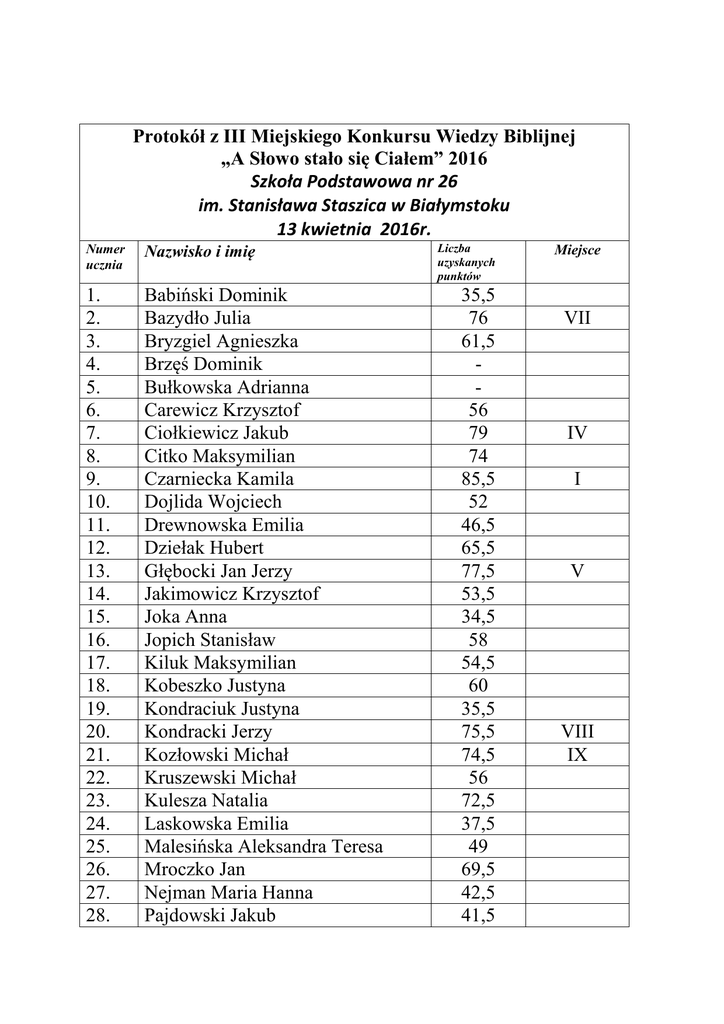 Protokół z III Miejskiego Konkursu Wiedzy Biblijnej „A Słowo stało się Ciałem” 2016 Szkoła Podstawowa nr 26 im. Stanisława Staszica w Białymstoku 13 kwietnia 2016r. Numer ucznia Nazwisko i imię 1. 2. 3. 4. 5. 6. 7. 8. 9. 10. 11. 12. 13. 14. 15. 16. 17. 18. 19. 20. 21. 22. 23. 24. 25. 26. 27. 28. Babiński Dominik Bazydło Julia Bryzgiel Agnieszka Brzęś Dominik Bułkowska Adrianna Carewicz Krzysztof Ciołkiewicz Jakub Citko Maksymilian Czarniecka Kamila Dojlida Wojciech Drewnowska Emilia Dziełak Hubert Głębocki Jan Jerzy Jakimowicz Krzysztof Joka Anna Jopich Stanisław Kiluk Maksymilian Kobeszko Justyna Kondraciuk Justyna Kondracki Jerzy Kozłowski Michał Kruszewski Michał Kulesza Natalia Laskowska Emilia Malesińska Aleksandra Teresa Mroczko Jan Nejman Maria Hanna Pajdowski Jakub Liczba uzyskanych punktów 35,5 76 61,5 56 79 74 85,5 52 46,5 65,5 77,5 53,5 34,5 58 54,5 60 35,5 75,5 74,5 56 72,5 37,5 49 69,5 42,5 41,5 Miejsce VII IV I V VIII IX 29. 30. 31. 32. 33. 34. 35. 36. 37. 38. 39. 40. 41. 42. 43. 44. 45. 46. 47. 48. 49. 50. 51. 52. 53. 54. 55. 56. 57. 58. 59. Perkowska Gabriela Perło Piotr Pietrzykowski Dawid Puciłowska Aleksandra Puciłowski Bartłomiej Radziwońska Katarzyna Rydzewska Magdalena Rydzewska Patrycja Sienicki Patryk Słomczyńska Magdalena Smoleńska Weronika Sosnowski Kamil Stefanowski Igor Konstanty Sural Agnieszka Suchowierska Anna Suchowierska Urszula Szoka Hubert Szczygieł Michał Świrydziuk Helena Twarowska Aleksandra Tylicka Wiktoria Wasilewski Stanisław Piotr Waszkiewicz Julia Wieczorek Gabriela Wnorowska Julia Wysztygiel Emilia Zawistowski Krzysztof Zdrodowska Martyna Zieniewicz Barbara Zubrycka Dominika Zubrycki Grzegorz 51,5 51,5 30,5 33,5 77 45,5 74,5 68,5 64,5 54,5 70,5 69 52,5 57,5 54,5 64 39 84 34,5 45,5 50,5 47,5 68,5 68 73,5 36,5 50,5 54,5 85 49 VI IX III II