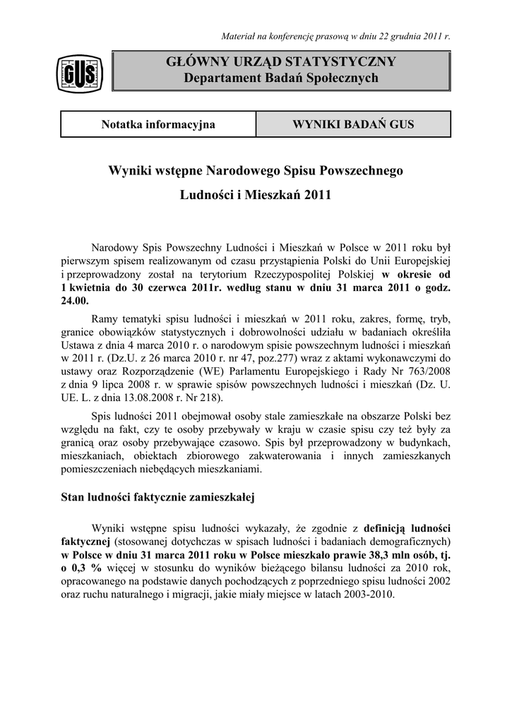Materiał na konferencję prasową w dniu 22 grudnia 2011 r. GŁÓWNY URZĄD STATYSTYCZNY Departament Badań Społecznych Notatka informacyjna WYNIKI BADAŃ GUS Wyniki wstępne Narodowego Spisu Powszechnego Ludności i Mieszkań 2011 Narodowy Spis Powszechny Ludności i Mieszkań w Polsce w 2011 roku był pierwszym spisem realizowanym od czasu przystąpienia Polski do Unii Europejskiej i przeprowadzony został na terytorium Rzeczypospolitej Polskiej w okresie od 1 kwietnia do 30 czerwca 2011r. według stanu w dniu 31 marca 2011 o godz. 24.00. Ramy tematyki spisu ludności i mieszkań w 2011 roku, zakres, formę, tryb, granice obowiązków statystycznych i dobrowolności udziału w badaniach określiła Ustawa z dnia 4 marca 2010 r. o narodowym spisie powszechnym ludności i mieszkań w 2011 r. (Dz.U. z 26 marca 2010 r. nr 47, poz.277) wraz z aktami wykonawczymi do ustawy oraz Rozporządzenie (WE) Parlamentu Europejskiego i Rady Nr 763/2008 z dnia 9 lipca 2008 r. w sprawie spisów powszechnych ludności i mieszkań (Dz. U. UE. L. z dnia 13.08.2008 r. Nr 218). Spis ludności 2011 obejmował osoby stale zamieszkałe na obszarze Polski bez względu na fakt, czy te osoby przebywały w kraju w czasie spisu czy też były za granicą oraz osoby przebywające czasowo. Spis był przeprowadzony w budynkach, mieszkaniach, obiektach zbiorowego zakwaterowania i innych zamieszkanych pomieszczeniach niebędących mieszkaniami. Stan ludności faktycznie zamieszkałej Wyniki wstępne spisu ludności wykazały, że zgodnie z definicją ludności faktycznej (stosowanej dotychczas w spisach ludności i badaniach demograficznych) w Polsce w dniu 31 marca 2011 roku w Polsce mieszkało prawie 38,3 mln osób, tj. o 0,3 % więcej w stosunku do wyników bieżącego bilansu ludności za 2010 rok, opracowanego na podstawie danych pochodzących z poprzedniego spisu ludności 2002 oraz ruchu naturalnego i migracji, jakie miały miejsce w latach 2003-2010. Kategoria ludności faktycznie zamieszkałej obejmuje: a) stałych mieszkańców, z wyjątkiem osób przebywających poza miejscem zamieszkania przez okres powyżej 3 miesięcy w kraju oraz obejmuje wszystkie osoby przebywające za granicą (bez względu na okres ich nieobecności) b) osoby przebywające czasowo przez okres powyżej 3 miesięcy, przybyłe z innego miejsca w kraju. W porównaniu z wynikami spisu z 2002 roku ludność Polski w 2011r. zwiększyła się o blisko 100 tys. osób (0,25%), przy czym przyrost ten w większym stopniu dotyczył kobiet, niż mężczyzn ) - p. tabl. 1. Tabl. 1. Ludność według płci w latach 2002 i 2011 (na podstawie wyników spisów) Wyszczególnienie Ogółem Mężczyźni Kobiety Ludność faktyczna w tys. (20. V. 2002r.) 38230 18516 19714 Ludność faktyczna w tys. (31. III. 2011r.) 38325 18353 19972 +95 -163 +258 100,2 99,1 101,3 Różnica w latach 2002-2011 (w tys.) Dynamika zmian (2002 = 100) W świetle wyników spisu 2011 roku liczba ludności faktycznie zamieszkałej w miastach stanowiła ok. 59,4% ogółu (w 2002 roku udział ten wynosił 61,2%), zaś ludność wiejska ok. 40,6% (w 2002 – 38,2%). Liczba ludności miejskiej zmniejszyła się w porównaniu do 2002 roku o 1,8 pkt procentowego. Zmiany te były spowodowane w dużej mierze migracjami z dużych ośrodków miejskich na obrzeża miast, należące już do terenów administracyjnie wyodrębnianych jako obszary wiejskie. Gęstość zaludnienia, tj. liczba osób faktycznie zamieszkałych przypadających na 1 km2 powierzchni kraju wyniosła – 123 osoby. Struktura demograficzna Struktura wieku ludności faktycznej w latach 2002-2011 ulegała dynamicznym zmianom, co było głównie konsekwencją „przesuwania się” wyżów i niżów demograficznych przez poszczególne grupy wieku ludności oraz – skutkiem zwiększonej emigracji Polaków za granicę, po wstąpieniu Polski do Unii Europejskiej (p. tabl. 2). W okresie międzyspisowym zmieniły się również proporcje według płci. W 2011 roku mężczyźni stanowili 47,9% ogółu ludności faktycznie zamieszkałej wobec 48,4% w 2002 roku. Tym samym zwiększył się współczynnik feminizacji; aktualnie na 100 mężczyzn przypada 108 kobiet. 2 Tabl. 2 Struktura wieku ludności faktycznie zamieszkałej w latach 2002-2011 Wyszczególnienie Ogółem Przedprodukcyjny (0-17 lat) Produkcyjny (18-59/64 lata) mobilny niemobilny razem (18-44 (45-59/64 lata) lata) w% Poprodukcyjny (60/65 i więcej) Ludność faktyczna wg NSP 2002 100,0 23,2 61,8 39,9 21,9 15,0 Ludność faktyczna wg NSP 2011 100,0 19,2 63,5 39,2 24,3 17,3 100,0 18,7 64,4 40,1 24,3 16,9 Ludność faktyczna wg stanu w dniu 31 XII 2010r. Wstępne wyniki spisu wskazują, że w okresie 2002-2011 miały miejsce duże zmiany w poszczególnych grupach wieku ludności, które dotyczyły zarówno rozmiarów, jak i struktury wieku, tzn. udziału tych grup w ogólnej liczbie ludności Polski. W okresie tym istotnie zmniejszył się odsetek ludności w wieku przedprodukcyjnym (z 23,2% w 2002 r. do 19,2% w 2011r.), jednocześnie wzrósł udział ludności w wieku produkcyjnym o 1,7 pkt procentowego, przy czym odsetek osób w wieku produkcyjnym mobilnym uległ nieznacznemu zmniejszeniu. Większe zmiany natomiast zaobserwowano w wieku produkcyjnym niemobilnym (45-59 kobiety i 45-64 lata - mężczyźni) gdzie widoczny jest wzrost o ok. 2,4 pkt procentowego. Podobny wzrost (o 2,3 pkt procentowego) zaobserwowano w wieku poprodukcyjnym. Wykształcenie ludności Pozytywnym zjawiskiem obserwowanym w latach, które upłynęły od ostatniego spisu przeprowadzonego w 2002 roku jest stały wzrost poziomu wykształcenia ludności. W okresie międzyspisowym odsetek osób o wykształceniu ponadpodstawowym wzrósł z 66,9% w 2002 roku do 78,7% w 2011 roku tj. o 11,8 pkt procentowych. Najbardziej dynamiczny wzrost został odnotowany w odniesieniu do osób o wykształceniu wyższym, których udział zwiększył się z 9,9% w 2002 roku do ponad 17,5% w 2011 roku ogółu ludności w wiek