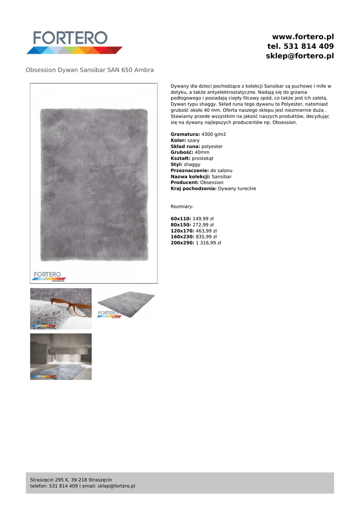 www.fortero.pl tel. 531 814 409 [email protected] Obsession Dywan Sansibar SAN 650 Ambra Dywany dla dzieci pochodzące z kolekcji Sansibar są puchowe i miłe w dotyku, a także antyelektrostatyczne. Nadają się do grzania podłogowego i posiadają ciepły filcowy spód, co także jest ich zaletą. Dywan typu shaggy. Skład runa tego dywanu to Polyester, natomiast grubość około 40 mm. Oferta naszego sklepu jest niezmiernie duża . Stawiamy przede wszystkim na jakość naszych produktów, decydując się na dywany najlepszych producentów np. Obsession. Gramatura: 4300 g/m2 Kolor: szary Skład runa: polyester Grubość: 40mm Kształt: prostokąt Styl: shaggy Przeznaczenie: do salonu Nazwa kolekcji: Sansibar Producent: Obsession Kraj pochodzenia: Dywany tureckie Rozmiary: 60x110: 149,99 zł 80x150: 272,99 zł 120x170: 463,99 zł 160x230: 835,99 zł 200x290: 1 316,99 zł Straszęcin 295 K, 39-218 Straszęcin telefon: 531 814 409 | email: [email protected]