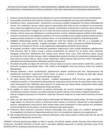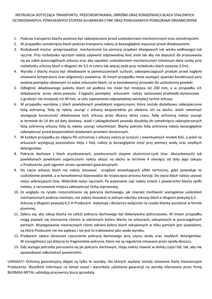 INSTRUKCJA DOTYCZĄCA TRANSPORTU, PRZECHOWYWANIA, OBRÓBKI ORAZ KONSERWACJI BLACH STALOWYCH OCYNKOWANYCH, POWLEKANYCH STOPEM ALUMINIUM-CYNK ORAZ POWLEKANYCH POWŁOKAMI ORGANICZNYMI 1. Podczas transportu blachy powinny być zabezpieczone przed uszkodzeniami mechanicznymi oraz zamoknięciem. 2. W przypadku zamoknięcia blach podczas transportu należy je bezwzględnie wysuszyć przed składowaniem. 3. Rozładunek można przeprowadzać mechanicznie (za pomocą urządzeń dźwigowych lub wózka widłowego) lub ręcznie. Przy rozładunku ręcznym należy zapewnić odpowiednią ilość osób tak aby nie dopuścić do przesuwania się po sobie poszczególnych arkuszy oraz aby zapobiec uszkodzeniom mechanicznym (minimum dwie osoby przy rozładunku arkuszy blach o długości do 3,5 m cztery lub więcej osób przy rozładunku blach powyżej 3,5m). 4. Wyroby z blachy musza być składowane w pomieszczeniach suchych, zabezpieczających produkt przed nagłymi zmianami temperatury oraz wilgotności powietrza. W innym przypadku może wystąpić zjawisko kondensacji pary wodnej pomiędzy ułożonymi na sobie arkuszami blach, co w konsekwencji prowadzi do uszkodzenia powłoki. 5. Odległość składowanego pakietu blach od podłoża nie może być mniejsza niż 200 mm, a w przypadku ich składowania przez okres powyżej 2 tygodni, pomiędzy arkuszami należy zastosować przekładki dystansowe o grubości nie mniejszej niż 40 mm, w celu zapewnienia odpowiedniej wentylacji tychże arkuszy. 6. W przypadku wyrobów z blach powlekanych powłokami organicznymi, które zostały dodatkowo zabezpieczone folią ochronną, folię tę należy usunąć z arkuszy bezpośrednio po ułożeniu ich na dachu. Jeżeli natomiast występuje konieczność składowania tych arkuszy przez dłuższy okres czasu, folię ochronną należy usunąć w terminie do 14 dni od daty dostawy. Jeżeli z jakiegokolwiek powodu doszłoby do zamoknięcia zabezpieczonych folią ochronną arkuszy folię tę należy usunąć natychmiast. Blachy pokryte folią ochronną należy bezwzględnie zabezpieczyć przed bezpośrednim działaniem promieni słonecznych. 7. W każdym przypadku po zdjęciu filii ochronnej z arkuszy należy je oczyścić z ewentualnych resztek folii, a jeżeli na arkuszach występują pozostałości kleju z folii, należy je bezwzględnie zmyć przy pomocy wody oraz zwykłych detergentów. 8. Pokrycie dachowe z blach ocynkowanych, powleczonych stopem aluminium-cynk (tzw. Alucynkowych) lub powlekanych powłokami organicznymi należy ułożyć na dachu w terminie 4 miesięcy od daty jego zakupu u Producenta, pod rygorem utraty uprawnień gwarancyjnych. 9. Do cięcia arkuszy blach nie należy stosować urządzeń wywołujących efekt termiczny, gdyż powoduje to uszkodzenie powłok, a w konsekwencji doprowadza do rozpoczęcia procesu korozji. Do cięcia blach należy używać nożyc wibracyjnych (tzw. Nibler)lub nożyc ręcznych. Po wykonaniu cięć należy zmieść z powierzchni blachy opiłki metalu, a zarysowane miejsca zabezpieczyć farbą zaprawową. 10. Ze względu na ryzyko rozszczelniania się pokrycia dachowego, jak również możliwość wystąpienia uszkodzeń mechanicznych podczas montażu, nie należy stosować w jednym odcinku arkuszy blach o długości powyżej 6,5 . Arkusze o długości powyżej 6,5 m Producent wykonuje i dostarcza wyłącznie na ryzyko klienta wyrażone w formie pisemnej. 11. Zaleca się, aby zakup blachy na całość pokrycia dachowego był dokonywany jednorazowo. W innym przypadku mogą pojawić się nieznaczne różnice w odcieniach koloru blachy na arkuszach, zakupionych w poszczególnych partiach. Występowanie nieznacznych różnic odcieni koloru blach zakupionych w kilku partiach jest zjawiskiem, na które Producent nie ma wpływu i nie jest to traktowane jako wada wyrobu. 12. Producent zaleca okresowe czyszczenie pokrycia dachowego przy użyciu wody oraz zwykłych detergentów. W szczególności zaś dotyczy to fragmentów pokrycia, które nie są regularnie zmywane przez opady deszczu. 13. Gdy wystąpi potrzeba poruszania się po pokryciu dachowym, stopy należy stawiać w dolnej części fali, tak, aby nie spowodować odkształceń powierzchni. UWAGA!!! Ochroną gwarancyjną objęte są tylko te wyroby, dla których wydane zostały stosowne Karty Gwarancyjne Producenta. Wszelkich informacji na temat zasad i warunków udzielania gwarancji na wyroby oferowane przez firmę BUDMAX-METAL udzielają pracownicy biura sprzedaży.