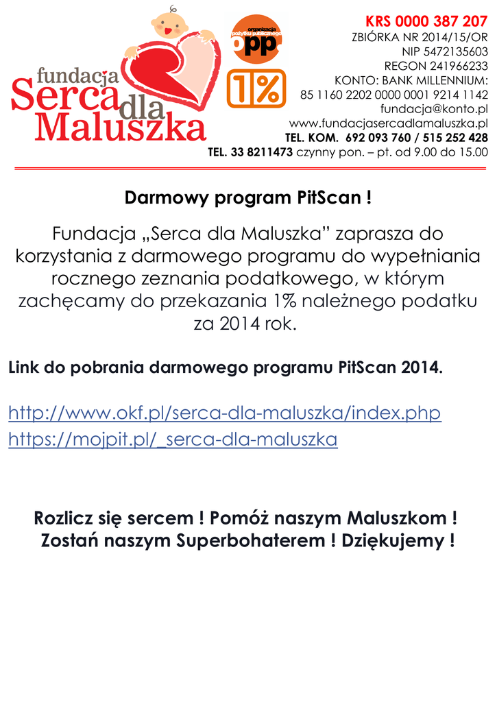 KRS 0000 387 207 ZBIÓRKA NR 2014/15/OR NIP 5472135603 REGON 241966233 KONTO: BANK MILLENNIUM: 85 1160 2202 0000 0001 9214 1142 [email protected] www.fundacjasercadlamaluszka.pl TEL. KOM. 692 093 760 / 515 252 428 TEL. 33 8211473 czynny pon. – pt. od 9.00 do 15.00 Darmowy program PitScan ! Fundacja „Serca dla Maluszka” zaprasza do korzystania z darmowego programu do wypełniania rocznego zeznania podatkowego, w którym zachęcamy do przekazania 1% należnego podatku za 2014 rok. Link do pobrania darmowego programu PitScan 2014. http://www.okf.pl/serca-dla-maluszka/index.php https://mojpit.pl/_serca-dla-maluszka Rozlicz się sercem ! Pomóż naszym Maluszkom ! Zostań naszym Superbohaterem ! Dziękujemy !