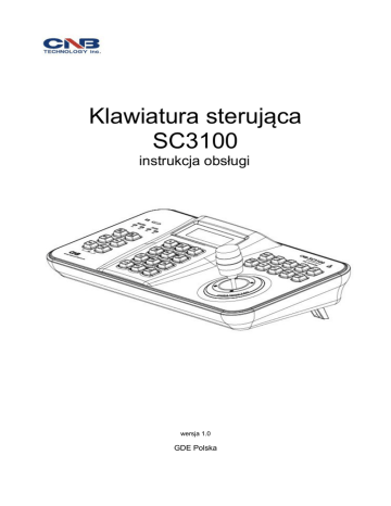 Klawiatura sterująca SC3100 instrukcja obsługi wersja 1.0 GDE Polska Klawiatura sterująca SC3100 – instrukcja obsługi wersja 1.0 2/12 Pozbywanie się starych urządzeń elektrycznych To urządzenie jest oznaczone zgodnie z Ustawą o zużytym sprzęcie elektrycznym i elektronicznym symbolem przekreślonego kontenera na odpady. Takie oznakowanie informuje, że sprzęt ten, po okresie jego użytkowania nie może być umieszczany łącznie z innymi odpadami pochodzącymi z gospodarstwa domowego. Użytkownik jest zobowiązany do oddania go prowadzącym zbieranie zużytego sprzętu elektrycznego i elektronicznego. Prowadzący zbieranie, w tym lokalne punkty zbiórki, sklepy oraz gminne jednostki, tworzą odpowiedni system umożliwiający oddanie tego sprzętu. Właściwe postępowanie ze zużytym sprzętem elektrycznym i elektronicznym przyczynia się do uniknięcia szkodliwych dla zdrowia ludzi i środowiska naturalnego konsekwencji, wynikających z obecności składników niebezpiecznych oraz niewłaściwego składowania i przetwarzania takiego sprzętu. Warunki eksploatacyjne • Nie należy narażać klawiatury na gwałtowne ruchy lub drgania • Przed podłączeniem zasilania sprawdzić poprawność napięcia i polaryzacji zasilania • Nieprawidłowe zasilanie może być powodem pożaru lub porażenia prądem elektrycznym • Należy zawsze używać klawiaturę w miejscu dobrze wentylowanym, aby uniknąć jego przegrzania • Warunki eksploatacji: temperatura oraz wilgotność zgodnie z danymi stosowanego rejestratora Ostrzeżenie Nie demontować obudowy. Jej demontaż może skutkować porażeniem elektrycznym. Uwaga: Wszelkie prace serwisowe należy zlecić przeszkolonemu i autoryzowanemu serwisowi. Urządzenie musi być zasilane zgodnie z wytycznymi podanymi w instrukcji. Importer i dystrybutor: GDE POLSKA Włosań, ul. Świątnicka 88 32-031 Mogilany www.gde.pl Wszelkie uwagi i poprawki prosimy zgłaszać na adres: [email protected] Ze względu na doskonalenie urządzeń i oprogramowania możliwe jest pojawienie się nowych funkcji nieujętych w niniejszej instrukcji. Dystrybucja GDE Polska Włosań, ul. Świątnicka 88 32-031 Mogilany tel. +48 12 256 50 35 mail: [email protected] Klawiatura sterująca SC3100 – instrukcja obsługi wersja 1.0 3/12 Ważne ostrzeżenia • Urządzenie musi być zasilane zgodnie z wytycznymi podanymi w instrukcji lub danych technicznych. Nieprawidłowe zasilanie może być powodem pożaru lub porażenia prądem elektrycznym • Nie wolno narażać urządzenia na wilgoć. Może to powodować pożar albo porażenie prądem elektrycznym • Nie wolno kłaść ciężkim przedmiotów na obudowie albo kablu zasilającym. Uszkodzenie kabla zasilającego może spowodować pożar albo porażenie prądem elektrycznym • Nie wolno kłaść pojemników z cieczami albo małymi obiektami metalowymi na obudowie. W przypadku dostania się do wnętrza urządzenia ciecze albo małe metalowe obiekty mogą spowodować pożar albo porażenie prądem elektrycznym. • Nie wolno nacinać, łamać, skręcać, ciągnąć lub nagrzewać przewód zasilający. Uszkodzenie kabla zasilającego może spowodować pożar albo porażenie prądem elektrycznym • Nie demontować obudowy. Jej demontaż może skutkować porażeniem elektrycznym. Wszelkie prace serwisowe należy zlecić przeszkolonemu i autoryzowanemu serwisowi. • Nie wolno w żaden sposób modyfikować urządzenia. Może to spowodować pożar albo porażenie prądem elektrycznym • W przypadku burzy należy natychmiast wyłączyć zasilanie i wyjąć kabel zasilający z gniazda. Uszkodzenia spowodowane wyładowaniami atmosferycznymi mogą spowodować pożar albo porażenie prądem elektrycznym • W przypadku dymu, wyczuwalnego zapachu lub szumu (włączając nadmierny szum wentylatora) należy natychmiast wyłączyć zasilanie i wyjąć przewód zasilający z gniazda. Dalsze użytkowanie urządzenia może spowodować pożar albo porażenie prądem elektrycznym. Wymagana jest interwencja serwisowa przeszkolonego i autoryzowanego serwisu • Jeżeli urządzenie upadło albo zostało uszkodzone należy natychmiast wyłączyć zasilanie i wyjąć przewód zasilający z gniazda. Dalsze użytkowanie urządzenia może spowodować pożar albo porażenie prądem elektrycznym. Wymagana jest interwencja serwisowa przeszkolonego i autoryzowanego serwisu • Nie wolno dotykać urządzenia mokrymi rękoma. Może to spowodować porażenie prądem elektrycznym • Unikać kontaktu z wodą oraz innymi cieczami. Kontakt z wodą albo innymi cieczami może uszkodzić urządzenie w sposób nieodwracalny • Należy przestrzegać prawidłowej kolejności podłączania urządzeń – najpierw połączenia sygnałowe, a na końcu zasilające. Zasilanie urządzeń włączamy dopiero po podłączeniu wszystkich kabli. Nie stosowanie się to tego zalecenia może spowodować porażenie prądem elektrycznym • Nie wolno używać lub przechowywać urządzenia w następujących warunkach: ◦ miejsca zbyt zimne lub ciepłe ◦ o zbyt dużej wilgotności powietrza ◦ obszary o zbyt dużym zapyleniu ◦ miejsca gdzie nie jest możliwa wentylacja urządzenia przez wszystkie szczeliny • Nie należy zbliżać do urządzenia lub kłaść na nim kart bankomatowych, telefonicznych, biletów albo innych magnetycznych nośników danych • Ładunki elektrostatyczne mogą uszkodzić urządzenie. Należy usunąć ładunki elektrostatyczne z ciała przed dotknięciem panela tylnego ze złączami albo części elektronicznych wewnątrz urządzania • W przypadku kiedy urządzenia nie można naprawić lub jest zastępowane przez inne należy je utylizować zgodnie z lokalnym prawem Dystrybucja GDE Polska Włosań, ul. Świątnicka 88 32-031 Mogilany tel. +48 12 256 50 35 mail: [email protected] Klawiatura sterująca SC3100 – instrukcja obsługi wersja 1.0 4/12 • Urządzenie umożliwia zmianę parametrów pracy przez użytkownika. Oznacza to że bł