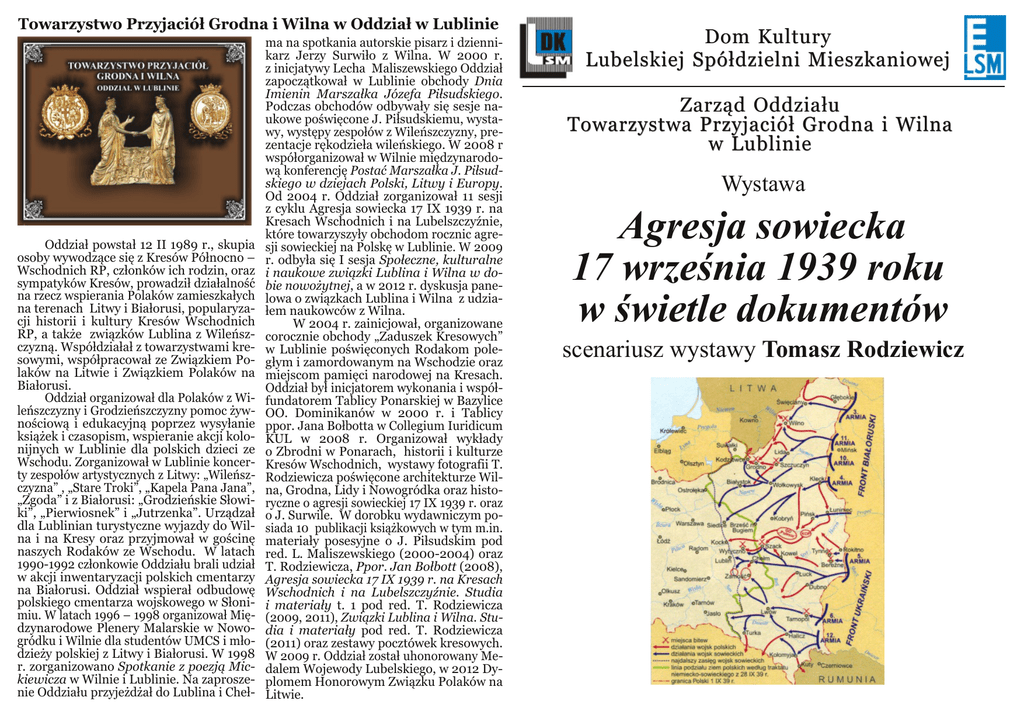Towarzystwo Przyjaciół Grodna i Wilna w Oddział w Lublinie Oddział powstał 12 II 1989 r., skupia osoby wywodzące się z Kresów Północno – Wschodnich RP, członków ich rodzin, oraz sympatyków Kresów, prowadził działalność na rzecz wspierania Polaków zamieszkałych na terenach Litwy i Białorusi, popularyza cji historii i kultury Kresów Wschodnich RP, a także związków Lublina z Wileńsz czyzną. Współdziałał z towarzystwami kre sowymi, współpracował ze Związkiem Po laków na Litwie i Związkiem Polaków na Białorusi. Oddział organizował dla Polaków z Wi leńszczyzny i Grodzieńszczyzny pomoc żyw nościową i edukacyjną poprzez wysyłanie książek i czasopism, wspieranie akcji kolo nijnych w Lublinie dla polskich dzieci ze Wschodu. Zorganizował w Lublinie koncer ty zespołów artystycznych z Litwy: „Wileńsz czyzna” , „Stare Troki”, „Kapela Pana Jana”, „Zgoda” i z Białorusi: „Grodzieńskie Słowi ki”, „Pierwiosnek” i „Jutrzenka”. Urządzał dla Lublinian turystyczne wyjazdy do Wil na i na Kresy oraz przyjmował w gościnę naszych Rodaków ze Wschodu. W latach 19901992 członkowie Oddziału brali udział w akcji inwentaryzacji polskich cmentarzy na Białorusi. Oddział wspierał odbudowę polskiego cmentarza wojskowego w Słoni miu. W latach 1996 – 1998 organizował Mię dzynarodowe Plenery Malarskie w Nowo gródku i Wilnie dla studentów UMCS i mło dzieży polskiej z Litwy i Białorusi. W 1998 r. zorganizowano Spotkanie z poezją Mic kiewicza w Wilnie i Lublinie. Na zaprosze nie Oddziału przyjeżdżał do Lublina i Cheł ma na spotkania autorskie pisarz i dzienni karz Jerzy Surwiło z Wilna. W 2000 r. z inicjatywy Lecha Maliszewskiego Oddział zapoczątkował w Lublinie obchody Dnia Imienin Marszałka Józefa Piłsudskiego. Podczas obchodów odbywały się sesje na ukowe poświęcone J. Piłsudskiemu, wysta wy, występy zespołów z Wileńszczyzny, pre zentacje rękodzieła wileńskiego. W 2008 r współorganizował w Wilnie międzynarodo wą konferencję Postać Marszałka J. Piłsud skiego w dziejach Polski, Litwy i Europy. Od 2004 r. Oddział zorganizował 11 sesji z cyklu Agresja sowiecka 17 IX 1939 r. na Kresach Wschodnich i na Lubelszczyźnie, które towarzyszyły obchodom rocznic agre sji sowieckiej na Polskę w Lublinie. W 2009 r. odbyła się I sesja Społeczne, kulturalne i naukowe związki Lublina i Wilna w do bie nowożytnej, a w 2012 r. dyskusja pane lowa o związkach Lublina i Wilna z udzia łem naukowców z Wilna. W 2004 r. zainicjował, organizowane corocznie obchody „Zaduszek Kresowych” w Lublinie poświęconych Rodakom pole głym i zamordowanym na Wschodzie oraz miejscom pamięci narodowej na Kresach. Oddział był inicjatorem wykonania i współ fundatorem Tablicy Ponarskiej w Bazylice OO. Dominikanów w 2000 r. i Tablicy ppor. Jana Bołbotta w Collegium Iuridicum KUL w 2008 r. Organizował wykłady o Zbrodni w Ponarach, historii i kulturze Kresów Wschodnich, wystawy fotografii T. Rodziewicza poświęcone architekturze Wil na, Grodna, Lidy i Nowogródka oraz histo ryczne o agresji sowieckiej 17 IX 1939 r. oraz o J. Surwile. W dorobku wydawniczym po siada 10 publikacji książkowych w tym m.in. materiały posesyjne o J. Piłsudskim pod red. L. Maliszewskiego (20002004) oraz T. Rodziewicza, Ppor. Jan Bołbott (2008), Agresja sowiecka 17 IX 1939 r. na Kresach Wschodnich i na Lubelszczyźnie. Studia i materiały t. 1 pod red. T. Rodziewicza (2009, 2011), Związki Lublina i Wilna. Stu dia i materiały pod red. T. Rodziewicza (2011) oraz zestawy pocztówek kresowych. W 2009 r. Oddział został uhonorowany Me dalem Wojewody Lubelskiego, w 2012 Dy plomem Honorowym Związku Polaków na Litwie. Dom Kultury Lubelskiej Spółdzielni Mieszkaniowej Zarząd Oddziału Towarzystwa Przyjaciół Grodna i Wilna w Lublinie Wystawa Agresja sowiecka 17 września 1939 roku w świetle dokumentów scenariusz wystawy Tomasz Rodziewicz ków w Katyniu i sowieckich łagrach. W dziale otwierającym wystawę znajduje się wybór artykułów ówczesnej prasy lubelskiej, m.in. z „Głosu Lubel skiego". Wywiad Woroszyłowa „Dlacze go Moskwa zdradziła koalicję" Takie ar tykuły, jak „Stalin gra na dwa fortepia ny" czy „Tajne klauzule paktu hitlerowskobolszewickiego zapewniają przewagę Rosji nad Niemcami", ilustru ją międzynarodową sytuację polityczną na miesiąc przed wybuchem II wojny światowej. Moment inwazji sowieckiej na Polskę w dniu 17 września 1939 r. po kazują fotografie przedstawiające nisz czenie polskich umocnień granicznych, marsz na Grodno, wkroczenie do Wil na, przygotowania do defilady w Białym stoku, ostatnie wydanie wileńskiego „Sło wa" z dnia 18 września 1939 r., wycinki artykułów z „Dziennika Chicagowskie go" na temat inwazji sowieckiej, ulotki sowieckie nawołujące żołnierzy do zabi jania polskich oficerów. Szczególnie interesująco prezentu je się fragment ekspozycji dotyczący walk Samodzielnej Grupy Operacyjnej „Pole sie" dowodzonej przez gen. Franciszka Kleeberga z wojskami sowieckimi. W do kumentach zdobytych przez żołnierzy SGO „Polesie", m.in. w rozkazie komisa rza politycznego sowieckiej IV Armii czy tamy: „Oddziały bohaterskiej Czerwonej Armii przekroczyły granicę Polski nio Zamierzeniem wystawy było sąc ze sobą swobodę i szczęście ludno zasygnalizowanie, w formie tematycz ści białoruskoukraińskiej oraz polskie nych działów, najważniejszych, wzajem mu narodowi. Dziś jak nigdy jeszcze każ nie ze sobą powiązanych wydarzeń hi dy szeregowiec, dowódca, pracownik storycznych związanych z agresją so polityczny winien wykazać czynem go wiecką, począwszy od paktu towość wypełnienia uroczystej przysię RibbentropMołotow, działań militar gi na wierność swemu narodowi, ojczyź nych Armii Czerwonej, oporu Wojska nie, rządowi, partii i Stalinowi". (...) Polskiego przeciwko sowieckim agreso rom, obrazu okupacji sowieckiej, współ Rodzie