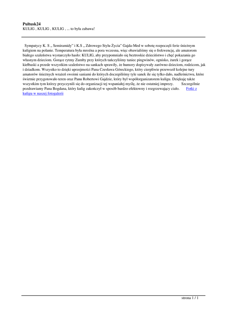 Pultusk24 KULIG , KULIG , KULIG , ... to była zabawa! Sympatycy K. S „ Semiramidy” i K.S „ Zdrowego Stylu Życia” Gajda-Med w sobotę rozpoczęli ferie śnieżnym kuligiem na polanie. Temperatura była mroźna a pora wczesna, więc obawialiśmy się o frekwencję, ale amatorom białego szaleństwa wystarczyło hasło: KULIG, aby przypomniało się beztroskie dzieciństwo i chęć pokazania go własnym dzieciom. Gorące rytmy Zumby przy których tańczyliśmy taniec pingwinów, ognisko, żurek i gorące kiełbaski a przede wszystkim szaleństwo na sankach sprawiły, że humory dopisywały zarówno dzieciom, rodzicom, jak i dziadkom. Wszystko to dzięki uprzejmości Pana Czesława Góreckiego, który cierpliwie przewoził kolejne tury amatorów śnieżnych wrażeń swoimi saniami do których doczepiliśmy tyle sanek ile się tylko dało, nadleśnictwu, które świetnie przygotowało teren oraz Panu Robertowi Gajdzie, który był współorganizatorem kuligu. Dziękuję także wszystkim tym którzy przyczynili się do organizacji tej wspaniałej myślę, że nie ostatniej imprezy. Szczególnie pozdrawiamy Pana Bogdana, który kulig zakończył w sposób bardzo efektowny i rozgrzewający ciało. Fotki z kuligu w naszej fotogalerii strona 1 / 1