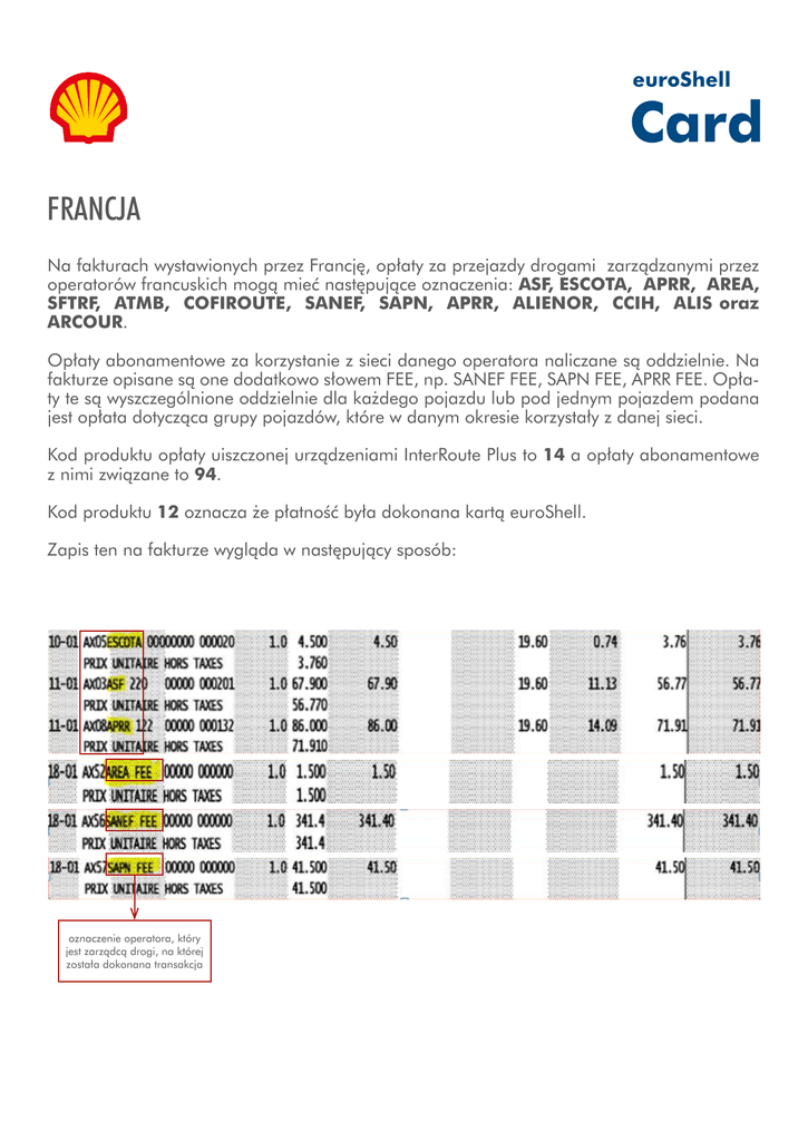 FRANCJA Na fakturach wystawionych przez Francję, opłaty za przejazdy drogami zarządzanymi przez operatorów francuskich mogą mieć następujące oznaczenia: ASF, ESCOTA, APRR, AREA, SFTRF, ATMB, COFIROUTE, SANEF, SAPN, APRR, ALIENOR, CCIH, ALIS oraz ARCOUR. Opłaty abonamentowe za korzystanie z sieci danego operatora naliczane są oddzielnie. Na fakturze opisane są one dodatkowo słowem FEE, np. SANEF FEE, SAPN FEE, APRR FEE. Opłaty te są wyszczególnione oddzielnie dla każdego pojazdu lub pod jednym pojazdem podana jest opłata dotycząca grupy pojazdów, które w danym okresie korzystały z danej sieci. Kod produktu opłaty uiszczonej urządzeniami InterRoute Plus to 14 a opłaty abonamentowe z nimi związane to 94. Kod produktu 12 oznacza że płatność była dokonana kartą euroShell. Zapis ten na fakturze wygląda w następujący sposób: oznaczenie operatora, który jest zarządcą drogi, na której została dokonana transakcja TIS PL FEE – jest to opłata abonamentowa pobierana przez operatora Axxes od łącznej kwoty netto od transakcji z całego poprzedniego miesiąca. - czyli np. w styczniu pobierana jest oplata za transakcje grudniowe, - opłaty są rozdzielane na Francję i Hiszpanię, - operator przypisuje opłatę zawsze do pierwszego zamawianego urządzenia, bez względu na to czy urządzenie jest aktywne czy nie. opłata pobierana przez operatora od łącznej kwoty netto transakcji z całego poprzedniego miesiąca. OBU – jest to opłata abonamentowa pobierana przez operatora od łącznej kwoty netto od transakcji z całego poprzedniego miesiąca w Belgii. OBU RENTAL – jest to opłata za wypożyczenie urządzenia TIS PL lub InterRoute Plus. Opłata jest przypisana do poszczególnych pojazdów. OBU SET UP FEE – jest to opłata za wydanie nowego urządzenia. Na fakturach francuskich są również naliczane opłaty za urządzenia Interroute Plus, które wyglądają w następujący sposób: Oznaczenie opłaty pobieranej za urządzenie Interroute Plus Motorway – oznacza opłatę za przejazd drogowy opłacony kartą EuroShell na bramce