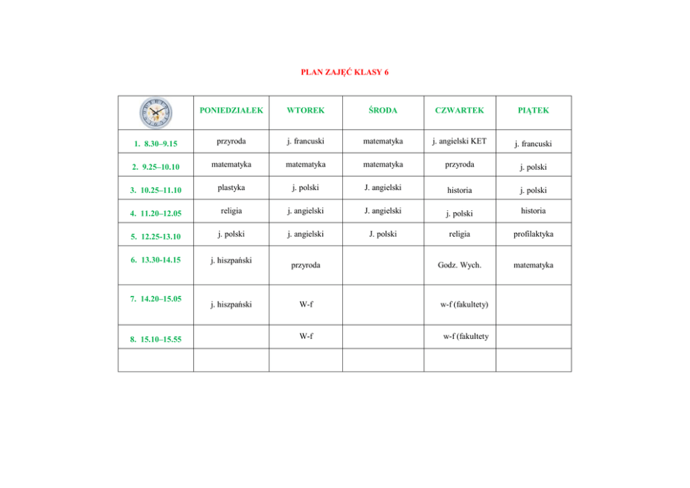 PLAN ZAJĘĆ KLASY 6 PONIEDZIAŁEK WTOREK ŚRODA CZWARTEK PIĄTEK 1. 8.30–9.15 przyroda j. francuski matematyka j. angielski KET j. francuski 2. 9.25–10.10 matematyka matematyka matematyka przyroda j. polski 3. 10.25–11.10 plastyka j. polski J. angielski historia j. polski 4. 11.20–12.05 religia j. angielski J. angielski j. polski historia 5. 12.25-13.10 j. polski j. angielski J. polski religia profilaktyka 6. 13.30-14.15 j. hiszpański Godz. Wych. matematyka 7. 14.20–15.05 8. 15.10–15.55 j. hiszpański przyroda W-f w-f (fakultety) W-f w-f (fakultety