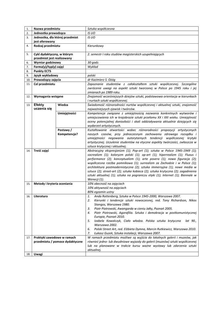 Nazwa przedmiotu Jednostka prowadząca Jednostka, dla której przedmiot jest oferowany Rodzaj przedmiotu Sztuka współczesna IS UO IS UO 2. semestr I roku studiów magisterskich uzupełniających 6. 7. 8. 9. 10. 11. Cykl dydaktyczny, w którym przedmiot jest realizowany Wymiar godzinowy Forma(y)/typ(y) zajęć Punkty ECTS Język wykładowy Prowadzący zajęcia Cel przedmiotu 12. Wymagania wstępne 13. Efekty uczenia się 1. 2. 3. 4. 5. Wiedza Umiejętności Postawy / Kompetencje? 14. Treść zajęć 15. Metody i kryteria oceniania 16. Literatura 17. Praktyki zawodowe w ramach przedmiotu / pomoce dydaktyczne 18. Uwagi Kierunkowy 30 godz. Wykład polski dr Kazimierz S. Ożóg Zapoznanie studentów z całokształtem sztuki współczesnej. Szczególne zwrócenie uwagi na aspekt sztuki tworzonej w Polsce po 1945 roku i jej zmianach po 1989 roku. Znajomość wcześniejszych dziejów sztuki, podstawowa orientacja w kierunkach i nurtach sztuki współczesnej. Świadomość różnorodności nurtów współczesnej i aktualnej sztuki, znajomość najważniejszych zjawisk i twórców. Kompetencje związane z umiejętnością nazwania konkretnych wytworów i umiejscowienia ich w krajobrazie sztuki przełomu XX i XXI wieku. Umiejętność oceny potencjalnej doniosłości i skali oddziaływania aktualnie dziejących się wydarzeń artystycznych. Kształtowanie otwartości wobec różnorodności propozycji artystycznych naszych czasów, przy jednoczesnym zachowaniu zdrowego rozsądku i umiejętności negowania autorytarnych tendencji współczesnej krytyki artystycznej. Uczulenie studentów na etyczne aspekty twórczości, zwłaszcza w sztuce krytycznej i aktualnej. Abstracyjny ekspresjonizm (1); Pop-art (1); sztuka w Polsce 1945-1949 (1); socrealizm (1); koloryzm polski (1); op-art (1); hiperrealizm (1); Fluxus i performance (2); konceptualizm (1); arte povera (1); nowa figuracja (2); współczesna rzeźba pomnikowa (1); surrealizm za Zachodzie i w Polsce (1); architektura postmodernistyczna (2); sztuka immersyjna (1); nowe media w sztuce (2); street-art (2); sztuka kobieca (2); sztuka krytyczna (2); zagadnienia sztuki aktualnej (1); sztuka na pograniczu etyki (1); Internet (1); Biennale w Wenecji (1). 10% obecność na zajęciach 10% aktywność na zajęciach 80% egzamin ustny 1. Anda Rottenberg, Sztuka w Polsce 1945-2000, Warszawa 2007. 2. Kierunki i tendencje sztuki nowoczesnej, red. Tony Richardson, Nikos Stangos, Warszawa 1980. 3. Piotr Piotrowski, Awangarda w cieniu Jałty, Poznań 2005. 4. Piotr Piotrowski, Agorafilia. Sztuka i demokracja w postkomunistycznej Europie, Poznań 2010. 5. Izabela Kowalczyk, Ciało władza. Polska sztuka krytyczna lat 90., Warszawa 2002. 6. Polski Street Art, red. Elżbieta Dymna, Marcin Rutkiewicz, Warszawa 2010. 7. Łukasz Guzek, Sztuka instalacji, Warszawa 2007. W ramach przedmiotu możliwe są wyjścia do lokalnych galerii i muzeów, jak również jedno- lub dwudniowe wyjazdy do galerii (muzeów) sztuki współczesnej lub na planowane w trakcie kursu ważne wystawy lub zdarzenia sztuki aktualnej.