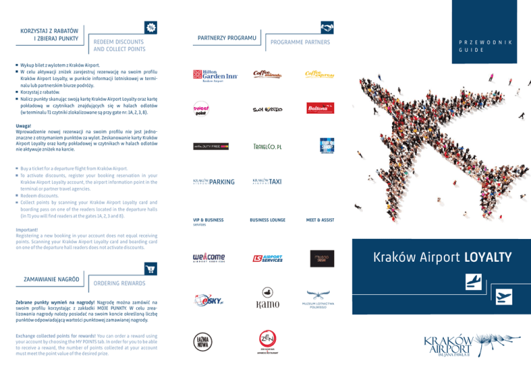 KORZYSTAJ Z RABATÓW I ZBIERAJ PUNKTY REDEEM DISCOUNTS AND COLLECT POINTS PARTNERZY PROGRAMU PROGRAMME PARTNERS P R Z E W O D N I K G U I D E Wykup bilet z wylotem z Kraków Airport. W celu aktywacji zniżek zarejestruj rezerwację na swoim profilu Kraków Airport Loyalty, w punkcie informacji lotniskowej w terminalu lub partnerskim biurze podróży. Korzystaj z rabatów. Nalicz punkty skanując swoją kartę Kraków Airport Loyalty oraz kartę pokładową w czytnikach znajdujących się w halach odlotów (w terminalu T1 czytniki zlokalizowane są przy gate nr: 1A, 2, 3, 8). Uwaga! Wprowadzenie nowej rezerwacji na swoim profilu nie jest jednoznaczne z otrzymaniem punktów za wylot. Zeskanowanie karty Kraków Airport Loyalty oraz karty pokładowej w czytnikach w halach odlotów nie aktywuje zniżek na karcie. Buy a ticket for a departure flight from Kraków Airport. To activate discounts, register your booking reservation in your Kraków Airport Loyalty account, the airport information point in the terminal or partner travel agencies. Redeem discounts. Collect points by scanning your Kraków Airport Loyalty card and boarding pass on one of the readers located in the departure halls (in T1 you will find readers at the gates 1A, 2, 3 and 8). VIP & BUSINESS BUSINESS LOUNGE MEET & ASSIST services Important! Registering a new booking in your account does not equal receiving points. Scanning your Kraków Airport Loyalty card and boarding card on one of the departure hall readers does not activate discounts. Kraków Airport LOYALTY ZAMAWIANIE NAGRÓD ORDERING REWARDS Zebrane punkty wymień na nagrody! Nagrodę można zamówić na swoim profilu korzystając z zakładki MOJE PUNKTY. W celu zrealizowania nagrody należy posiadać na swoim koncie określoną liczbę punktów odpowiadającą wartości punktowej zamawianej nagrody. Exchange collected points for rewards! You can order a reward using your account by choosing the MY POINTS tab. In order for you to be able to receive a reward, the number of points collected at your account must meet the point value of the desired prize. Kraków Airport Loyalty to program lojalnościowy dostępny dla wszystkich pasażerów portu lotniczego powyżej 18 roku życia. Członkostwo jest bezpłatne, a uczestnicy otrzymują dostęp do Katalogu Korzyści adekwatnie do rodzaju karty którą posiadają. Katalog Korzyści obejmuje m.in. rabaty w sklepach, punktach gastronomicznych, salonach Business Lounge, instytucjach, specjalną ofertę parkingową oraz możliwość zbierania punktów za każdy wylot. W ramach programu dostępne są dwa poziomy: Kraków Airport Loyalty oraz Kraków Airport Loyalty Prestige. Uczestnicy programu zaczynają udział od poziomu podstawowego. Zbierając punkty za każdy wylot z Krakowa mogą je następnie wymieniać na nagrody rzeczowe lub wyższy poziom programu tj. Prestige. Wyższy poziom członkostwa to większy zakres oferowanych korzyści oraz wyższe zniżki. Kraków Airport Loyalty is a loyalty programme available to all passengers of Kraków Airport over 18 years of age. The membership is free of charge and entitles members to a number of benefits as per their membership level. The benefits include special prices at shops, dining places, Business Lounge Area, and institutions, as well as parking offers and a chance to collect promotional points at each departure. The programme includes two membership levels: Kraków Airport Loyalty and Kraków Airport Loyalty Prestige. The members begin with a basic level membership. The points collected at each departure can be exchanged for special rewards or for a Prestige membership. A higher membership level entitles the members to a broader range of benefits and higher discounts. REJESTRACJA DO PROGRAMU KATALOG KORZYŚCI ORAZ RABATY krakowairport.pl/loyalty CATALOGUE OF BENEFITS AND DISCOUNTS Uczestnik programu Kraków Airport Loyalty uprawniony jest do otrzymywania rabatów zgodnie ze statusem karty jaki posiada (Kraków Airport Loyalty lub Kraków Airport Loyalty Prestige). Rabaty na karcie Kraków Airport Loyalty są jednorazowe i ważne przez jeden miesiąc od dnia wylotu. W celu ponownej aktywacji rabatów należy zarejestrować nowy wylot albo na swoim koncie Kraków Airport Loyalty, w punkcie informacji lotniskowej lub w partnerskim biurze podróży. Posiadacze kart Kraków Airport Loyalty Prestige otrzymują nielimitowaną ilość rabatów. korzyści benefits parking wielopoziomowy multi-storey parking lot wartość value parking krótkoterminowy short-term car park 10% - 15% on accommodation 10% on breakfast and quick lunch 10% - 15% on a'la carte restaurant menu and bar pakiet kawa&parking (oferta na parking krótkoterminowy) coffee&parking package (short-term car park offer) REGISTRATION FOR THE PROGRAMME Rejestracji do programu można dokonać: - na stronie krakowairport.pl/loyalty* - w punkcie informacji lotniskowej w terminalu - w partnerskich biurach podróży (lista partnerskich biur dostępna jest na stronie krakowairport.pl/loyalty) * Kartę wysyłamy do dwóch dni roboczych od dnia rejestracji do programu (priorytet Poczta Polska). Jeśli wylot ma nastąpić w ciągu 7 dni od dnia rejestracji, radzimy zarejestrować się do programu i wyrobić kartę na lotnisku, w punkcie informacji lotniskowej. You can register for the programme at: - the krakowairport.pl/loyalty website* - the airport information point in terminal - partner travel agencies (the list available at krakowairport.pl/loyalty) * The card will be sent within two working days of submitting the form (by Poczta Polska priority mail). If your flight is scheduled within 7 days of the registration date, we recommend registering and having your card issued at the airport information point. barki / restauracje bars / restaurants 10% - 25% sklepy shops 5% - 10% Taxi 10% Business Lounges 10% - 20% Meet & Assist 25% Business Check-in Line koordynacja Business Check-in: LS Airport Services oraz Welcome Airport Services