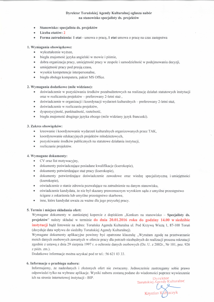 Dyrektor Toruriskiej Agendy Kulturalnej oglaszanab6r na stanowisko specjalisty ds. projektdw O Stanowisko: specjalistads. projekt6w o Liczba etat6w:2 Forma zatrudnienia: I etat - umowa o pracQ,I etat umowa o pracQna czaszastppstwa o 1. Wymagania obowiqzkowe: o wyksrtaLcenie wylsze, . biegla znajomoSdjprrykaangielski w mowie i piSmie, o o dobra organizacjapracy,umiejptnoSipracy w zespolei samodzielnoSiw podejmowaniu decyzji, umiejgtnoScpracy pod presjq czasu, o wysokiekompetencjeinterpersonalne, r biegla obslugakomputera,pakiet MS Office. 2. Wymagania dodatkowe (mile widziane): e doSwiadczeniew pozyskiwaniu Srodk6w pozabudZetowychna realizacjp dziataf statutowych instytucji orazw rozliczeniu projekt6w - preferowany 2-letni sta?, o doSwiadczeniew organizacji i koordynacji wydarzeri kulturalnych - preferowany 2-letni stul, o o o doSwiadczeniew rozliczaniu projekt6w, dyspozycyjnofi(,punktualnoSi,rzetelnoSi, biegla majomoSi drugiego jEzrykaobcego (mile widziany jezyk francuski). 3. Zakres obowi4zk6w: . kreowanie i koordynowanie wydarzeft kulturalnych organizowanychprzez TAK, o koordynowanieedukacyjnychprojekt6w mlodziezowych, . pozyskiwanie Srodk6w publiczrych na statutowe dziahaniainstytucji, c rozliczanieprojekt6w. 4. Wymagane dokumenty: o CV oraz list motywacyjny, o dokumenty poSwiadczajqce posiadane kwali fi kacj e (kserokopie), O dokumenty potw ier dzajqce sta2pr acy (kserokopie), o dokumenty potwierdzajqce doSwiadczenie zawodowe oraz wiedzp specjalistyczn4 i umiejgtnoSci (kserokopie), a oSwiadczenieo stanie zdrowia pozwalajqcena zatrudnieniena danym stanowisku, o5wiadczeniekandydata,2enie byl skazanyprawomocnym wyrokiem s4duz umySlneprzestgpstwo Sciganez oskarhenialub umySlne przestqpstwoskarbowe, inne, kt6re kandydatuwahazawahne dla jego prryszlej pracy. o 5. Termin i miejsce skladania ofert: Wymagane dokumenty w zamkniptej kopercie z dopiskiem ,,Konkurs na stanowisko - Specjalisty ds. projekt6w" nale?y skladad w terminie do dnia 20.01.2016 roku do godziny 14.00 w siedzibie instytucjibqd? listownie na adres:ToruriskaAgenda Kulturalna ul. Pod KrzywqWieaq 1,87-100 Toruri (decydujedata wptywu do siedziby Toruriskiej Agendy Kulturalnej). Wymagane dokumenty aplikacyjne powinny byd opatrzone klauzulq: ,,Wyralam zgodg na przetwarzanie moich danych osobowych zawartych w ofercie pracy dlapotrzeb niezbEdnychdo realizacji procesu rekrutacji zgodnie z ustaw4z dnia 29 sierpnia 1997r. o ochronie danych osobowych(Dz. U. 22002r., Nr l0l, poz. 926 zp62n. zm.). Dodatkowe informacje mozna uzyska6pod nr tel.: 56 621 03 33. 6. Informacje o przebiegu naboru: Informujemy, 2e nadeslanych i ztohonych ofert nie zwracamy. JednoczeSnie zastrzegamy sobie prawo odpowiedzi tylko na wybrane aplikacje. Wyniki naboru zostan4podanedo wiadomoScipoprzez wywies zenie ich na stronie internetowejinstytucji - BIP. Df iektor Torufi skie'i A gen dY Ku1ruralne Krystian ac'ak
