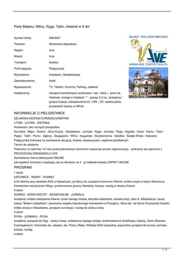 Na trasie: Wigry - Kowno - Góra Krzyży - Skaistkalne - Jurmala - Ryga - Jurmala - Ryga - Sigulda - Cesis - Parnu - Tartu Peipsi - Tallin - Parnu - Agłona - Daugopolis - Wilno - Augustów - Studzieniczna - Sokółka - Święta Woda - Katowice