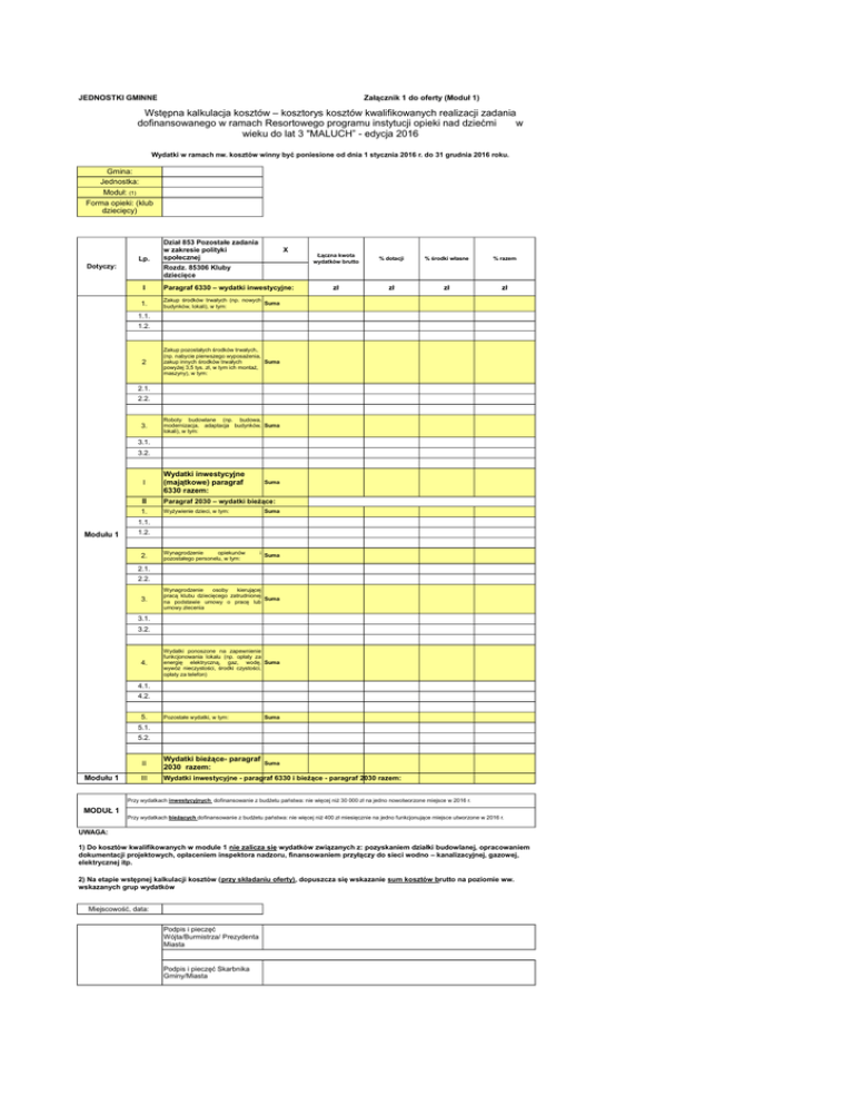 JEDNOSTKI GMINNE Załącznik 1 do oferty (Moduł 1) Wstępna kalkulacja kosztów – kosztorys kosztów kwalifikowanych realizacji zadania dofinansowanego w ramach Resortowego programu instytucji opieki nad dziećmi w wieku do lat 3 "MALUCH” - edycja 2016 Wydatki w ramach nw. kosztów winny być poniesione od dnia 1 stycznia 2016 r. do 31 grudnia 2016 roku. Gmina: Jednostka: Moduł: (1) Forma opieki: (klub dziecięcy) Lp. Dotyczy: Dział 853 Pozostałe zadania w zakresie polityki społecznej X Rozdz. 85306 Kluby dziecięce I 1. Paragraf 6330 – wydatki inwestycyjne: Łączna kwota wydatków brutto % dotacji % środki własne % razem zł zł zł zł Zakup środków trwałych (np. nowych Suma budynków, lokali), w tym: 1.1. 1.2. 2 Zakup pozostałych środków trwałych, (np. nabycie pierwszego wyposażenia, zakup innych środków trwałych Suma powyżej 3,5 tys. zł, w tym ich montaż, maszyny), w tym: 2.1. 2.2. 3. Roboty budowlane (np. budowa, modernizacja, adaptacja budynków, Suma lokali), w tym: 3.1. 3.2. I Wydatki inwestycyjne (majątkowe) paragraf 6330 razem: II Paragraf 2030 – wydatki bieżące: 1. Wyżywienie dzieci, w tym: Suma Suma 1.1. Modułu 1 1.2. 2. Wynagrodzenie opiekunów pozostałego personelu, w tym: i Suma 2.1. 2.2. 3. Wynagrodzenie osoby kierującej pracą klubu dziecięcego zatrudnionej Suma na podstawie umowy o pracę lub umowy zlecenia 3.1. 3.2. 4. Wydatki ponoszone na zapewnienie funkcjonowania lokalu (np. opłaty za energię elektryczną, gaz, wodę, Suma wywóz nieczystości, środki czystości, opłaty za telefon) 4.1. 4.2. 5. Pozostałe wydatki, w tym: Suma II Wydatki bieżące- paragraf 2030 razem: Suma III Wydatki inwestycyjne - paragraf 6330 i bieżące - paragraf 2030 razem: 5.1. 5.2. Modułu 1 Przy wydatkach inwestycyjnych dofinansowanie z budżetu państwa: nie więcej niż 30 000 zł na jedno nowotworzone miejsce w 2016 r. MODUŁ 1 Przy wydatkach bieżących dofinansowanie z budżetu państwa: nie więcej niż 400 zł miesięcznie na jedno funkcjonujące miejsce utworzone w 2016 r. UWAGA: 1) Do kosztów kwalifikowanych w module 1 nie zalicza się wydatków związanych z: pozyskaniem działki budowlanej, opracowaniem dokumentacji projektowych, opłaceniem inspektora nadzoru, finansowaniem przyłączy do sieci wodno – kanalizacyjnej, gazowej, elektrycznej itp. 2) Na etapie wstępnej kalkulacji kosztów (przy składaniu oferty), dopuszcza się wskazanie sum kosztów brutto na poziomie ww. wskazanych grup wydatków Miejscowość, data: Podpis i pieczęć Wójta/Burmistrza/ Prezydenta Miasta Podpis i pieczęć Skarbnika Gminy/Miasta