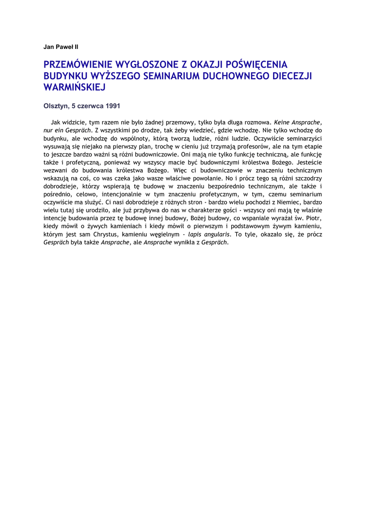 Jan Paweł II PRZEMÓWIENIE WYGŁOSZONE Z OKAZJI POŚWIĘCENIA BUDYNKU WYŻSZEGO SEMINARIUM DUCHOWNEGO DIECEZJI WARMIŃSKIEJ Olsztyn, 5 czerwca 1991 Jak widzicie, tym razem nie było żadnej przemowy, tylko była długa rozmowa. Keine Ansprache, nur ein Gespräch. Z wszystkimi po drodze, tak żeby wiedzieć, gdzie wchodzę. Nie tylko wchodzę do budynku, ale wchodzę do wspólnoty, którą tworzą ludzie, różni ludzie. Oczywiście seminarzyści wysuwają się niejako na pierwszy plan, trochę w cieniu już trzymają profesorów, ale na tym etapie to jeszcze bardzo ważni są różni budowniczowie. Oni mają nie tylko funkcję techniczną, ale funkcję także i profetyczną, ponieważ wy wszyscy macie być budowniczymi królestwa Bożego. Jesteście wezwani do budowania królestwa Bożego. Więc ci budowniczowie w znaczeniu technicznym wskazują na coś, co was czeka jako wasze właściwe powołanie. No i prócz tego są różni szczodrzy dobrodzieje, którzy wspierają tę budowę w znaczeniu bezpośrednio technicznym, ale także i pośrednio, celowo, intencjonalnie w tym znaczeniu profetycznym, w tym, czemu seminarium oczywiście ma służyć. Ci nasi dobrodzieje z różnych stron - bardzo wielu pochodzi z Niemiec, bardzo wielu tutaj się urodziło, ale już przybywa do nas w charakterze gości - wszyscy oni mają tę właśnie intencję budowania przez tę budowę innej budowy, Bożej budowy, co wspaniale wyrażał św. Piotr, kiedy mówił o żywych kamieniach i kiedy mówił o pierwszym i podstawowym żywym kamieniu, którym jest sam Chrystus, kamieniu węgielnym - lapis angularis. To tyle, okazało się, że prócz Gespräch była także Ansprache, ale Ansprache wynikła z Gespräch.