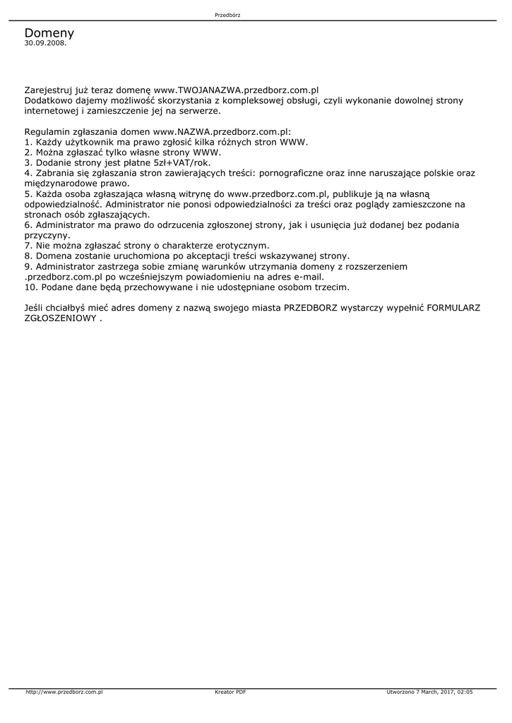 Przedbórz Domeny 30.09.2008. Zarejestruj już teraz domenę www.TWOJANAZWA.przedborz.com.pl Dodatkowo dajemy możliwość skorzystania z kompleksowej obsługi, czyli wykonanie dowolnej strony internetowej i zamieszczenie jej na serwerze. Regulamin zgłaszania domen www.NAZWA.przedborz.com.pl: 1. Każdy użytkownik ma prawo zgłosić kilka różnych stron WWW. 2. Można zgłaszać tylko własne strony WWW. 3. Dodanie strony jest płatne 5zł+VAT/rok. 4. Zabrania się zgłaszania stron zawierających treści: pornograficzne oraz inne naruszające polskie oraz międzynarodowe prawo. 5. Każda osoba zgłaszająca własną witrynę do www.przedborz.com.pl, publikuje ją na własną odpowiedzialność. Administrator nie ponosi odpowiedzialności za treści oraz poglądy zamieszczone na stronach osób zgłaszających. 6. Administrator ma prawo do odrzucenia zgłoszonej strony, jak i usunięcia już dodanej bez podania przyczyny. 7. Nie można zgłaszać strony o charakterze erotycznym. 8. Domena zostanie uruchomiona po akceptacji treści wskazywanej strony. 9. Administrator zastrzega sobie zmianę warunków utrzymania domeny z rozszerzeniem .przedborz.com.pl po wcześniejszym powiadomieniu na adres e-mail. 10. Podane dane będą przechowywane i nie udostępniane osobom trzecim. Jeśli chciałbyś mieć adres domeny z nazwą swojego miasta PRZEDBORZ wystarczy wypełnić FORMULARZ ZGŁOSZENIOWY . http://www.przedborz.com.pl Kreator PDF Utworzono 7 March, 2017, 02:05