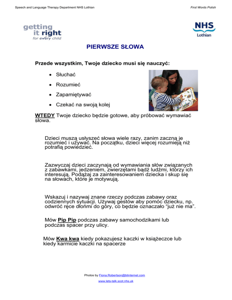 Speech and Language Therapy Department NHS Lothian First Words Polish PIERWSZE SŁOWA Przede wszystkim, Twoje dziecko musi się nauczyć: Słuchać Rozumieć Zapamiętywać Czekać na swoją kolej WTEDY Twoje dziecko będzie gotowe, aby próbować wymawiać słowa. Dzieci muszą usłyszeć słowa wiele razy, zanim zaczną je rozumieć i używać. Na początku, dzieci więcej rozumieją niż potrafią powiedzieć. Zazwyczaj dzieci zaczynają od wymawiania słów związanych z zabawkami, jedzeniem, zwierzętami bądź ludźmi, którzy ich interesują. Podążaj za zainteresowaniem dziecka i skup się na słowach, które je motywują. Wskazuj i nazywaj znane rzeczy podczas zabawy oraz codziennych sytuacji. Używaj gestów aby pomóc dziecku, np. odwróć ręce dłońmi do góry, co będzie oznaczało “już nie ma”. Mów Pip Pip podczas zabawy samochodzikami lub podczas spacer przy ulicy. Mów Kwa kwa kiedy pokazujesz kaczki w książeczce lub kiedy karmicie kaczki na spacerze Photos by [email protected] www.lets-talk.scot.nhs.uk Mów Halo/Pa pa kiedy rozmawiasz przez telefon zabawkowy; zachęcaj, aby dziecko machało babci na do widzenia Zapytaj Jeszcze? czy dziecko chce abyście pobawili się “jeszcze raz” w jego ulubioną zabawę, np. łaskotanie, puszczanie baniek mydlanych, budowanie wieży z klocków. Mów Do góry kiedy podnosisz dziecko z łóżeczka lub kiedy wchodzicie do góry po schodach. Mów Nie ma kiedy chowasz zabawki pod kocykiem lub kiedy zjecie obiad. Powiedz słowo i poczekaj – daj dziecku czas aby spróbowało je powtórzyć. Czasem dziecko nie powtórzy nowego słowa. Ważne jest, aby nie stresować dziecka i nie wywierać presji poprzez naleganie aby spróbowało powiedzieć jakieś słowo. Rozwijaj pewność siebie u dziecka chwaląc każdą próbę wymówienia słowa. Nie martw się, jeśli na początku dziecko nie mówi wyraźnie. Jeśli wydaje Ci się, że usłyszałe/aś jakieś słowo, uznaj, że je usłyszałeś/aś i powtórz je, np. “tak, to jest banan.” Pomóż dziecku zapewniając mu wyboór. Pozwoli mu to najpierw usłyszeć słowo a potem spróbować odpowiedzieć, np. “Chcesz mleko czy wodę?.” Dużo chwal swoje dziecko za to, że próbuje wymówić dane słowo. Photos by [email protected] www.lets-talk.scot.nhs.uk