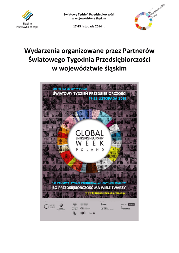 Światowy Tydzieo Przedsiębiorczości w województwie śląskim 17-23 listopada 2014 r. Wydarzenia organizowane przez Partnerów Światowego Tygodnia Przedsiębiorczości w województwie śląskim Światowy Tydzieo Przedsiębiorczości w województwie śląskim 17-23 listopada 2014 r. Akademia Techniczno-Humanistyczna w Bielsku-Białej.......................................................................... 3 Miasto Dąbrowa Górnicza ....................................................................................................................... 4 Agencja Promocji Ziemi Raciborskiej i Wspierania Przedsiębiorczości na Zamku Piastowskim w Raciborzu ............................................................................................................................................. 6 Górnośląska Agencja Przedsiębiorczości i Rozwoju sp. z o.o. - Enterprise Europe Network ................. 7 Punkt Informacji Europejskiej Europe Direct – Śląsk .............................................................................. 8 Inkubator Przedsiębiorczości Sp. z o. o. w Tarnowskich Górach............................................................. 8 Uniwersytet Śląski w Katowicach - Biuro Współpracy z Gospodarką/ Biuro Karier ................................ 9 Urząd Marszałkowski Województwa Śląskiego..................................................................................... 10 Stowarzyszenie Rozwoju Wsi Chruszczobród i Chruszczobród Piaski ................................................... 11 Wyższa Szkoła Humanitas w Sosnowcu ................................................................................................ 12 Powiatowy Urząd Pracy w Katowicach.................................................................................................. 10 Urząd Miejski w Zabrzu, Zabrzaoskie Centrum Rozwoju Przedsiębiorczości ........................................ 13 Powiatowy Urząd Pracy w Bytomiu ...................................................................................................... 14 Zamek Cieszyn ....................................................................................................................................... 15 Śląskie Centrum Przedsiębiorczości ...................................................................................................... 17 FISCAL S.C. ............................................................................................................................................. 17 Wojewódzki Urząd Pracy w Katowicach................................................................................................ 18 Politechnika Częstochowska ................................................................................................................. 20 Punkt Pośrednictwa Pracy OHP z Sosnowca ......................................................................................... 21 Górnośląska Agencja Rozwoju Regionalnego S.A.................................................................................. 22 Centrum Innowacji i Transferu Technologii Politechniki Śląskiej. ......................................................... 24 Uniwersytet Ekonomiczny w Katowicach oraz Instytut Technik Innowacyjnych EMAG. ...................... 23 Patroni medialni: WYDZIAŁ GOSPODARKI, PROMOCJI I WSPÓŁPRACY MIĘDZYNARODOWEJ Urząd Marszałkowski Województwa Śląskiego, ul. Ligonia 46, 40-037 Katowice tel.: 32 77 40 002, fax: 32 77 40 979, email: [email protected], www.slaskie.pl 2 Światowy Tydzieo Przedsiębiorczości w województwie śląskim 17-23 listopada 2014 r. Organizator: Akademia Techniczno-Humanistyczna w Bielsku-Białej Miejsce: Akademia Techniczno-Humanistyczna w Bielsku-Białej, ul. Willowa 2, Bielsko-Biała. Terminy wydarzeo: 18 listopada 2014 godz. 11.15-13.15 Chłopska Szkoła Biznesu. godz. 10.00-14.00 Tajniki Assessment Center. 19 listopada 2014 godz. 14.00-16.00 Jak zaplanowad własną firmę. Budowanie modeli biznesowych – wykład. 20 listopada 2014 (oraz 27 listopada) godz. 10.00-13.00 Negocjacje w biznesie – wykład. 21 listopada 2014 (oraz 28 listopada) godz. 12.00-15.00 Biznes plan – wykład. Szczegóły i rejestracja: http://www.biurokarier.ath.bielsko.pl Kontakt: Izabela Konior, tel.: 33 8279 419, [email protected] Patroni medialni: WYDZIAŁ GOSPODARKI, PROMOCJI I WSPÓŁPRACY MIĘDZYNARODOWEJ Urząd Marszałkowski Województwa Śląskiego, ul. Ligonia 46, 40-037 Katowice tel.: 32 77 40 002, fax: 32 77 40 979, email: [email protected], www.slaskie.pl 3 Światowy Tydzieo Przedsiębiorczości w województwie śląskim 17-23 listopada 2014 r. Organizator: Miasto Dąbrowa Górnicza Miejsce: różne lokalizacje. Terminy wydarzeo: 17 listopada 2014 godz. 8.00-10.00 Zostao przedsiębiorcą! – praktyczne szkolenie z zakładania własnej działalności gospodarczej dzięki dotacji z Powiatowego Urzędu Pracy w Dąbrowie Górniczej. godz. 10.30-14.00 Czym jest przedsiębiorczośd? – warsztaty dla młodzieży. Inkubator Społecznej Przedsiębiorczości, Miejska Biblioteka Publiczna, ul. Kościuszki 25, Dąbrowa Górnicza. godz. 16.00 Inauguracja Ligi Młodych Przedsiębiorców. „Kosmos biznesu. Gwiazdozbiory przedsiębiorczości”. Wykład inauguracyjny dr inż. Mariusza Kruczka z Politechniki Śląskiej w Katowicach. Miejska Biblioteka Publiczna, ul. Kościuszki 25, Dąbrowa Górnicza. 18 listopada 2014 godz. 9.00-10.00 Rola pracodawców w kształceniu zawodowym. Kształcenie dualne – konferencja. godz. 11.00-13.00 Mistrz i uczeo – (przed)smak sukcesu zawodowego – konkurs. Zespół Szkół Ekonomicznych im. Karola Adamieckiego, Al. Piłsudskiego 5, Dąbrowa Górnicza. 19 listopada 2014 godz. 9.00-10.00 Inteligencja Przedsiębiorczości – nowe horyzonty prowadzenia biznesu – wykład inauguracyjny prof. nadzw. dr hab. inż. Marek Jabłooski, Katedra Zarządzania Wyższej Szkoły Biznesu w Dąbrowie Górniczej. Wyższa Szkoł