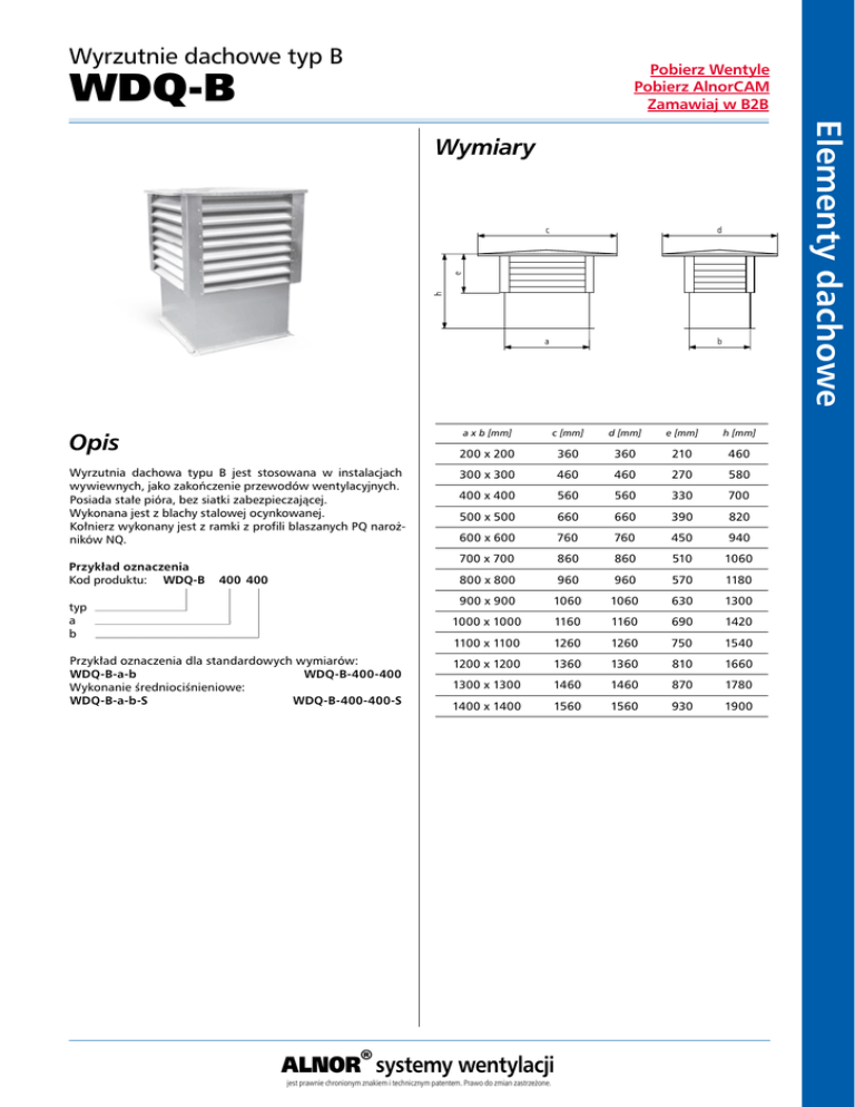 Wyrzutnie dachowe typ B Pobierz Wentyle Pobierz AlnorCAM Zamawiaj w B2B WDQ-B Elementy dachowe Wymiary Opis Wyrzutnia dachowa typu B jest stosowana w instalacjach wywiewnych, jako zakończenie przewodów wentylacyjnych. Posiada stałe pióra, bez siatki zabezpieczającej. Wykonana jest z blachy stalowej ocynkowanej. Kołnierz wykonany jest z ramki z profili blaszanych PQ narożników NQ. Przykład oznaczenia Kod produktu: WDQ-B 400 400 typ a b Przykład oznaczenia dla standardowych wymiarów: WDQ-B-a-b WDQ-B-400-400 Wykonanie średniociśnieniowe: WDQ-B-a-b-S WDQ-B-400-400-S a x b [mm] c [mm] d [mm] e [mm] h [mm] 200 x 200 360 360 210 460 300 x 300 460 460 270 580 400 x 400 560 560 330 700 500 x 500 660 660 390 820 600 x 600 760 760 450 940 700 x 700 860 860 510 1060 800 x 800 960 960 570 1180 900 x 900 1060 1060 630 1300 1000 x 1000 1160 1160 690 1420 1100 x 1100 1260 1260 750 1540 1200 x 1200 1360 1360 810 1660 1300 x 1300 1460 1460 870 1780 1400 x 1400 1560 1560 930 1900 ALNOR® systemy wentylacji jest prawnie chronionym znakiem i technicznym patentem. Prawo do zmian zastrzeżone.