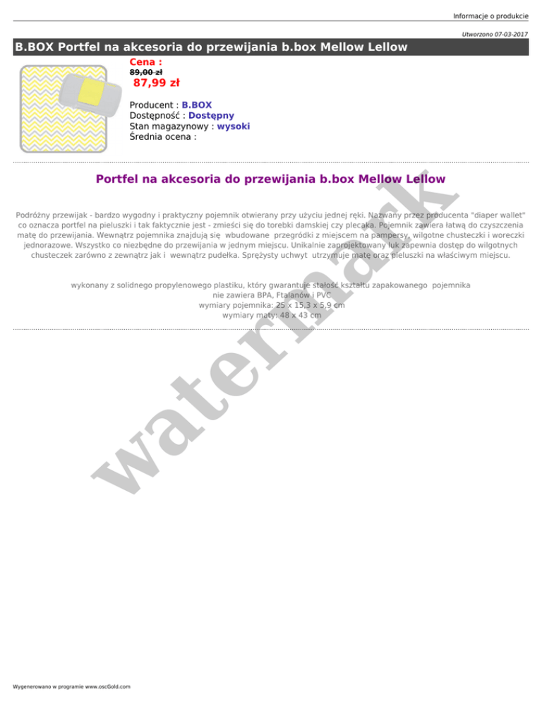 Informacje o produkcie Utworzono 07-03-2017 B.BOX Portfel na akcesoria do przewijania b.box Mellow Lellow Cena : 89,00 zł 87,99 zł Producent : B.BOX Dostępność : Dostępny Stan magazynowy : wysoki Średnia ocena : er m ar k Portfel na akcesoria do przewijania b.box Mellow Lellow Podróżny przewijak - bardzo wygodny i praktyczny pojemnik otwierany przy użyciu jednej ręki. Nazwany przez producenta "diaper wallet" co oznacza portfel na pieluszki i tak faktycznie jest - zmieści się do torebki damskiej czy plecaka. Pojemnik zawiera łatwą do czyszczenia matę do przewijania. Wewnątrz pojemnika znajdują się wbudowane przegródki z miejscem na pampersy, wilgotne chusteczki i woreczki jednorazowe. Wszystko co niezbędne do przewijania w jednym miejscu. Unikalnie zaprojektowany luk zapewnia dostęp do wilgotnych chusteczek zarówno z zewnątrz jak i wewnątrz pudełka. Sprężysty uchwyt utrzymuje matę oraz pieluszki na właściwym miejscu. w at wykonany z solidnego propylenowego plastiku, który gwarantuje stałość kształtu zapakowanego pojemnika nie zawiera BPA, Ftalanów i PVC wymiary pojemnika: 25 x 15,3 x 5,9 cm wymiary maty: 48 x 43 cm Wygenerowano w programie www.oscGold.com