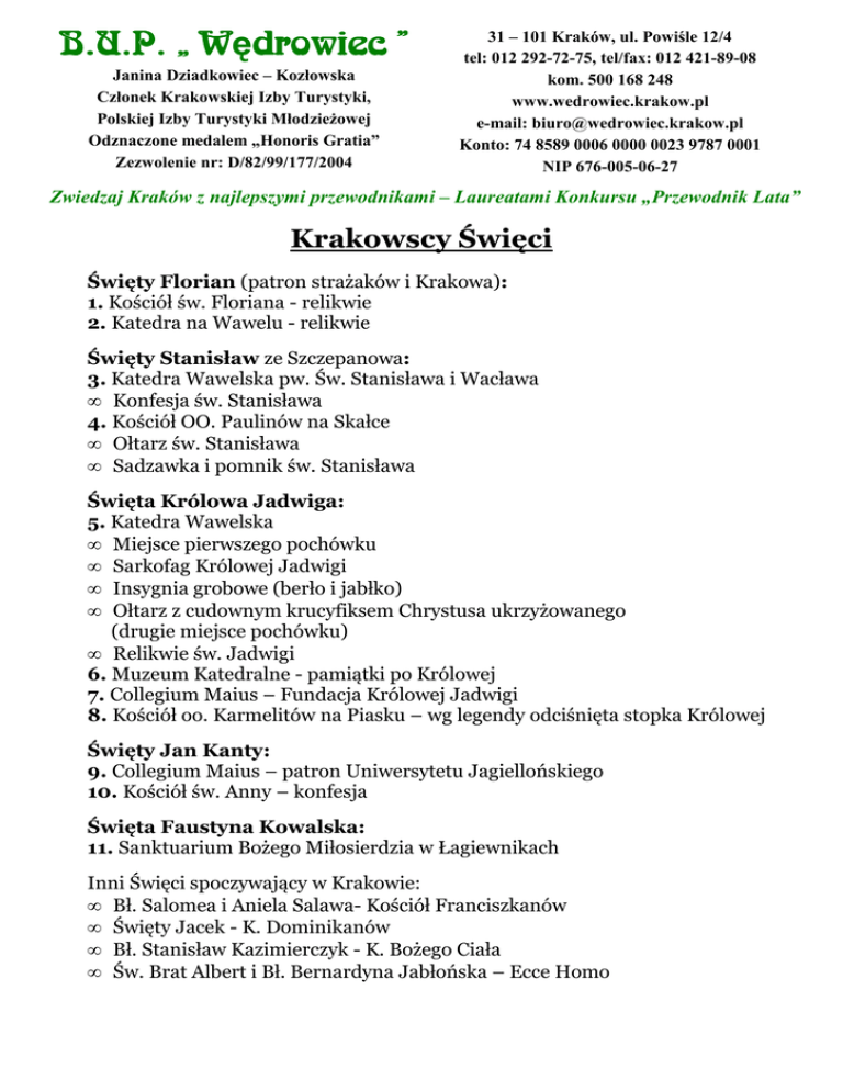 B.U.P. „ Wędrowiec W drowiec ” Janina Dziadkowiec – Kozłowska Członek Krakowskiej Izby Turystyki, Polskiej Izby Turystyki MłodzieŜowej Odznaczone medalem „Honoris Gratia” Zezwolenie nr: D/82/99/177/2004 31 – 101 Kraków, ul. Powiśle 12/4 tel: 012 292-72-75, tel/fax: 012 421-89-08 kom. 500 168 248 www.wedrowiec.krakow.pl e-mail: [email protected] Konto: 74 8589 0006 0000 0023 9787 0001 NIP 676-005-06-27 Zwiedzaj Kraków z najlepszymi przewodnikami – Laureatami Konkursu „Przewodnik Lata” Krakowscy Święci Święty Florian (patron strażaków i Krakowa): 1. Kościół św. Floriana - relikwie 2. Katedra na Wawelu - relikwie Święty Stanisław ze Szczepanowa: 3. Katedra Wawelska pw. Św. Stanisława i Wacława • Konfesja św. Stanisława 4. Kościół OO. Paulinów na Skałce • Ołtarz św. Stanisława • Sadzawka i pomnik św. Stanisława Święta Królowa Jadwiga: 5. Katedra Wawelska • Miejsce pierwszego pochówku • Sarkofag Królowej Jadwigi • Insygnia grobowe (berło i jabłko) • Ołtarz z cudownym krucyfiksem Chrystusa ukrzyżowanego (drugie miejsce pochówku) • Relikwie św. Jadwigi 6. Muzeum Katedralne - pamiątki po Królowej 7. Collegium Maius – Fundacja Królowej Jadwigi 8. Kościół oo. Karmelitów na Piasku – wg legendy odciśnięta stopka Królowej Święty Jan Kanty: 9. Collegium Maius – patron Uniwersytetu Jagiellońskiego 10. Kościół św. Anny – konfesja Święta Faustyna Kowalska: 11. Sanktuarium Bożego Miłosierdzia w Łagiewnikach Inni Święci spoczywający w Krakowie: • Bł. Salomea i Aniela Salawa- Kościół Franciszkanów • Święty Jacek - K. Dominikanów • Bł. Stanisław Kazimierczyk - K. Bożego Ciała • Św. Brat Albert i Bł. Bernardyna Jabłońska – Ecce Homo