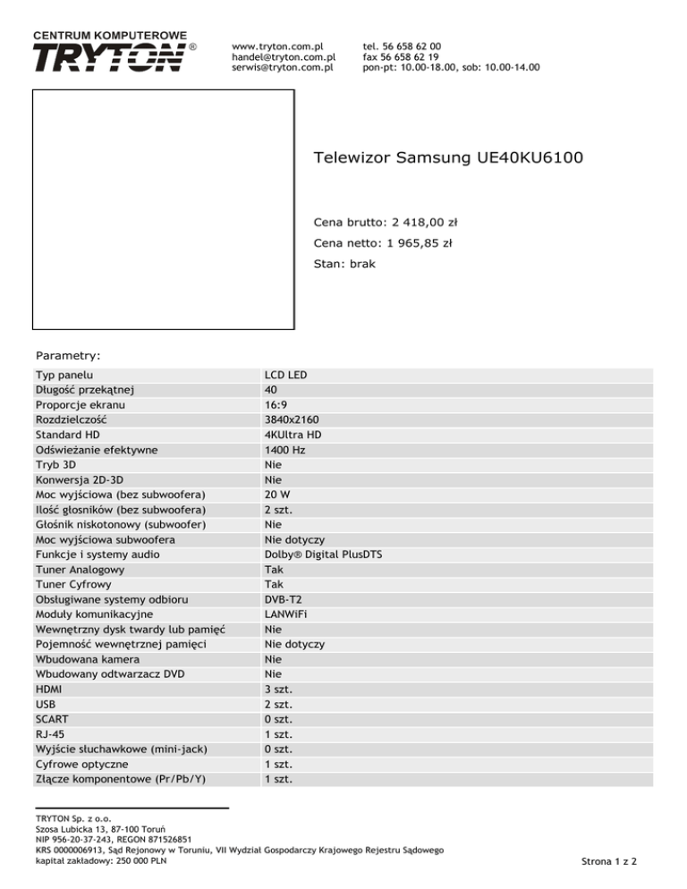 www.tryton.com.pl [email protected] [email protected] tel. 56 658 62 00 fax 56 658 62 19 pon-pt: 10.00-18.00, sob: 10.00-14.00 Telewizor Samsung UE40KU6100 Cena brutto: 2 418,00 zł Cena netto: 1 965,85 zł Stan: brak Parametry: Typ panelu Długość przekątnej Proporcje ekranu Rozdzielczość Standard HD Odświeżanie efektywne Tryb 3D Konwersja 2D-3D Moc wyjściowa (bez subwoofera) Ilość głosników (bez subwoofera) Głośnik niskotonowy (subwoofer) Moc wyjściowa subwoofera Funkcje i systemy audio Tuner Analogowy Tuner Cyfrowy Obsługiwane systemy odbioru Moduły komunikacyjne Wewnętrzny dysk twardy lub pamięć Pojemność wewnętrznej pamięci Wbudowana kamera Wbudowany odtwarzacz DVD HDMI USB SCART RJ-45 Wyjście słuchawkowe (mini-jack) Cyfrowe optyczne Złącze komponentowe (Pr/Pb/Y) LCD LED 40 16:9 3840x2160 4KUltra HD 1400 Hz Nie Nie 20 W 2 szt. Nie Nie dotyczy Dolby® Digital PlusDTS Tak Tak DVB-T2 LANWiFi Nie Nie dotyczy Nie Nie 3 szt. 2 szt. 0 szt. 1 szt. 0 szt. 1 szt. 1 szt. TRYTON Sp. z o.o. Szosa Lubicka 13, 87-100 Toruń NIP 956-20-37-243, REGON 871526851 KRS 0000006913, Sąd Rejonowy w Toruniu, VII Wydział Gospodarczy Krajowego Rejestru Sądowego kapitał zakładowy: 250 000 PLN Strona 1 z 2 www.tryton.com.pl [email protected] [email protected] DVB Common Interface (CI) Wejście antenowe RF (naziemne) Wejście antenowe RF (satelitarne) RS-232 Technologie Język menu Funkcje użytkowe Odtwarzanie z zew. nośników pamięci Smart TV Obsługiwane aplikacje Funkcje Eko Kolor obudowy Dekoracyjny efekt świetlny Wymiary opakowania (Szer/Wys/Gł) Wymiary z podstawą (Szer/Wys/Gł) Wymiary bez podstawy (Szer/Wys/Gł) Pilot Instrukcja obsługi Język instrukcji obsługi Karta gwarancyjna Kraje objęte gwarancją Okres gwarancji Strona www produktu tel. 56 658 62 00 fax 56 658 62 19 pon-pt: 10.00-18.00, sob: 10.00-14.00 1 szt. 1 szt. 1 szt. 0 szt. Digital Clean ViewUHD Dimming 27 jezyków Elektroniczny przewodnik po programach (EPG)Obraz w obrazieObsługa USB HIDWiFi DirectHbbTVTime ShiftZakrzywiony ekranTryb gryConnectShare Tak Tak AplikacjeHbb Tv Sensor Eco Czarny Nie 1136x620x170 mm 918,5x599,5x288 mm 918,5x536,4x104,2 mm Tak Tak polski Tak Polska 24 mies. http://www.samsung.com/pl/consumer/tv-av/tv/uhd/UE40KU6100WXXH Mimo dołożenia wszelkich starań nie gwarantujemy, że publikowane dane techniczne nie zawierają uchybień lub błędów. W przypadku jakichkolwiek wątpliwości prosimy przed podjęciem decyzji o kontakt z handlowcem. Przedstawiona oferta cenowa ma charakter informacyjny, nie stanowi oferty handlowej w rozumieniu Art.66 par.1 Kodeksu Cywilnego oraz innych właściwych przepisów prawnych. TRYTON Sp. z o.o. Szosa Lubicka 13, 87-100 Toruń NIP 956-20-37-243, REGON 871526851 KRS 0000006913, Sąd Rejonowy w Toruniu, VII Wydział Gospodarczy Krajowego Rejestru Sądowego kapitał zakładowy: 250 000 PLN Strona 2 z 2