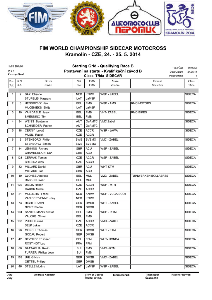 FIM WORLD CHAMPIONSHIP SIDECAR MOTOCROSS Kramolin - CZE, 24. - 25. 5. 2014 IMN 204/04 Poř.č. Čas vyvěšení Pos. St.N Poř. St.č. Driver Jezdec Starting Grid - Qualifying Race B Postavení na startu - Kvalifikační závod B Time/Čas 14:16:58 Date/Datum 24.05.14 Class Třída SIDECAR Page/Strana 1 Nat. Stát FMN FMN Make Značka Entrant Soutěžící Class Třída 1 2 BAX Etienne STUPELIS Kaspars NED LAT KNMV LaMSF WSP - ZABEL 2 3 HENDRICKX Jan MUCENIEKS Elvijs BEL LAT FMB LaMSF WSP - AMS RMC MOTORS SIDECA 3 10 VAN DAELE Jason SMEUNINX Tim BEL BEL FMB FMB VHT- ZABEL RMC BIKES SIDECA 4 34 WEISS Benjamin SCHNEIDER Patrick AUT AUT OeAMTC VMC Zabel OeAMTC SIDECA 5 18 CERNÝ Lukáš MUSIL Radek CZE CZE ACCR ACCR WSP - JAWA SIDECA 6 9 STENBORG Philip STENBORG Simon SWE SWE SVEMO SVEMO VMC - ZABEL SIDECA 7 14 JENKINS Richard CHAMBERLAIN Dan GBR GBR ACU ACU WSP - ZABEL SIDECA CZE CZE ACCR ACCR WSP - ZABEL SIDECA SIDECA 8 123 CERMAK Tomas BREZINA Ales SIDECA 9 32 MILLARD Daniel MILLARD Joe GBR GBR ACU ACU WHT-KTM 10 19 CLOHSE Andreas RASKIN Olivier BEL BEL MUL MUL VMC - ZABEL CZE CZE ACCR ACCR WSP - MTR SIDECA 11 102 DIBLIK Robert GABOR Michal TUINWERKEN BOLLAERTS SIDECA 12 31 MULDERS Frank VAN DER VENNE Joey NED NED KNMV KNMV WSP - VEGA SCO1 SIDECA 13 73 RICHTER Axel NICKE Stefan GER GER DMSB DMSB WHT - ZABEL SIDECA 14 104 SANTERMANS Kristof VALCKE Olivier BEL BEL FMB FMB WSP - KTM SIDECA 15 133 PUDLO Lukas SEJK Lukas CZE CZE ACCR ACCR VMC - ZABEL SIDECA 16 26 MORCH Thomas GODAU Robert GER GER DMSB DMSB WHT - KTM SIDECA 17 42 DEVOLDERE Geert ROSTINGT Luc BEL FRA FFM FFM WHT- HONDA SIDECA 18 66 BATTAGLIA Kevin FURRER Philipp Jean SUI SUI FMS FMS VMC - KTM SIDECA GER GER DMSB DMSB VMC - ZABEL SIDECA LAT LaMSF WSP - ZABEL SIDECA 19 20 Jury Jury 169 UHLIG Nick OETTEL Philipp 46 ŠTELLE Modris Andreas Kosbahn Clerk of Course Ředitel závodu Tomas Honzik Timekeeper Časoměřič Radomir Navratil FIM WORLD CHAMPIONSHIP SIDECAR MOTOCROSS Kramolin - CZE, 24. - 25. 5. 2014 IMN 204/04 Poř.č. Čas vyvěšení Pos. St.N Poř. St.č. 21 Driver Jezdec Starting Grid - Qualifying Race B Postavení na startu - Kvalifikační závod B Time/Čas 14:16:58 Date/Datum 24.05.14 Class Třída SIDECAR Page/Strana 2 Nat. Stát FMN FMN Make Značka Entrant Soutěžící Class Třída LINTERS Artürs LAT LaMSF 127 KALINOVSKY Ondrej LISKA Pavel CZE CZE ACCR ACCR VMC MTH SIDECA 22 87 VRATNY Martin HOTOVY Vaclav CZE CZE ACCR ACCR MEFO - JAWA SIDECA 23 74 LIEBL Willi POPP Tomas GER CZE ACCR ACCR MEFO - ZABEL SIDECA 24 17 VAN WERVEN Gert BEUNK Peter NED NED KNMV KNMV WSP - ZABEL SIDECA Celkový počet Jury Jury 24 Andreas Kosbahn Clerk of Course Ředitel závodu Tomas Honzik Timekeeper Časoměřič Radomir Navratil