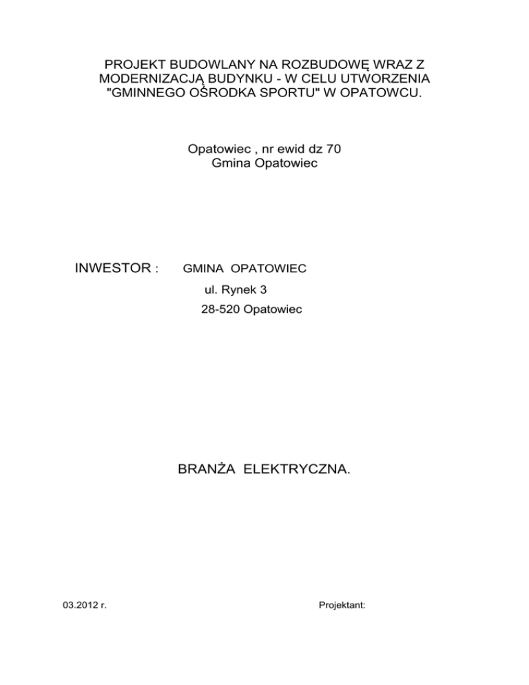 PROJEKT BUDOWLANY NA ROZBUDOWĘ WRAZ Z MODERNIZACJĄ BUDYNKU - W CELU UTWORZENIA "GMINNEGO OŚRODKA SPORTU" W OPATOWCU. Opatowiec , nr ewid dz 70 Gmina Opatowiec INWESTOR : GMINA OPATOWIEC ul. Rynek 3 28-520 Opatowiec BRANŻA ELEKTRYCZNA. 03.2012 r. Projektant: SPIS TREŚCI: 1. 2. 3. 4. 5. 6. Podstawa opracowania Ogólna charakterystyka zasilania Instalacja elektryczna Ochrona od porażeń w instalacji odbiorczej Instalacja odgromowa Obliczenia techniczne Obliczenia natężenia oświetlenia podstawowego * Pomieszczenie 1 - prysznic * Pomieszczenie 2 - wc * Pomieszczenie 3 - przedsionek * Pomieszczenie 4 - przedsionek * Pomieszczenie 5 - wc niepełnosprawnych * Pomieszczenie 6 - szatnia * Pomieszczenie 7 - korytarz * Pomieszczenie 8 - sala zajęć Obliczenia natężenia oświetlenia ewakuacyjnego * Pomieszczenie 3 - przedsionek * Pomieszczenie 4 - przedsionek * Pomieszczenie 5 - wc niepełnosprawnych * Pomieszczenie 7 - korytarz 7. Informacje dotyczące bezpieczeństwa i ochrony zdrowia 8. Uwagi ogólne 9. Rysunki Rys. nr E-1 Plan instalacji elektrycznej Rys. nr E-2 Schemat rozdzielnicy TR Rys. nr E-3 Plan instalacji odgromowej 1. Podstawa opracowania: • • • • • Zlecenie Inwestora Normy i przepisy Albumy Pomiary w terenie Uzgodnienia 2. Ogólna charakterystyka zasilania: W celu zasilenia projektowanej instalacji elektrycznej należy rozbudować istniejącą rozdzielnicę TR w korytarzu przez montaż w zespole z istniejącą dodatkowej tablicy rozdzielczej wnękowej RW 3x12. Wymogi stawiane obudowie: obudowa wykonana jako p/t o konstrukcji mechanicznej i odporności na wpływy atmosferyczne zapewniającej stopień ochrony przynajmniej IP 44. Ponadto obudowa powinna spełniać wymagania II klasy ochronności. Nominalny prąd obciążenia min. 63A. Dla późniejszej rozbudowy instalacji lub potrzeby zasilania nowych urządzeń projektowana jest rezerwa miejsca . Obudowa zamykana kluczem przez użytkownika na typowy zamek. 3. Instalacja elektryczna: Instalację elektryczną odbiorczą budynku wykonać przewodami YDYżo , YDYpżo i LgY prowadzonymi: * w rurach osłonowych * układanych p/t Przekrój przewodów podano na schemacie zasilania. Przewody w miejscach narażonych na uszkodzenie prowadzić w dodatkowych osłonach . Rodzaj opraw oświetleniowych podano na planie instalacji elektrycznej – oprawy minimum I stopień ochrony przed porażeniem z podłączonym przewodem ochronnym PE ( w pomieszczeniach sanitarnych , gospodarczych i do oświetlenia terenu oprawy w wykonaniu hermetycznym ). W pomieszczeniach zastosowano część opraw oświetleniowych spełniających funkcję oświetlenia podstawowego i ewakuacyjnego i ewakuacyjnego kierunkowego. Minimalny czas świecenia opraw oświetlenia ewakuacyjnego wynosi 1 godzinę. Do ogrzewania pomieszczeń sanitarnych grzejniki elektryczne o stopniu ochrony min IP 54 zasilane oddzielnymi obwodami z rozdzielnicy TR. Istniejącą instalację elektryczną w przebudowywanych pomieszczeniach zdemontować. 4. Ochrona od porażeń w instalacji odbiorczej: Jako system ochrony dodatkowej w instalacji projektuje się SZYBKIE WYŁĄCZENIE ZASILANIA przez wyłączniki przeciwporażeniowe różnicowo - prądowe , wyłączniki instalacyjne serii S ...... oraz system połączeń wyrównawczych. W instalacji urządzenia wymagające ochrony t.j. styki ochronne gniazd wtykowych i innych przyłączonych urządzeń. Rozdzielenie przewodu ochronno - neutralnego PEN na ochronny PE i neutralny N należy wykonać w rozdzielnicy TR. Przewód ochronny uziemić. Zabudować główną szynę wyrównawczą , wyprowadzić na zewnątrz i połączyć w ziemi z uziemieniem . Wykonać uziemienie o oporności < 10 Ω. Do głównej szyny wyrównawczej należy podłączyć wszystkie przewodzące konstrukcje , przewodzące instalacje oraz przewód ochronny z rozdzielnicy TR. Przewód ochronny prowadzić do wszystkich urządzeń. Zapewnić metaliczną ciągłość przewodu ochronnego. Instalację uziemiającą wykonać płaskownikiem Fe/Zn 25x4 mm układanym n/t. Połączenia spawane. Zabudować złącza probiercze. 5. Instalacja odgromowa. Instalację uziemiającą wykonać płaskownikiem Fe 25x4 mm układanym na głębokości 0,6 m i połączyć z istniejącym uziomem. Odprowadzenie do złącza probierczego ZP wykonane płaskownikiem Fe/Zn 25x4 mm. Zwody poziome i pionowe wykonać drutem Fe/Zn fi 8,0 mm jako nie naprężane - na dachu połączone z istniejącą instalacją odgromową. Zwód pionowy prowadzone w instalacyjnej rurze osłonowej o grubości ścianki min. 5 mm układanej p/t. Złącze probiercze montowane w skrzynce probierczej mocowanej p/t. Ochrona przed przepięciami zabudowana w rozdzielnicy TR - stopień B+C. Ponadto instalacją odgromową chronić wszystkie ponad dachem wypusty i urządzenia. Wykonać pomiary instalacji uziemiającej i odgromowej. Protokoły przekazać Inwestorowi. 6. Obliczenia techniczne. Dodatkowa moc zainstalowana w rozdzielnicy TR: Pi=8,7 kW Moc szczytowa wynosi 8,0 kW Sprawdzenie przekroju przewodów: Obwód oświetlenia Psz IB = 1400 1400 = = 230 x 0,9 = 6,76 A = 4,83 A 207 Przewód YDYpżo 3 x 1,5 mm2 - sposób ułożenia A IB = 6,76 < In=10A < Iz = 14,5 A Przekrój przewodu dobrany właściwie. Obwód gniazd wtykowych Psz IB = 1000 1000 = = 230 x 0,9 207 Przewód YDYpżo 3 x 2,5 mm2 - sposób ułożenia A IB = 4,83 < In=16A < Iz Przekrój przewodu dobrany właściwie. = 19,5 A Obwód ogrzewacza wody Psz IB = 1500 1500 = = 230 x 0,9 = 7,25 A 207 Przewód YDYpżo 3 x 2,5 mm2 - sposób ułożenia A IB = 7,25 < In=16A < Iz = 19,5 A Przekrój przewodu dobrany właściwie. Skuteczność zabezpieczeń dla zakładanych zwarć 1 - f : Zwarcie 1-f w najdalszym gnieździe wtykowym 1-f Linia zasilająca YDYpżo 3x2,5 mm2 R = 2* 0,028 * 7,4 = Σ= Zrz Ω Ω Ω Ω Ω X = Iz = Ib = Iw = 230 / 16 A 16 * Σ= 1,72 = k= 5= 0,41 0,17 0,41 0,52 1,20 1,72 133,9 5 80,0 Iw = 80,0 A < Iz = 133,9 A 0,664 Ω X = Ω Ω Ω Ω = = Z 1,25 * Z Z pomierzone w rozdzi