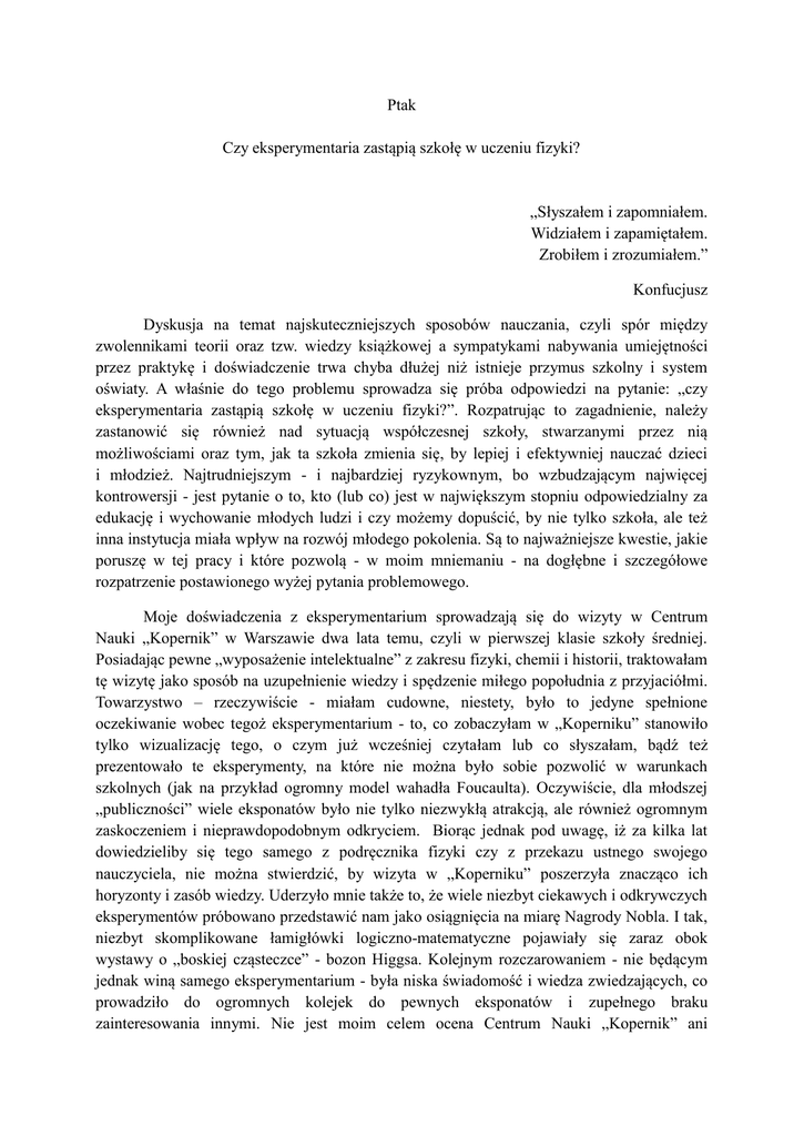 Ptak Czy eksperymentaria zastąpią szkołę w uczeniu fizyki? „Słyszałem i zapomniałem. Widziałem i zapamiętałem. Zrobiłem i zrozumiałem.” Konfucjusz Dyskusja na temat najskuteczniejszych sposobów nauczania, czyli spór między zwolennikami teorii oraz tzw. wiedzy książkowej a sympatykami nabywania umiejętności przez praktykę i doświadczenie trwa chyba dłużej niż istnieje przymus szkolny i system oświaty. A właśnie do tego problemu sprowadza się próba odpowiedzi na pytanie: „czy eksperymentaria zastąpią szkołę w uczeniu fizyki?”. Rozpatrując to zagadnienie, należy zastanowić się również nad sytuacją współczesnej szkoły, stwarzanymi przez nią możliwościami oraz tym, jak ta szkoła zmienia się, by lepiej i efektywniej nauczać dzieci i młodzież. Najtrudniejszym - i najbardziej ryzykownym, bo wzbudzającym najwięcej kontrowersji - jest pytanie o to, kto (lub co) jest w największym stopniu odpowiedzialny za edukację i wychowanie młodych ludzi i czy możemy dopuścić, by nie tylko szkoła, ale też inna instytucja miała wpływ na rozwój młodego pokolenia. Są to najważniejsze kwestie, jakie poruszę w tej pracy i które pozwolą - w moim mniemaniu - na dogłębne i szczegółowe rozpatrzenie postawionego wyżej pytania problemowego. Moje doświadczenia z eksperymentarium sprowadzają się do wizyty w Centrum Nauki „Kopernik” w Warszawie dwa lata temu, czyli w pierwszej klasie szkoły średniej. Posiadając pewne „wyposażenie intelektualne” z zakresu fizyki, chemii i historii, traktowałam tę wizytę jako sposób na uzupełnienie wiedzy i spędzenie miłego popołudnia z przyjaciółmi. Towarzystwo – rzeczywiście - miałam cudowne, niestety, było to jedyne spełnione oczekiwanie wobec tegoż eksperymentarium - to, co zobaczyłam w „Koperniku” stanowiło tylko wizualizację tego, o czym już wcześniej czytałam lub co słyszałam, bądź też prezentowało te eksperymenty, na które nie można było sobie pozwolić w warunkach szkolnych (jak na przykład ogromny model wahadła Foucaulta). Oczywiście, dla młodszej „publiczności” wiele eksponatów było nie tylko niezwykłą atrakcją, ale również ogromnym zaskoczeniem i nieprawdopodobnym odkryciem. Biorąc jednak pod uwagę, iż za kilka lat dowiedzieliby się tego samego z podręcznika fizyki czy z przekazu ustnego swojego nauczyciela, nie można stwierdzić, by wizyta w „Koperniku” poszerzyła znacząco ich horyzonty i zasób wiedzy. Uderzyło mnie także to, że wiele niezbyt ciekawych i odkrywczych eksperymentów próbowano przedstawić nam jako osiągnięcia na miarę Nagrody Nobla. I tak, niezbyt skomplikowane łamigłówki logiczno-matematyczne pojawiały się zaraz obok wystawy o „boskiej cząsteczce” - bozon Higgsa. Kolejnym rozczarowaniem - nie będącym jednak winą samego eksperymentarium - była niska świadomość i wiedza zwiedzających, co prowadziło do ogromnych kolejek do pewnych eksponatów i zupełnego braku zainteresowania innymi. Nie jest moim celem ocena Centrum Nauki „Kopernik” ani odwiedzających go turystów i nie to chciałam tu przedstawić. Ta sytuacja pokazuje jednak czym dla większości ludzi jest tego rodzaju ośrodek - jest to atrakcja, zabawa, niejako instynktowne podążanie za tym, co kolorowe, ładnie wyglądające, zabawne, niewymagające wysiłku a sprawiające przyjemność. To co odnajdziemy w eksperymentariach, to obiekty ciekawe, absorbujące, ale nieuporządkowane w żaden dydaktyczny sposób i niedające żadnych konkretnych doświadczeń, umożliwiających poznanie świata (kolejne eksponaty nie są ze sobą – zazwyczaj - powiązane ani pod względem dziedziny nauki, jakiej dotyczą, ani nawet czasu, w którym powstały). Jak więc wiedza podręcznikowa (szkolna) ma się do tej, jaką zdobędziemy w eksperymentarium? Nawet ci, którzy nie są zainteresowani fizyką czy chemią muszą przyznać, iż wiedza, jaką zdobywamy z tego zakresu w szkole, daje nam pewne wyobrażenie o świecie i przygotowanie do życia. Oczywiście można zaprzeczyć temu stwierdzeniu, wykazując zupełną nieprzydatność teorii kwantowych czy wiedzy o budowie atomowej materii w życiu codziennym. Jednak to, czego dowiedziałam się w liceum, pozwala mi odpowiedzieć na pytanie: „jak funkcjonuje świat?”, „dlaczego jest tak a nie inaczej?”, „co sprawia, że to wszystko działa?”. Kinematyka, dynamika, optyka, elektrodynamika pozwalają na poznanie praw i zasad tego świata. Eksperymenty z Centrum Nauki „Kopernik” nie dają takich możliwości, szczególnie, iż jest to wiedza, która łatwo może „ulecieć” tzn. doświadczenia nabyte w tym ośrodku nie pozostaną z nami na długo, ponieważ, zdobywając je, nie byliśmy nastawieni na naukę i zapamiętywanie. Oczywiście i tutaj znalazłoby się wielu przeciwników mojej opinii, którzy zarzuciliby mi niezgodność z prawdą, gdyż - jak stwierdził Konfucjusz w cytacie przywołanym jako motto mojej pracy - człowiek znacznie lepiej uczy się przez praktykę niż przez tzw. „wkuwanie” regułek. Dokładniej nad tym problemem zastanowię się w dalszej części pracy. Oczywiście, ogromną zaletą każdego eksperymentarium jest możliwość bezpośredniego obcowania z nauką, samodzielne przeprowadzanie doświadczeń i wspomniane wcześniej praktyczne zastosowanie wiedzy. To, co zrobimy samodzielnie i co odkryjemy sami, zapamiętamy na dłużej. Czy jednak konieczne jest dla człowieka o przeciętnej wiedzy i inteligencji, by musiał przeprowadzać nawet najbardziej banalne eksperymenty, by zapamiętać najprostsze prawa rządzące tym światem? Ja sama uważam, że genialnym narzędziem poznawczym i sposobem zdobywania informacji jest doświadczenie i aktywna praca. Widzę jednak sens takich działań, jeśli dotyczą one jakiegoś skomplikowanego problemu, niejasnego zagadnienia, trudnego do wyobrażenia i zrozumienia zjawiska. Natomiast jałowe i 