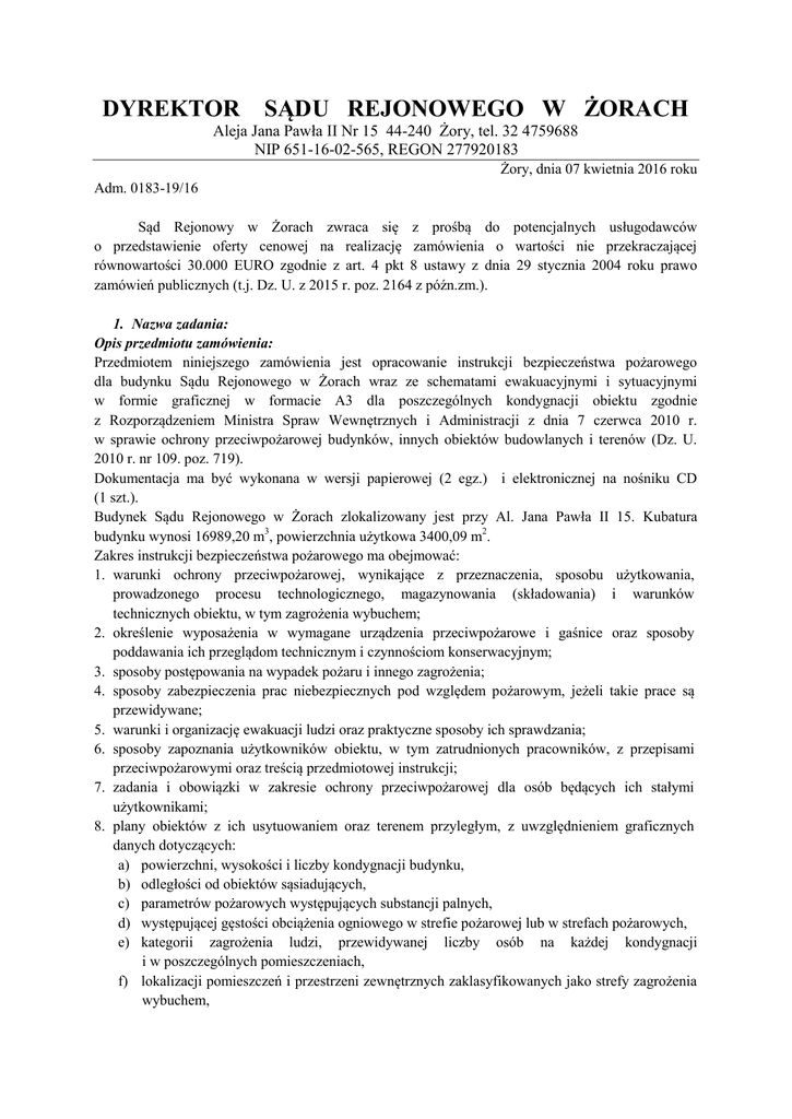 DYREKTOR SĄDU REJONOWEGO W ŻORACH Aleja Jana Pawła II Nr 15 44-240 Żory, tel. 32 4759688 NIP 651-16-02-565, REGON 277920183 Żory, dnia 07 kwietnia 2016 roku Adm. 0183-19/16 Sąd Rejonowy w Żorach zwraca się z prośbą do potencjalnych usługodawców o przedstawienie oferty cenowej na realizację zamówienia o wartości nie przekraczającej równowartości 30.000 EURO zgodnie z art. 4 pkt 8 ustawy z dnia 29 stycznia 2004 roku prawo zamówień publicznych (t.j. Dz. U. z 2015 r. poz. 2164 z późn.zm.). 1. Nazwa zadania: Opis przedmiotu zamówienia: Przedmiotem niniejszego zamówienia jest opracowanie instrukcji bezpieczeństwa pożarowego dla budynku Sądu Rejonowego w Żorach wraz ze schematami ewakuacyjnymi i sytuacyjnymi w formie graficznej w formacie A3 dla poszczególnych kondygnacji obiektu zgodnie z Rozporządzeniem Ministra Spraw Wewnętrznych i Administracji z dnia 7 czerwca 2010 r. w sprawie ochrony przeciwpożarowej budynków, innych obiektów budowlanych i terenów (Dz. U. 2010 r. nr 109. poz. 719). Dokumentacja ma być wykonana w wersji papierowej (2 egz.) i elektronicznej na nośniku CD (1 szt.). Budynek Sądu Rejonowego w Żorach zlokalizowany jest przy Al. Jana Pawła II 15. Kubatura budynku wynosi 16989,20 m3, powierzchnia użytkowa 3400,09 m2. Zakres instrukcji bezpieczeństwa pożarowego ma obejmować: 1. warunki ochrony przeciwpożarowej, wynikające z przeznaczenia, sposobu użytkowania, prowadzonego procesu technologicznego, magazynowania (składowania) i warunków technicznych obiektu, w tym zagrożenia wybuchem; 2. określenie wyposażenia w wymagane urządzenia przeciwpożarowe i gaśnice oraz sposoby poddawania ich przeglądom technicznym i czynnościom konserwacyjnym; 3. sposoby postępowania na wypadek pożaru i innego zagrożenia; 4. sposoby zabezpieczenia prac niebezpiecznych pod względem pożarowym, jeżeli takie prace są przewidywane; 5. warunki i organizację ewakuacji ludzi oraz praktyczne sposoby ich sprawdzania; 6. sposoby zapoznania użytkowników obiektu, w tym zatrudnionych pracowników, z przepisami przeciwpożarowymi oraz treścią przedmiotowej instrukcji; 7. zadania i obowiązki w zakresie ochrony przeciwpożarowej dla osób będących ich stałymi użytkownikami; 8. plany obiektów z ich usytuowaniem oraz terenem przyległym, z uwzględnieniem graficznych danych dotyczących: a) powierzchni, wysokości i liczby kondygnacji budynku, b) odległości od obiektów sąsiadujących, c) parametrów pożarowych występujących substancji palnych, d) występującej gęstości obciążenia ogniowego w strefie pożarowej lub w strefach pożarowych, e) kategorii zagrożenia ludzi, przewidywanej liczby osób na każdej kondygnacji i w poszczególnych pomieszczeniach, f) lokalizacji pomieszczeń i przestrzeni zewnętrznych zaklasyfikowanych jako strefy zagrożenia wybuchem, g) podziału obiektu na strefy pożarowe, h) warunków ewakuacji, ze wskazaniem kierunków i wyjść ewakuacyjnych, i) miejsc usytuowania urządzeń przeciwpożarowych i gaśnic, materiałów niebezpiecznych pożarowo oraz miejsc usytuowania elementów sterujących urządzeniami przeciwpożarowymi, j) wskazania dojść do dźwigów dla ekip ratowniczych, k) lokalizacji hydrantów zewnętrznych oraz innych źródeł wody do celów przeciwpożarowych, l) lokalizacji dróg pożarowych i innych dróg dojazdowych, z zaznaczeniem wjazdów na teren ogrodzony. W Instrukcji Bezpieczeństwa Pożarowego należy podać elementy istotne ze względu na ochronę przeciwpożarową w szczególności: 1. określenie konstrukcji budynku, 2. określenie przeznaczenia budynku, 3. kategorii zagrożenia ludzi lub obciążenia ogniowego, 4. wymiarów budynku (szerokość, długość, wysokość i ilość kondygnacji), 5. rzuty poszczególnych kondygnacji, 6. plan sytuacyjny działki z zaznaczeniem dojazdów oraz przeszkód naturalnych i sztucznych, 7. oznaczenie kierunków ewakuacji i wyjść ewakuacyjnych, 8. oznaczenie podziału obiektu na strefy pożarowe, 9. oznaczenie rozmieszczenia urządzeń przeciwpożarowych, 10. oznaczenie rozmieszczenia włączników instalacji technicznych, 11. oznaczenie lokalizacji instalacji, odbiorników i zaworów gazowych, 12. określenie warunków przechowywania lub występowania materiałów niebezpiecznych oraz podanie ilości substancji i jej charakterystyk wraz ze sposobami postępowania z tymi substancjami na wypadek pożaru, 13. oznaczenie hydrantów zewnętrznych oraz innych źródeł wody do celów przeciwpożarowych, 14. oznaczenie dróg pożarowych i innych dróg dojazdowych z zaznaczeniem wjazdów i wejść do budynku. Tutejszy Sąd posiada instrukcję bezpieczeństwa pożarowego dla budynku Sądu Rejonowego w Żorach w wersji papierowej. Wszelkie informacje, które mogą być konieczne do przygotowania oferty zostaną udostępnione pod warunkiem złożenia oświadczenia „Klauzula poufności danych" . Po podpisaniu umowy, wybranemu Wykonawcy zaleca się przeprowadzenie wizji lokalnej ww. budynku. Złożenie oferty stanowi oświadczenie oferenta, że w przypadku przyjęcia oferty zobowiązuje się do realizacji przedmiotu zamówienia zgodnie z zakresem złożonej oferty i zapisami zaproszenia do składania ofert. 2. Termin realizacji zamówienia: termin zakończenia – 31.05.2016r. 3. Warunki udziału w postępowaniu: W postępowaniu mogą wziąć udział Wykonawcy spełniający warunki w zakresie: posiadania uprawnień do wykonywania określonej działalności lub czynności, jeżeli przepisy prawa nakładają obowiązek ich posiadania, posiadania wiedzy i doświadczenia do wykonania zamówienia, dysponowania odpowiednim potencjałem technicznym, dysponowania osobami zdolnymi do wykonania zamówienia, Osoby wykonujące instrukcje bezpieczeństwa pożarowego muszą posiadać kwalifikacje o których mowa w art. 4 ust. 2 b ustawy z dnia 24 sierpnia 1991 r. o ochronie przeciwpożarowej (j.t. Dz. U. z 2009 r. nr 178, poz. 1380 z późn. zm.), tj. co najmniej wy