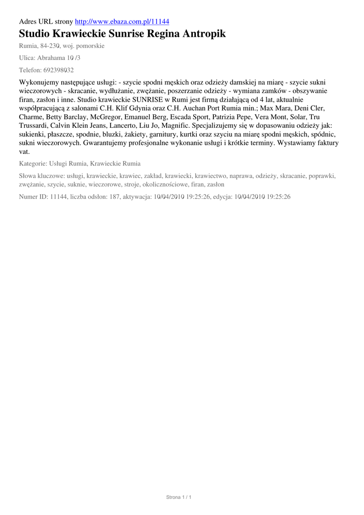 Adres URL strony http://www.ebaza.com.pl/11144 Studio Krawieckie Sunrise Regina Antropik Rumia, 84-230, woj. pomorskie Ulica: Abrahama 10 /3 Telefon: 692398032 Wykonujemy następujące usługi: - szycie spodni męskich oraz odzieży damskiej na miarę - szycie sukni wieczorowych - skracanie, wydłużanie, zwężanie, poszerzanie odzieży - wymiana zamków - obszywanie firan, zasłon i inne. Studio krawieckie SUNRISE w Rumi jest firmą działającą od 4 lat, aktualnie współpracującą z salonami C.H. Klif Gdynia oraz C.H. Auchan Port Rumia min.; Max Mara, Deni Cler, Charme, Betty Barclay, McGregor, Emanuel Berg, Escada Sport, Patrizia Pepe, Vera Mont, Solar, Tru Trussardi, Calvin Klein Jeans, Lancerto, Liu Jo, Magnific. Specjalizujemy się w dopasowaniu odzieży jak: sukienki, płaszcze, spodnie, bluzki, żakiety, garnitury, kurtki oraz szyciu na miarę spodni męskich, spódnic, sukni wieczorowych. Gwarantujemy profesjonalne wykonanie usługi i krótkie terminy. Wystawiamy faktury vat. Kategorie: Usługi Rumia, Krawieckie Rumia Słowa kluczowe: usługi, krawieckie, krawiec, zakład, krawiecki, krawiectwo, naprawa, odzieży, skracanie, poprawki, zwężanie, szycie, suknie, wieczorowe, stroje, okolicznościowe, firan, zasłon Numer ID: 11144, liczba odsłon: 187, aktywacja: 10/04/2010 19:25:26, edycja: 10/04/2010 19:25:26 Strona 1 / 1