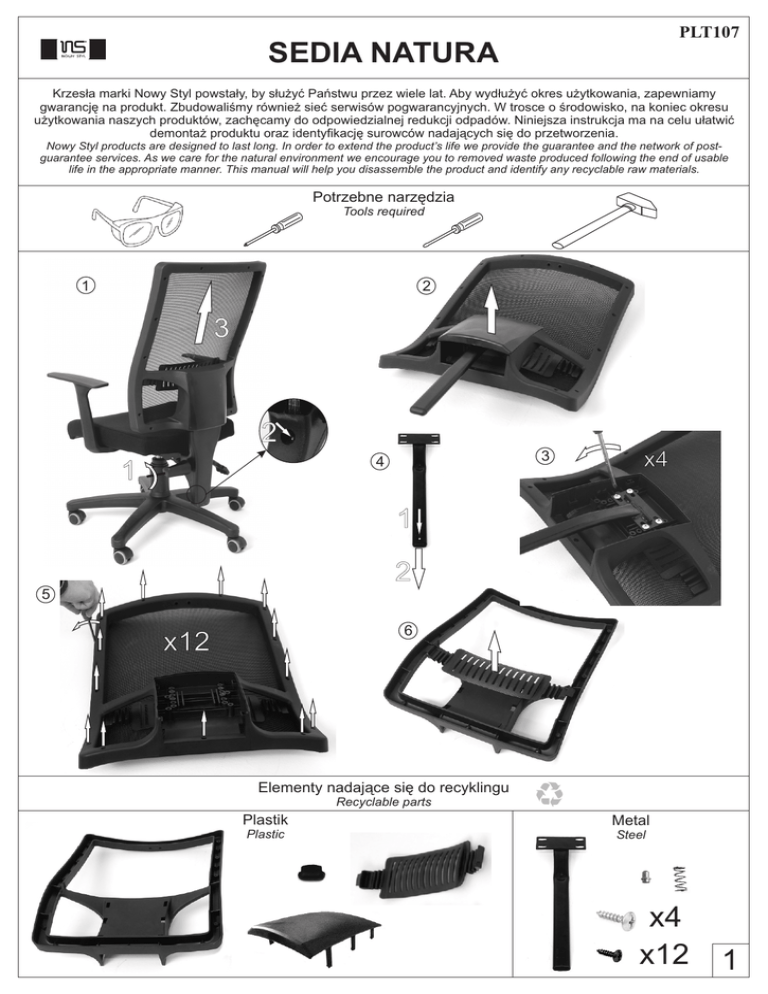 PLT107 SEDIA NATURA Krzesùa marki Nowy Styl powstaùy, by sùuýyã Pañstwu przez wiele lat. Aby wydùuýyã okres uýytkowania, zapewniamy gwarancjæ na produkt. Zbudowaliúmy równieý sieã serwisów pogwarancyjnych. W trosce o úrodowisko, na koniec okresu uýytkowania naszych produktów, zachæcamy do odpowiedzialnej redukcji odpadów. Niniejsza instrukcja ma na celu uùatwiã demontaý produktu oraz identyfikacjæ surowców nadajàcych siæ do przetworzenia. Nowy Styl products are designed to last long. In order to extend the product’s life we provide the guarantee and the network of postguarantee services. As we care for the natural environment we encourage you to removed waste produced following the end of usable life in the appropriate manner. This manual will help you disassemble the product and identify any recyclable raw materials. Potrzebne narzædzia Tools required 1 2 3 2 3 4 1 x4 1 2 5 6 x12 Elementy nadajàce siæ do recyklingu Recyclable parts Plastik Metal Plastic Steel x4 x12 1 7 8 x3 Elementy nadajàce siæ do recyklingu Recyclable parts Plastik Metal Plastic Steel x6 x4 x4 x2 10 9 x4 2 11 13 12 Elementy nadajàce siæ do recyklingu Recyclable parts Plastik Plastic 14 x2 16 15 17 3 18 19 Elementy nadajàce siæ do recyklingu Recyclable parts Plastik Metal Plastic Steel x2 Informacje na temat serwisu gwarancyjnego, pogwarancyjnego oraz produktów marki Nowy Styl, mog¹ Pañstwo uzyskaæ pod numerem telefonu Centrum Informacji tel. 0801 177 291 (po³¹czenie p³atne jak za jeden impuls) czynne w godz. 8:00 – 16:00 od poniedzia³ku do pi¹tku 4