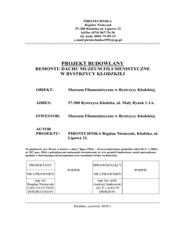 PIROTECHNIKA Bogdan Niemczuk 57-300 Kłodzko ul. Lipowa 33 tel/fax (074) 867-76-36 tel. kom. 0601-75-09-15 e.mail [email protected] =================================================================== PROJEKT BUDOWLANY REMONTU DACHU MUZEUM FILUMENISTYCZNE W BYSTRZYCY KŁODZKIEJ OBIEKT: Muzeum Filumenistyczne w Bystrzycy Kłodzkiej. ADRES: 57-500 Bystrzyca Kłodzka, ul. Mały Rynek 1-1A. INWESTOR: Muzeum Filumenistyczne w Bystrzycy Kłodzkiej. AUTOR PROJEKTU: PIROTECHNIKA Bogdan Niemczuk, Kłodzko, ul. Lipowa 33. Na podstawie art. 20 ust. 4 ustawy z dnia 7 lipca 1994r. - Prawo budowlane (jednolity tekst Dz.U. z 2003r. nr 207, poz. 2016 z późniejszymi zmianami) oświadczam, że w/w projekt budowlany został sporządzony zgodnie z obowiązującymi przepisami oraz zasadami wiedzy technicznej. SPRAWDZAJĄCY PROJEKTANT PODPIS PODPIS NR UPRAWNIEŃ NR UPRAWNIEŃ mgr inż. Bogdan Niemczuk UAN.VI-f/3/79/85 DOŚ/BO/2102/01 mgr inż. arch. Andrzej Sankowski AU-F 1-4-83/79 DS0628/91 ----------------------------------------------------------------------------------------------------------------Kłodzko, czerwiec 2010 r. SPIS ZAWARTOŚCI PROJEKTU BUDOWLANEGO: Część opisowa. I. 1. Metryka projektu wraz z oświadczeniami projektanta i sprawdzającego o wykonaniu projektu zgodnie z obowiązującymi przepisami Dane ewidencyjne. 2. Zawartość opracowania. 3. Dokumenty formalno prawne. 4. Opis techniczny. 5. Informacja BIOZ. II. Część rysunkowa. Rys nr 1 – Plan sytuacyjny. Rys nr 2 – Rzut dachu. III. Dokumentacja fotograficzna. 3. DOKUMENTY FORMALNO PRAWNE. 4. OPIS TECHNICZNY. I. Opis do projektu zagospodarowania działki budowlanej. 1. Dane ewidencyjne 1.Dane ogólne: 1.1 .Obiekt: Remont dachu Muzeum Filumenistyczne w Bystrzycy Kłodzkiej. 1.2. Adres: 57-500 Bystrzyca Kłodzka, ul. Mały Rynek 1-1A, nr dz. 647 (AM-6) obręb Centrum. 1.3. Inwestor: Muzeum Filumenistyczne w Bystrzycy Kłodzkiej. 1.4. Faza: Projekt budowlany. 2. Cel i przedmiot inwestycji Projekt przewiduje wykonanie remontu dachu Muzeum Filumenistyczne w Bystrzycy Kłodzkiej, polegającego na rozebraniu starego pokrycia dachowego z dachówki karpiówki i wykonaniu nowego pokrycia dachowego z dachówki karpiówki wraz z wymiana łat i kontr łat, zabezpieczeniu elementów konstrukcji dachowej poprzez dwukrotną impregnację, w ramach remontu pokrycia dachowego wymienione zostaną rynny i rury spustowe oraz obróbki blacharskie, zostanie wymieniona instalacja odgromowa, zostaną naprawione i pomalowane kominy, jak również zostanie wymienione na nowe istniejące pokrycie papowe. 3. Istniejący stan zagospodarowania terenu Na działce znajduje się Muzeum Filumenistyczne składające się z dwóch budynków. W skład zabudowań wchodzi dawny kościół poewangielicki oraz budynek dawnej szkoły poewangielickiej, budynki te połączone są łącznikiem pełniącym funkcję wewnętrznej klatki schodowej, budynek dawnej szkoły poewangielickiej połączony jest również łącznikiem z istniejącą zabudową, w tym łączniku znajdują się pomieszczenia gospodarcze i administracyjne. 4. Projektowane zagospodarowanie terenu 4.1. Granice terenu inwestycji. Inwestycja będzie ograniczona do działki nr 647 (AM-6) obręb Centrum, która stanowi własność inwestora. 4.2. Charakterystyka inwestycji. Remont dachu istniejącego budynku Muzeum Filumenistycznego w Bystrzycy Kłodzkiej. 4.3. Budynki oraz teren, na którym projektuje się przebudowę są wpisane do rejestru Zabytków: a) budynek dawnego kościoła poewangielicki - decyzją nr 2016 z dnia 25.05.1972 r. b) budynek dawnej szkoły poewangielickiej - decyzją nr A/1101 z dnia 30.01.2009 r. 4.4. Dane określające wpływ eksploatacji górniczej na działkę lub teren zamierzenia budowlanego, znajdującego się w granicach terenu górniczego: - nie dotyczy. 4.5. Informacje i dane o charakterze i cechach istniejących i przewidywanych zagrożeń dla środowiska oraz higieny i zdrowia użytkowników projektowanych obiektów budowlanych i ich otoczenia w zakresie zgodnym z przepisami odrębnymi - budynki podczas prawidłowego użytkowania - nie stwarzają zagrożenia dla środowiska oraz higieny i zdrowia użytkowników. 5. Infrastruktura techniczna Na działce znajdują się zabudowania wchodzące w skład Muzeum Filumenistycznego w Bystrzycy Kłodzkiej. 5.1 Dojście i dojazd na czas budowy istniejące. II. Projekt architektoniczno-budowlany 1.Dane ogólne: 1. Dane ogólne: 1.1 .Obiekt: Remont dachu Muzeum Filumenistyczne w Bystrzycy Kłodzkiej. 1.2 Adres: 57-500 Bystrzyca Kłodzka, ul. Mały Rynek 1-1A, nr dz. 647 (AM-6) obręb Centrum. 1.3.Inwestor: Muzeum Filumenistyczne w Bystrzycy Kłodzkiej. 1.4.Faza: Projekt budowlany. 2. Podstawa opracowania: - umowa z inwestorem, - zdjęcia i pomiary autorów opracowania. 3. Przeznaczenie obiektu budowlanego: 3.1 Funkcja obiektu: Budynki znajdują się w rejestrze zabytków nr 2016 z dnia 25.05.1972 r. i A/1101 z dnia 30.01.2009 r. Obecnie zajmowane są przez Muzeum Filumenistyczne w Bystrzycy Kłodzkiej gromadzące zbiory filumenistyczne. 3.2. Stan istniejący: 3.2.1. Dachy. Obecnie na dwóch głównych dachach Muzeum Filumenistyczne znajdują się pokrycia dachowe z dachówki karpiówki (zdjęcie nr: 1, 2 i 7), natomiast łączniki pokryte są papą (zdjęcie nr: 3 i 4). Obecne pokrycie jest częściowo zniszczone i miejscami nieszczelne. Konstrukcja dachu w stanie dobrym. Rynny i rury spustowe i obróbki blacharskie oraz instalacja odgromowa kwalifikuje się do wymiany. Projekt przewiduje także naprawę i pomalowanie istniejących kominów (zdjęcie nr: 5 i 6). 3.2.2. Kominy. Na kominach znajdujące się na dachu tynki są miejscami uszkodzone i spękane, a powłoki malarskie wymagają ponownego wykonania. 3.3. Stan projektowany: 3.3.1. Dachy. W związku ze zniszczonym istniejącym pokryciem dachu, projektuje się wymianę na nowe jednolite z użyciem dachówki ceramicznej karpiówki, ułożonej podwójnie w koronkę kolor naturalnej czerwi