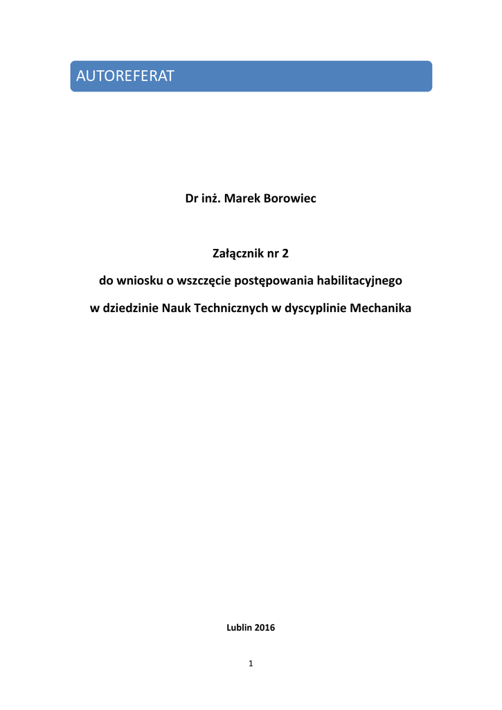 AUTOREFERAT Dr inż. Marek Borowiec Załącznik nr 2 do wniosku o wszczęcie postępowania habilitacyjnego w dziedzinie Nauk Technicznych w dyscyplinie Mechanika Lublin 2016 1 Spis treści 1. 2. Informacje o wnioskodawcy ............................................................................................................ 3 1.1 Dane osobowe ......................................................................................................................... 3 1.2 Posiadane dyplomy i stopnie naukowe ................................................................................... 3 1.3 Informacje o dotychczasowym zatrudnieniu w jednostkach naukowych ............................... 4 1.4 Przebieg rozwoju zawodowego ............................................................................................... 4 Opis osiągnięcia naukowego ........................................................................................................... 5 2.1. Tytuł osiągnięcia naukowego .................................................................................................. 5 2.2. Autor/autorzy, tytuł/tytuły publikacji, rok wydania, nazwa wydawnictwa. ........................... 5 2.3. Omówienie celu naukowego ww. prac i osiągniętych wyników wraz z omówieniem ich ewentualnego wykorzystania ............................................................................................................ 11 3. Omówienie pozostałych osiągnięć naukowo – badawczych ......................................................... 12 4. Działalność dydaktyczna i popularyzatorska ................................................................................. 17 5. Podsumowanie .............................................................................................................................. 19 2 1. Informacje o wnioskodawcy 1.1 Dane osobowe Imię i nazwisko: Marek Borowiec Data i miejsce urodzenia: 2 styczeń 1978 r. Tarnogród Wykształcenie: 1993 – 1998 Technikum Mechaniczne w Biłgoraju, 1998 – 2003 Politechnika Lubelska, Wydział Mechaniczny, studia dzienne magisterskie na kierunku Mechanika i Budowa Maszyn, 2004 – 2008 Politechnika Lubelska, Wydział Mechaniczny, studia doktoranckie 1.2 Posiadane dyplomy i stopnie naukowe Stopień doktora: Politechnika Lubelska, Wydział Mechaniczny, 04.02.2009. Specjalność: Nauki Techniczne, Dyscyplina: Budowa i Eksploatacja Maszyn Tytuł pracy doktorskiej: „Badania drgań nieliniowych zawieszenia pojazdów samochodowych” Promotor: Prof. dr hab. Grzegorz Litak, Politechnika Lubelska Recenzenci: Prof. dr hab. inż. Jan Awrejcewicz, Politechnika Łódzka Prof. dr hab. inż. Kazimierz Szabelski, Politechnika Lubelska Tytuł magistra inżyniera: Politechnika Lubelska, Wydział Mechaniczny, 16.06.2003. Kierunek: Mechanika i Budowa Maszyn Specjalność: Samochody i ciągniki Tytuł pracy magisterskiej: „Analiza statystyczna wskaźników ekologicznych taboru autobusowego MPK w Lublinie” Promotor: dr. inż. Piotr Szczęsny 3 1.3 Informacje o dotychczasowym zatrudnieniu w jednostkach naukowych Miejsce zatrudnienia: Katedra Mechaniki Stosowanej, Wydział Mechaniczny, Politechnika Lubelska, ul. Nadbystrzycka 36, 20-616 Lublin Historia zatrudnienia: 1.10.2003 – 30.09.2009: Pracownik naukowo dydaktyczny na stanowisku asystenta w Katedrze Mechaniki Stosowanej, Wydział Mechaniczny, Politechnika Lubelska. 1.10.2009 – obecnie: Pracownik naukowo dydaktyczny na stanowisku adiunkta w Katedrze Mechaniki Stosowanej, Wydział Mechaniczny, Politechnika Lubelska. 1.4 Przebieg rozwoju zawodowego Po ukończeniu Technikum Mechanicznego w Biłgoraju w roku 1998 rozpocząłem studia w Politechnice Lubelskiej na specjalności Mechanika i Budowa Maszyn, kierunek dyplomowania Samochody i ciągniki które ukończyłem w 2003 r. Moja działalność naukowa rozpoczęła się na ostatnim roku studiów magisterskich kiedy to podjąłem się badań taboru MPK w Lublinie pod kątem analiz spalin autobusów. Dnia 1 października 2003 zostałem zatrudniony na stanowisku asystenta w Katedrze Mechaniki Stosowanej Politechniki Lubelskiej. Wówczas rozpocząłem prace pod kierunkiem prof. Grzegorza Litaka nad szeroko rozumianymi układami nieliniowymi. Swoją wiedzę poszerzałem w kierunku modelowania oraz analiz układów z niesymetrycznym potencjałem. W kolejnych latach dominującym przedmiotem badań była analiza drgań zawieszenia samochodu. Zajmowałem się wówczas modelowaniem analitycznym i numerycznym układu „ćwiartki samochodu” wymuszanym kinematyczne od nierówności drogi. Badania te zawarłem w rozprawie doktorskiej gdzie oceniałem wpływ na pojazd granicznych wartości amplitud wymuszeń kinematycznych w obrębie których mogą się pojawiać drgania chaotyczne. W modelach zakładałem charakterystyki sił sprężystości i tłumienia jako nieliniowe. Rozpatrywałem problem symetrycznego potencjału z podwójną studnią oraz jego asymetrię wynikającą z uwzględnienia członu grawitacyjnego. Wyniki uzyskane metodami analitycznymi weryfikowałem analizą numeryczną poprzez symulacje prowadzone na własnych programach pisanych w środowisku Fortran i Matlab. Badałem analitycznie i numerycznie zjawisko rezonansu przy nieliniowości trzeciego stopnia sił sprężystości i tłumienia modelu „ćwiartki samochodu”. Za pomocą metody Mielnikowa analizowałem przejścia rozpatrywanych układów do ruchu chaotycznego. Badałem także wpływ komponentu szumowego wymuszenia kinematycznego, który stanowił dodatkowe wymuszenie losowe od nawierzchni jezdni. Uzyskane wyniki weryfikowałem podczas badań doświadczalnych prowadzonych na samochodzie dostawczym 4 Intrall w ramach współpracy z Fabryką Samochodów Intrall Lublin. Badania te polegały na rejestrowaniu sygnałów przyspieszeń na amortyzatorach przedniego zawieszenia pojazdu podczas jazdy na różnych nawierzchniach; asfalcie, kostce brukowej oraz przejazdach przez t