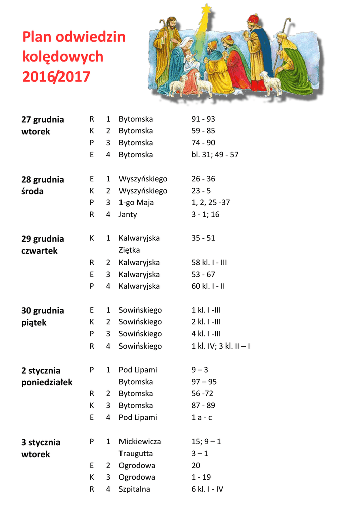 Plan odwiedzin kolędowych 2016/2017 27 grudnia wtorek R K P E 1 2 3 4 Bytomska Bytomska Bytomska Bytomska 91 - 93 59 - 85 74 - 90 bl. 31; 49 - 57 28 grudnia środa E K P R 1 2 3 4 Wyszyńskiego Wyszyńskiego 1-go Maja Janty 26 - 36 23 - 5 1, 2, 25 -37 3 - 1; 16 29 grudnia czwartek K 35 - 51 R E P 1 Kalwaryjska Ziętka 2 Kalwaryjska 3 Kalwaryjska 4 Kalwaryjska 30 grudnia piątek E K P R 1 2 3 4 1 kl. I -III 2 kl. I -III 4 kl. I -III 1 kl. IV; 3 kl. II – I 2 stycznia poniedziałek P 1 Pod Lipami Bytomska 2 Bytomska 3 Bytomska 4 Pod Lipami 9–3 97 – 95 56 -72 87 - 89 1a-c 1 Mickiewicza Traugutta 2 Ogrodowa 3 Ogrodowa 4 Szpitalna 15; 9 – 1 3–1 20 1 - 19 6 kl. I - IV R K E 3 stycznia wtorek P E K R Sowińskiego Sowińskiego Sowińskiego Sowińskiego 58 kl. I - III 53 - 67 60 kl. I - II R 1 Sowińskiego 2 Sowińskiego 3 Sowińskiego Wyszyńskiego 4 Sowińskiego 5 kl. I; 3 kl. IV - III 7 kl. I – II; 5 kl. II 8 kl. I – II 79 6 kl. IV - I 5 stycznia czwartek E R P K 1 2 3 4 10 - 17 1-9 18 - 24 62 a, b, c; 64, 66 6 stycznia piątek P R 1 Miarki 2 Miarki Bończyka 3 1-go Maja 15 - 22 12 – 1 4 – 18 3 - 21 1 Kanałowa 2 Gimnazjalna Wesoła Gimnazjalna Reja 3 Janty 1 - 11 1–4 1 – 10 12 – 20; LO; 21 1 – 10 11 - 4 K P 1 Stary Dworzec Ogrodowa 2 Ogrodowa 3 Powstańców 17 g – k 17 b – f 7 – 3; 2a; 2 9 stycznia poniedziałek K P R E 1 2 3 4 14; bl. 1 kl. I, II, III 1 – 2; 10; 12 b, a 9a – 3 1 – 10 10 stycznia wtorek R K 1 Żwirki 2 Żwirki Lompy 3 Bytomska Żwirki 4 Sienkiewicza 4 stycznia środa K P E K 7 stycznia sobota P K R 8 stycznia niedziela R P E Kościuszki Kościuszki Kościuszki Kalwaryjska Janty Wigury Wigury Wolności 5 – 14 16 – 15 1–4 80; 80a 24 – 18; 4 – 1 8–1 11 stycznia środa R P E K 1 2 3 3 12 stycznia czwartek P E R 1 Szpitalna Sowińskiego 2 Szpitalna Sowińskiego 1 Ogrodowa 2 Ogrodowa 10 kl. I – II 9 kl. I – II 2 2a; 4 kl. IV 22, 21 kl. I 24 kl. I, II; 23 kl. I, II 13 stycznia piątek P E K R 1 2 3 4 94 kl. I 94 kl. II 1 - 24 26-31; 32-37 i 42-38 14 stycznia sobota E K R 1 Ogrodowa 2 Ogrodowa 3 Ogrodowa K Wyszyńskiego Wyszyńskiego Wyszyńskiego Szpitalna Bytomska Bytomska Okrzei Okrzei 55 – 29a 38 – 68 4 – 24 8 kl. I - IV 33 - 30 27 - 29 25, 21 kl. II 15 stycznia niedziela kolęda dodatkowa Od poniedziałku do piątku początek kolędy o godz. 15.00 W soboty i niedziele o godz. 13.00 Zgłoszenia na dodatkową kolędę przyjmujemy w kancelarii parafialnej lub w zakrystii. E – ks. Eugeniusz K – ks. Krzysztof P – ks. Piotr R – ks. Rajmund