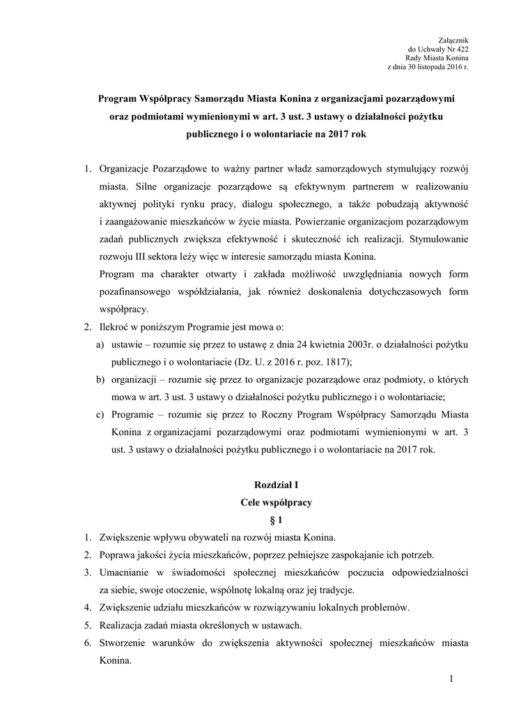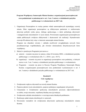Załącznik do Uchwały Nr 422 Rady Miasta Konina z dnia 30 listopada 2016 r. Program Współpracy Samorządu Miasta Konina z organizacjami pozarządowymi oraz podmiotami wymienionymi w art. 3 ust. 3 ustawy o działalności pożytku publicznego i o wolontariacie na 2017 rok 1. Organizacje Pozarządowe to ważny partner władz samorządowych stymulujący rozwój miasta. Silne organizacje pozarządowe są efektywnym partnerem w realizowaniu aktywnej polityki rynku pracy, dialogu społecznego, a także pobudzają aktywność i zaangażowanie mieszkańców w życie miasta. Powierzanie organizacjom pozarządowym zadań publicznych zwiększa efektywność i skuteczność ich realizacji. Stymulowanie rozwoju III sektora leży więc w interesie samorządu miasta Konina. Program ma charakter otwarty i zakłada możliwość uwzględniania nowych form pozafinansowego współdziałania, jak również doskonalenia dotychczasowych form współpracy. 2. Ilekroć w poniższym Programie jest mowa o: a) ustawie – rozumie się przez to ustawę z dnia 24 kwietnia 2003r. o działalności pożytku publicznego i o wolontariacie (Dz. U. z 2016 r. poz. 1817); b) organizacji – rozumie się przez to organizacje pozarządowe oraz podmioty, o których mowa w art. 3 ust. 3 ustawy o działalności pożytku publicznego i o wolontariacie; c) Programie – rozumie się przez to Roczny Program Współpracy Samorządu Miasta Konina z organizacjami pozarządowymi oraz podmiotami wymienionymi w art. 3 ust. 3 ustawy o działalności pożytku publicznego i o wolontariacie na 2017 rok. Rozdział I Cele współpracy §1 1. Zwiększenie wpływu obywateli na rozwój miasta Konina. 2. Poprawa jakości życia mieszkańców, poprzez pełniejsze zaspokajanie ich potrzeb. 3. Umacnianie w świadomości społecznej mieszkańców poczucia odpowiedzialności za siebie, swoje otoczenie, wspólnotę lokalną oraz jej tradycje. 4. Zwiększenie udziału mieszkańców w rozwiązywaniu lokalnych problemów. 5. Realizacja zadań miasta określonych w ustawach. 6. Stworzenie warunków do zwiększenia aktywności społecznej mieszkańców miasta Konina. 1 7. Prowadzenie efektywnych i spójnych działań na rzecz mieszkańców. 8. Uzupełnienie działań miasta w zakresie nieobjętym przez struktury samorządowe. 9. Określanie potrzeb społecznych i sposobu ich zaspokajania. 10. Stwarzanie warunków i struktur funkcjonujących na rzecz społeczności lokalnych. 11. Pomoc w pozyskiwaniu środków pochodzących z UE oraz innych źródeł zewnętrznych. 12. Prezentacja dorobku sektora i jego osiągnięć. 13. Promocja miasta Konina. Rozdział II Adresaci i realizatorzy Programu §2 Adresatami Programu są organizacje i osoby działające na rzecz społeczności lokalnej oraz beneficjenci Programu. §3 Realizatorami Programu są: 1) Rada Miasta Konina i jej komisje w zakresie wytyczania polityki społecznej i finansowania Miasta. 2) Prezydent Miasta Konina – w zakresie realizacji polityki współpracy, podejmowania współpracy z organizacjami, dysponowania środkami finansowymi w ramach budżetu, decydowania o przyznaniu dotacji i innych form pomocy. 3) Komisje konkursowe – w zakresie rozpatrywania i opiniowania ofert i wniosków, wpływających na otwarte konkursy ofert. 4) Jednostki organizacyjne Miasta Konina i Wydziały Urzędu Miejskiego w Koninie – w zakresie wspierania działalności organizacji. 5) Organizacje pozarządowe oraz inne podmioty wymienione w art. 3 ust. 3 ustawy o działalności pożytku publicznego i o wolontariacie. Realizacja szeregu zadań Miasta przez organizacje odbywać się będzie nie tylko w ramach niniejszego Programu, ale również w ramach innych szczegółowych programów: m.in. „Strategii Rozwoju Konina na lata 2015-2020”, „Programu Profilaktyki i Rozwiązywania Problemów Alkoholowych dla Miasta Konina na 2017 rok” oraz „Programu Przeciwdziałania Narkomanii dla Miasta Konina na lata 2016-2018”. 2 Rozdział III Zasady i formy współpracy §4 1. Współpraca Samorządu Miasta Konina z organizacjami pozarządowymi opiera się na zasadach określonych w wieloletnim programie współpracy Samorządu Miasta Konina z organizacjami pozarządowymi oraz podmiotami wymienionymi w art. 3 ust. 3 ustawy o działalności pożytku publicznego i o wolontariacie na lata 2015-2019 tj. zasadach pomocniczości, suwerenności, partnerstwa, efektywności, uczciwej konkurencji oraz jawności. 2. Miasto Konin zapewni wsparcie organizacjom poprzez: 1) diagnozowanie potrzeb społecznych mieszkańców Konina, 2) organizowanie szkoleń dla członków organizacji nt. możliwości korzystania z dofinansowania i zlecania organizacjom realizacji zadań publicznych oraz przygotowywania wniosków do instytucji krajowych i Unii Europejskiej, a także innych szkoleń, wzmacniających organizacje pozarządowe działające na rzecz mieszkańców i miasta Konina, 3) nawiązywanie i podtrzymywanie kontaktów międzynarodowych, w szczególności z organizacjami w miastach partnerskich, 4) współorganizowanie działań oraz wsparcie merytoryczne i logistyczne, 5) udostępnianie zainteresowanym materiałów informacyjno-edukacyjnych, 6) promocję działań organizacji, 7) użyczenie w ramach posiadanych, niewykorzystanych do innych celów nieruchomości będących w posiadaniu Miasta (zgodnie z Zarządzeniem Nr 51/2015 Prezydenta Miasta Konina z dnia 23 kwietnia 2015 roku w sprawie zasad najmu lokali użytkowych w budynkach wielolokalowych), 8) udostępnianie danych statystycznych i planistycznych Urzędu Miejskiego oraz jego jednostek organizacyjnych, 9) wspieranie w kultywowaniu tradycji organizacji, 10) wspieranie w zakresie pozyskiwania środków EFS przez tworzenie bazy danych instytucji, do których można aplikować o środki finansowe, 11) pośredniczenie w nawiązywaniu kontaktów i współpracy pomiędzy organizacjami i poszczególnymi wydziałami Urzędu Miejskiego, 12) udzielanie rekomendacji organizacjom współpracując