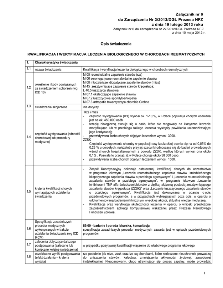 Załącznik nr 6 do Zarządzenia Nr 3/2013/DGL Prezesa NFZ z dnia 19 lutego 2013 roku Załącznik nr 6 do zarządzenia nr 27/2012/DGL Prezesa NFZ z dnia 10 maja 2012 r. Opis świadczenia KWALIFIKACJA I WERYFIKACJA LECZENIA BIOLOGICZNEGO W CHOROBACH REUMATYCZNYCH 1. Charakterystyka świadczenia 1.1 nazwa świadczenia 1.2 1.3 1.4 Kwalifikacja i weryfikacja leczenia biologicznego w chorobach reumatycznych M 05 reumatoidalne zapalenie stawów (rzs) M 06 seronegatywne reumatoidalne zapalenie stawów M 08 młodzieńcze idiopatyczne zapalenie stawów (mizs) określenie i kody powiązanych M 45 zesztywniające zapalenie stawów kręgosłupa; ze świadczeniem schorzeń (wg L 40.5 łuszczyca stawowa ICD 10) M 07.1 okaleczające zapalenie stawów M 07.2 łuszczycowa spondyloartropatia M 07.3 artropatia towarzysząca chorobie Crohna świadczenia skojarzone nie dotyczy Rzs i mizs - częstość występowania (rzs) wynosi ok. 1-1,5%, w Polsce populacja chorych oceniana jest na ok. 450.000 osób - terapię biologiczną stosuje się u osób, które nie reagowały na klasyczne leczenie modyfikujące lub w przebiegu takiego leczenia wystąpiły powikłania uniemożliwiające jego kontynuację częstość występowania jednostki - przewidywana liczba chorych objętych leczeniem wynosi 3000. chorobowej lub procedury ZZSK medycznej - Częstość występowania choroby w populacji rasy kaukaskiej ocenia się na od 0,05% do 0,23 % u dorosłych; należałoby przyjąć szacunki odnoszące się do badań prowadzonych wśród chorych hospitalizowanych z powodu ZZSK, według których wynosi ona około 0,1% . Pozwala to przyjąć, iż w Polsce choruje około 38 000 osób. - przewidywana liczba chorych objętych leczeniem wynosi 1500. - 1.5 kryteria kwalifikacji chorych wymagających udzielenia świadczenia - 1.6 1.7 1.8 Specyfikacja zasadniczych procedur medycznych wykonywanych w trakcie udzielania świadczenia (wg ICD 9 CM) zalecenia dotyczące dalszego postępowania (zalecane lub konieczne kolejne świadczenia) oczekiwane wyniki postępowania (efekt działania – kryteria wyjścia) Zespół Koordynacyjny dokonuje ostatecznej kwalifikacji chorych do uczestnictwa w programie lekowym „Leczenie reumatoidalnego zapalenia stawów i młodzieńczego idiopatycznego zapalenia stawów o przebiegu agresywnym” i „Leczenie reumatoidalnego zapalenia stawów o przebiegu agresywnym”, w programie lekowym „Leczenie inhibitorami TNF alfa świadczeniobiorców z ciężką, aktywną postacią zesztywniającego zapalenia stawów kręgosłupa (ZZSK)” oraz „Leczenie łuszczycowego zapalenia stawów o przebiegu agresywnym”. Kwalifikacja jest dokonywana w oparciu o opis przedmiotowych programów, a w przypadkach wybiegających poza opis, w oparciu o udokumentowaną badaniami klinicznymi wysokiej jakości, aktualną wiedzę medyczną. Kwalifikacja oraz weryfikacja skuteczności leczenia w oparciu o wnioski przedłożone za pośrednictwem aplikacji komputerowej wskazanej przez Prezesa Narodowego Funduszu Zdrowia. 89.00 - badanie i porada lekarska, konsultacja specyfikacja zasadniczych procedur medycznych zawarta jest w opisach przedmiotowych programów. w przypadku pozytywnej kwalifikacji włączenie do właściwego programu lekowego rzs podobnie jak mizs, zzsk oraz łzs są chorobami, które nieleczone nieuchronnie prowadzą do zniszczenia stawów, kalectwa, zmniejszenia aktywności życiowej, zawodowej i intelektualnej. Nieopanowany, długo utrzymujący się proces zapalny, może prowadzić 1 1.9 2. 2.1 2.2 ryzyka powikłań postępowania medycznego i częstość ich występowania Warunki wykonania - została określona w opisach programów : „Leczenie reumatoidalnego zapalenia stawów i młodzieńczego idiopatycznego zapalenia stawów o przebiegu agresywnym” „Leczenie reumatoidalnego zapalenia stawów o przebiegu agresywnym” „Leczenie inhibitorami TNF alfa świadczeniobiorców z ciężką, aktywną postacią zesztywniającego zapalenia stawów kręgosłupa (ZZSK)” „Leczenie łuszczycowego zapalenia stawów o przebiegu agresywnym” zakres oczekiwanych informacji na podstawie wykonanych badań diagnostycznych - uniknięcie trwałego kalectwa na skutek nieodwracalnego zniszczenia stawów w przypadku wystąpienia zmian narządowych – przedłużenie czasu przeżycia oraz poprawa jego jakości zgodnie z kryteriami opisanymi w programach: „Leczenie reumatoidalnego zapalenia stawów i młodzieńczego idiopatycznego zapalenia stawów o przebiegu agresywnym”, „Leczenie reumatoidalnego zapalenia stawów o przebiegu agresywnym”, „Leczenie inhibitorami TNF alfa świadczeniobiorców z ciężką, aktywną postacią zesztywniającego zapalenia stawów kręgosłupa (ZZSK)”, „Leczenie łuszczycowego zapalenia stawów o przebiegu agresywnym” specyfikacja i liczba badań diagnostycznych, niezbędnych dla wykonania świadczenia 2.3 średni czas udzielania świadczenia 2.4 sprzęt i aparatura medyczna 2.5 2.6 2.7 2.8 3. 3.1 3.2 4. również do niebezpiecznych dla życia zmian narządowych (amyloidoza, zapalenie naczyń, niewydolność nerek). Dlatego też u takich osób nastąpi stopniowa i nieodwracalna degradacja socjalna leki biologiczne są dostępne na rynku dopiero od kilku lat, dlatego nie są znane odległe skutki uboczne, jednak dotychczas zgromadzone dane pozwalają sądzić, że stosowanie ich powoduje mniej objawów ubocznych w porównaniu z lekami klasycznymi - program archiwizacji danych pacjenta w systemie komputerowym (nadzór nad prowadzonym rejestrem zgodnym z wymaganiami programu) Ośrodek będący realizatorem przedmiotowego świadczenia musi zapewnić warunki do realizacji następujących zadań Zespołu Koordynacyjnego: - nadzorowanie zgłaszalności przez poszczególne ośrodki chorych do leczenia, - nadzorowanie procesu diagnostycznego prowadzonego przez poszczególne ośrodki tak, aby od chwili kwalifikacji do zastosowania leczenia upłynął możliwie najkrótszy okres czasu, - zapewnienie