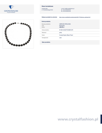 Powered by TCPDF (www.tcpdf.org) Dane kontaktowe Łódź 90-349 ul. Tymienieckiego 22/24 Zobacz produkt na stronie: e-mail: [email protected] tel. +48 42 648 05 60 fax +48 42 648 05 80 https://www.crystalfashion.pl/pl/produkt/65/1773/obroza_perlowa.html Karta produktu Nazwa produktu: Typ: Cena: OBROŻA PERŁOWA Naszyjniki 236.00 zł Kod produktu: W-5810/335/P/N/MM10/R Materiał: perły Kolor: Crystal Mystic Black Pearl Dostępność: Jest Opis produktu